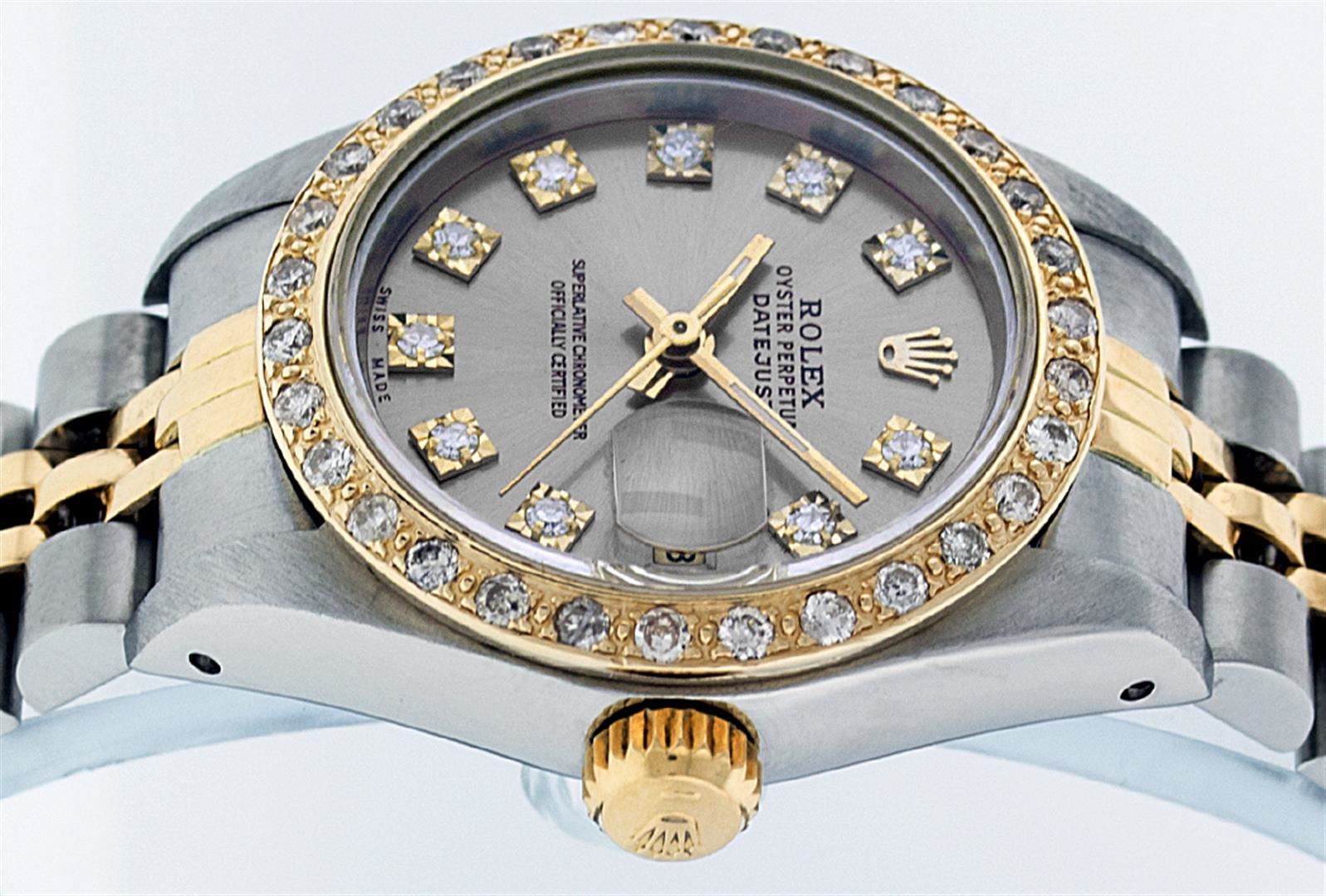 One Ladies Two Tone Rolex Datejust Polished, Serviced & Electronically Tested, 14K Yellow Gold & Stainless Steel Case:26mm, 14K Yellow Gold Crown, Custom Bezel: 18K Yellow Gold Beadset Diamond Bezel, Diamond Count: 32 Diamonds. Total Weight .70 Carat, Clarity: Si-VS, Color: G to H. Custom Crystal: Synthetic Sapphire Cyclops Lens. Movement: Automatic Winding Movement Caliber 2030. Custom Dial: Slate Grey Single Cut VS Diamond Dial. Stone Count: 10 Diamonds In Dial, Clarity: VS, Color: G to H. Date Window: 3 O'Clock Position Date Display, Model: Datejust. Condition: G-6 Extra Fine. Bracelet: Two Tone 14K Yellow Gold & Stainless Steel Jubilee Band. Bright Polish. 6.0 Inch Length, Adjustable. Standard Clasp, With Rolex Logo.