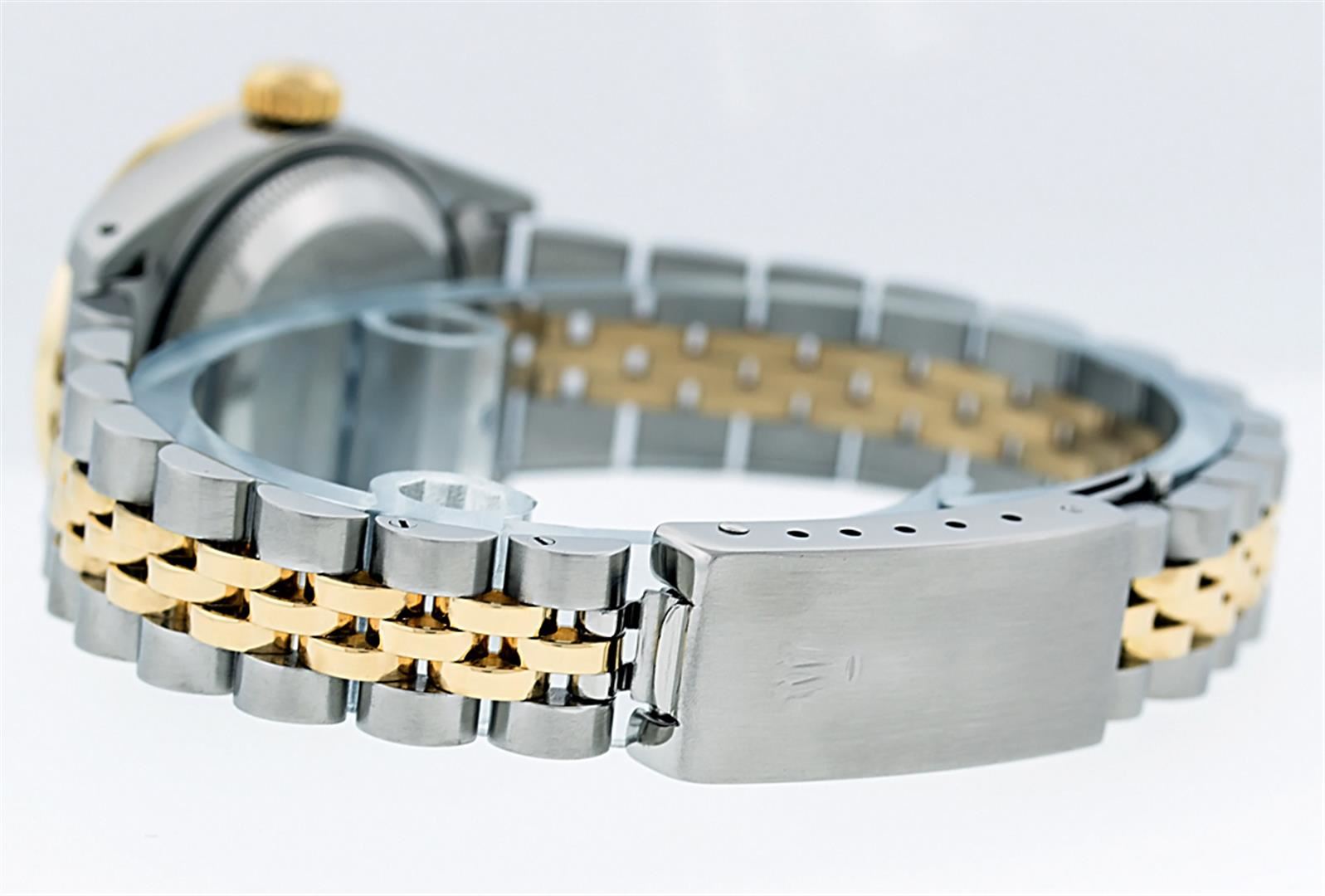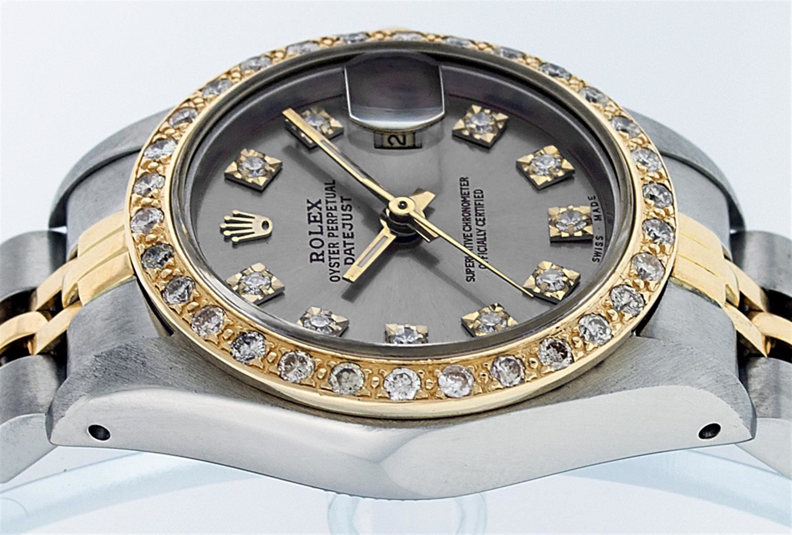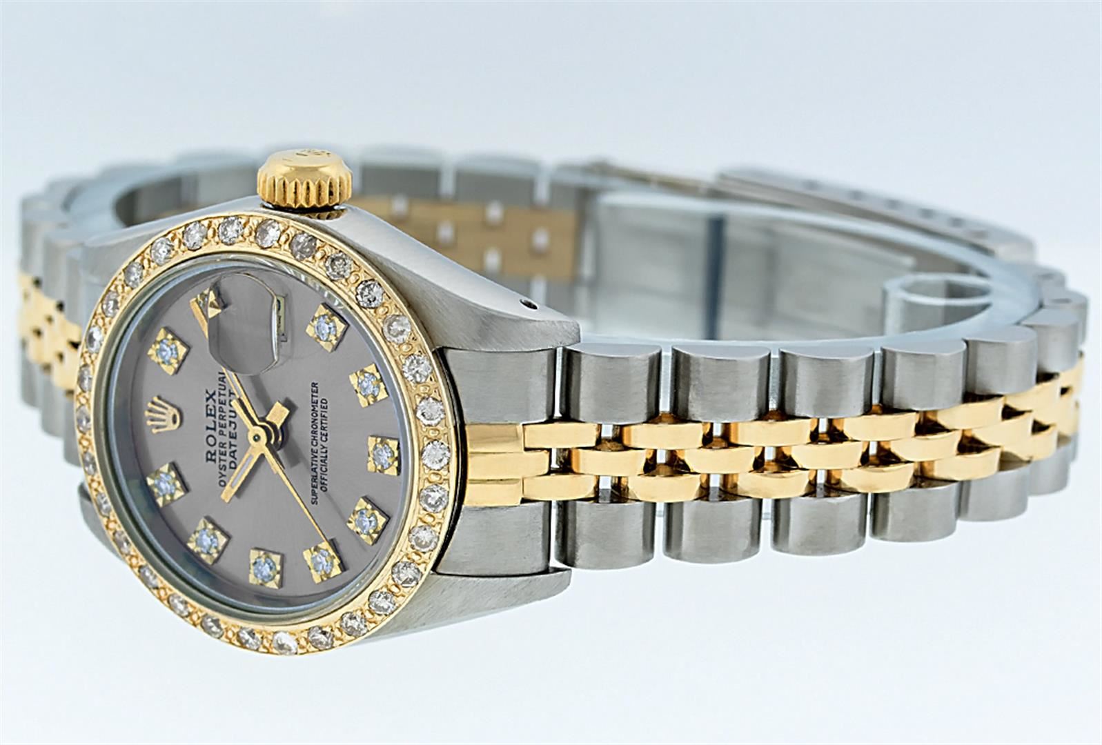One Ladies Two Tone Rolex Datejust Polished, Serviced & Electronically Tested, 14K Yellow Gold & Stainless Steel Case:26mm, 14K Yellow Gold Crown, Custom Bezel: 18K Yellow Gold Beadset Diamond Bezel, Diamond Count: 32 Diamonds. Total Weight .70 Carat, Clarity: Si-VS, Color: G to H. Custom Crystal: Synthetic Sapphire Cyclops Lens. Movement: Automatic Winding Movement Caliber 2030. Custom Dial: Slate Grey Single Cut VS Diamond Dial. Stone Count: 10 Diamonds In Dial, Clarity: VS, Color: G to H. Date Window: 3 O'Clock Position Date Display, Model: Datejust. Condition: G-6 Extra Fine. Bracelet: Two Tone 14K Yellow Gold & Stainless Steel Jubilee Band. Bright Polish. 6.0 Inch Length, Adjustable. Standard Clasp, With Rolex Logo.