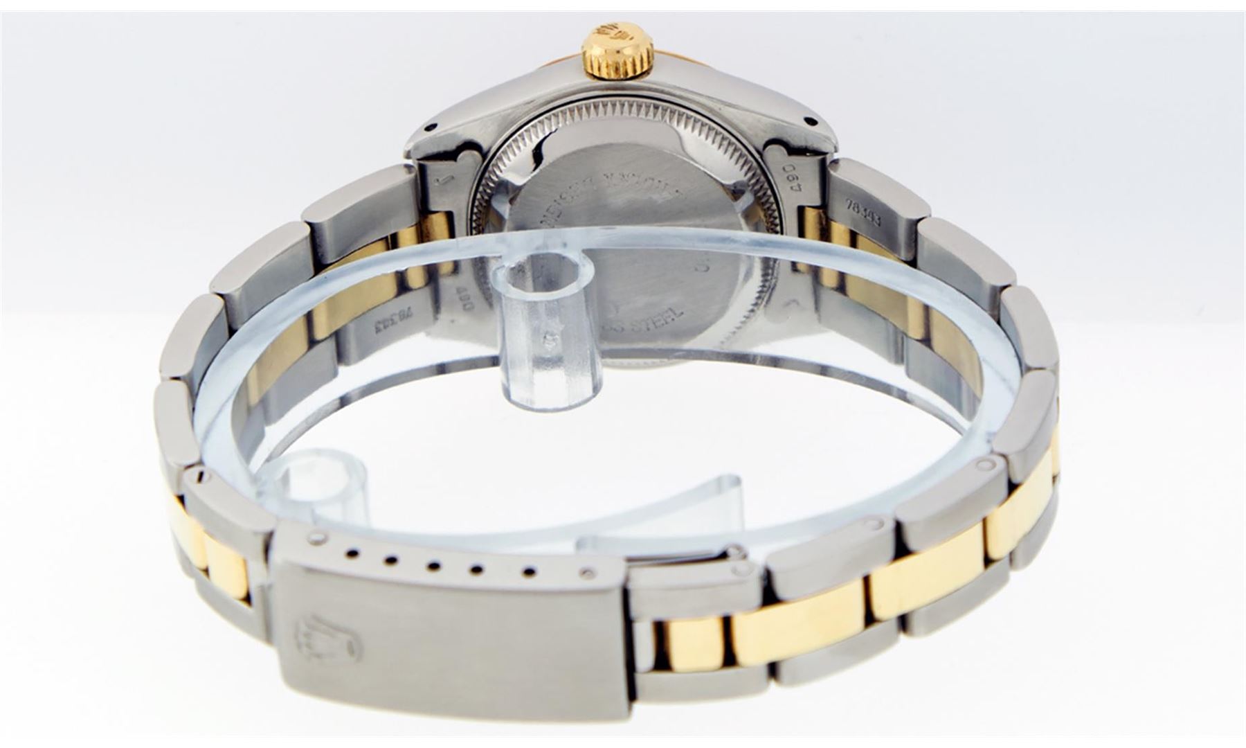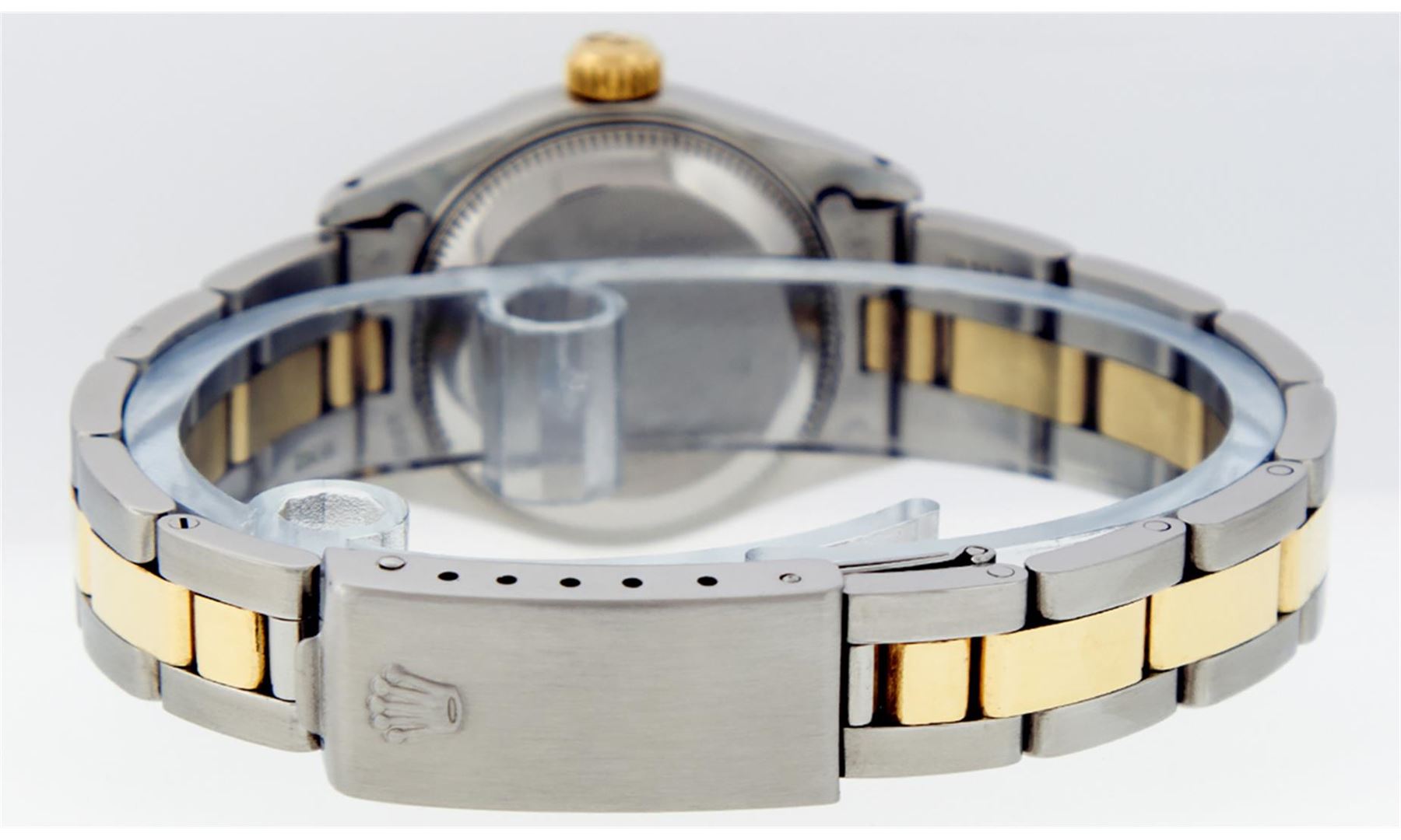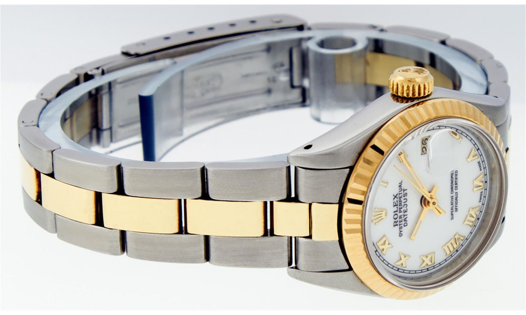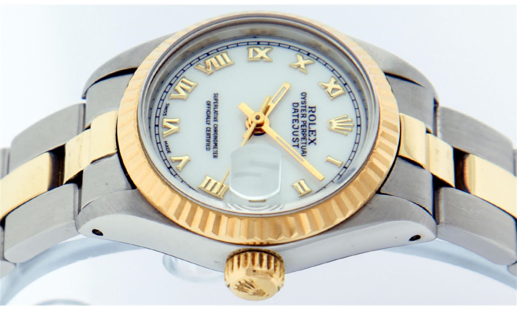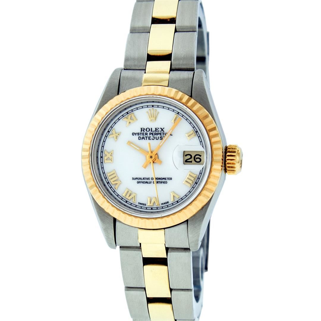 One Ladies Pre Owned 14K Yellow Gold & Stainless Steel Two Tone Rolex Polished, Serviced & Electronically Tested, Rolex Yellow Gold & Stainless Steel Case: 26mm, Rolex Yellow Gold Crown, Rolex Bezel: 14K Yellow Gold Fluted Bezel. Custom Crystal: New Plexiglass With Magnified Date Window. Custom Hands: New Luminescent Hands. Rolex Movement: Automatic Winding Movement 2030. Rolex Dial: White Roman With Square Track. Date Window: 3 O'Clock Position Date Display, Model: Datejust. Condition: G-6 Extra Fine. Rolex Bracelet: Two Tone 14K Yellow Gold & Stainless Steel Oyster Band. Bright Polish. 6.0 Inch Length, Adjustable. Standard Clasp, With Rolex Logo. This Watch Has Been Serviced Time Tested And Is In Excellent Condition It Is Free Of All Scratches And Dents.