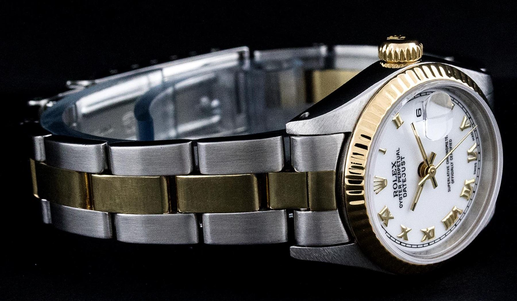 One Ladies Pre Owned 14K Yellow Gold & Stainless Steel Two Tone Rolex Polished, Serviced & Electronically Tested, Rolex Yellow Gold & Stainless Steel Case: 26mm, Rolex Yellow Gold Crown, Rolex Bezel: 14K Yellow Gold Fluted Bezel. Custom Crystal: New Plexiglass With Magnified Date Window. Custom Hands: New Luminescent Hands. Rolex Movement: Automatic Winding Movement 2030. Rolex Dial: White Roman With Square Track. Date Window: 3 O'Clock Position Date Display, Model: Datejust. Condition: G-6 Extra Fine. Rolex Bracelet: Two Tone 14K Yellow Gold & Stainless Steel Oyster Band. Bright Polish. 6.0 Inch Length, Adjustable. Standard Clasp, With Rolex Logo. This Watch Has Been Serviced Time Tested And Is In Excellent Condition It Is Free Of All Scratches And Dents.