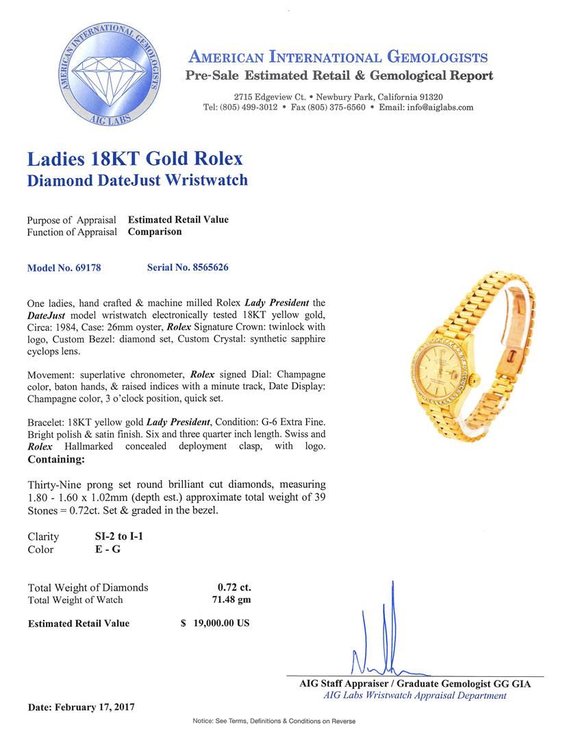 One ladies hand crafted & machine milled Rolex Lady President the DateJust model wristwatch electronically tested 18KT yellow gold, Circa: 1984, Case: 26mm oyster, Rolex Signature Crown: twinlock with logo, Custom Bezel: diamond set, Custom Crystal: synthetic sapphire cyclops lens.Movement: superlative chronometer, Rolex signed Dial: Champagne color, baton hands, & raised indices with a minute track, Date Display: Champagne color, 3 o'clock position, quick set.Bracelet: 18KT yellow gold Lady President, Condition: G-6 Extra Fine. Bright polish & satin finish. Six and three quarter inch length. Swiss and Rolex Hallmarked concealed deployment clasp, with logo. Containing: Thirty-Nine prong set round brilliant cut diamonds, measuring 1.80 - 1.60 x 1.02mm (depth est.) approximate total weight of 39 Stones = 0.72ct. Set & graded in the bezel. Clarity: SI-2 to I-1 Color E - G. Total Weight of Diamonds 0.72ct. Total Weight of Watch 71.48gm. AIG Appraised at $19,000.00.