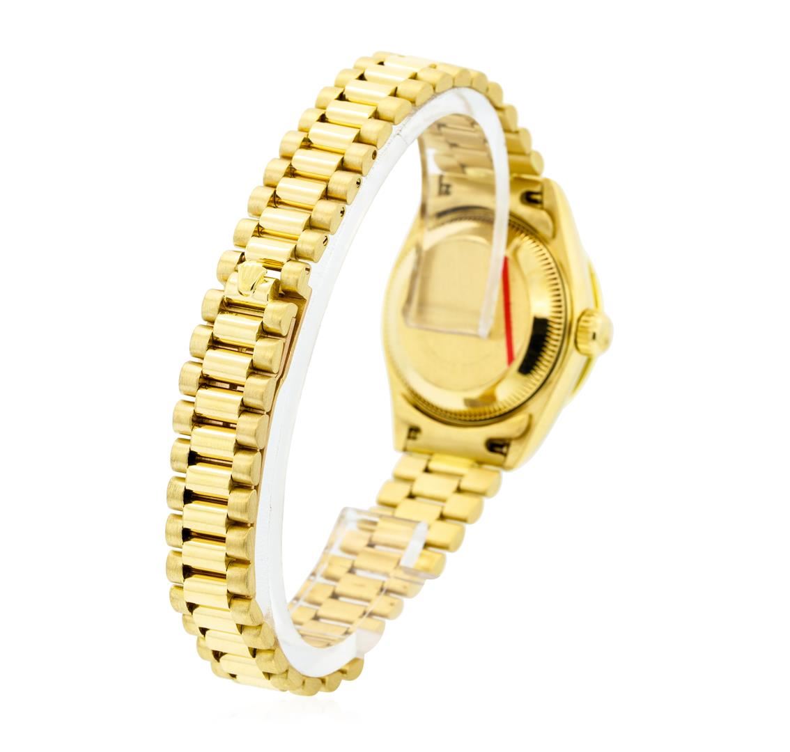One ladies hand crafted & machine milled Rolex Lady President the DateJust model wristwatch electronically tested 18KT yellow gold, Circa: 1984, Case: 26mm oyster, Rolex Signature Crown: twinlock with logo, Custom Bezel: diamond set, Custom Crystal: synthetic sapphire cyclops lens.Movement: superlative chronometer, Rolex signed Dial: Champagne color, baton hands, & raised indices with a minute track, Date Display: Champagne color, 3 o'clock position, quick set.Bracelet: 18KT yellow gold Lady President, Condition: G-6 Extra Fine. Bright polish & satin finish. Six and three quarter inch length. Swiss and Rolex Hallmarked concealed deployment clasp, with logo. Containing: Thirty-Nine prong set round brilliant cut diamonds, measuring 1.80 - 1.60 x 1.02mm (depth est.) approximate total weight of 39 Stones = 0.72ct. Set & graded in the bezel. Clarity: SI-2 to I-1 Color E - G. Total Weight of Diamonds 0.72ct. Total Weight of Watch 71.48gm. AIG Appraised at $19,000.00.