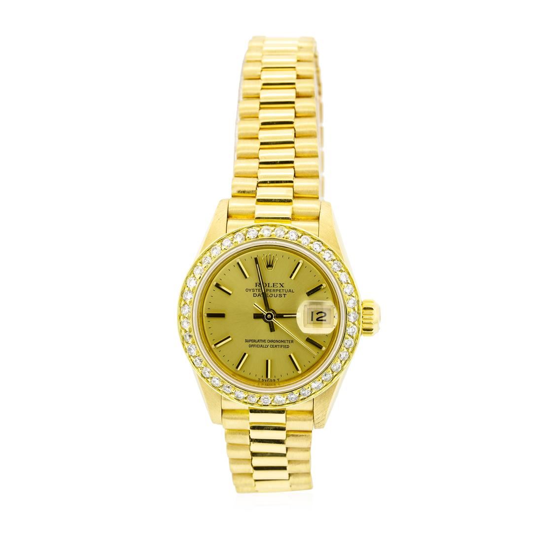 One ladies hand crafted & machine milled Rolex Lady President the DateJust model wristwatch electronically tested 18KT yellow gold, Circa: 1984, Case: 26mm oyster, Rolex Signature Crown: twinlock with logo, Custom Bezel: diamond set, Custom Crystal: synthetic sapphire cyclops lens.Movement: superlative chronometer, Rolex signed Dial: Champagne color, baton hands, & raised indices with a minute track, Date Display: Champagne color, 3 o'clock position, quick set.Bracelet: 18KT yellow gold Lady President, Condition: G-6 Extra Fine. Bright polish & satin finish. Six and three quarter inch length. Swiss and Rolex Hallmarked concealed deployment clasp, with logo. Containing: Thirty-Nine prong set round brilliant cut diamonds, measuring 1.80 - 1.60 x 1.02mm (depth est.) approximate total weight of 39 Stones = 0.72ct. Set & graded in the bezel. Clarity: SI-2 to I-1 Color E - G. Total Weight of Diamonds 0.72ct. Total Weight of Watch 71.48gm. AIG Appraised at $19,000.00.