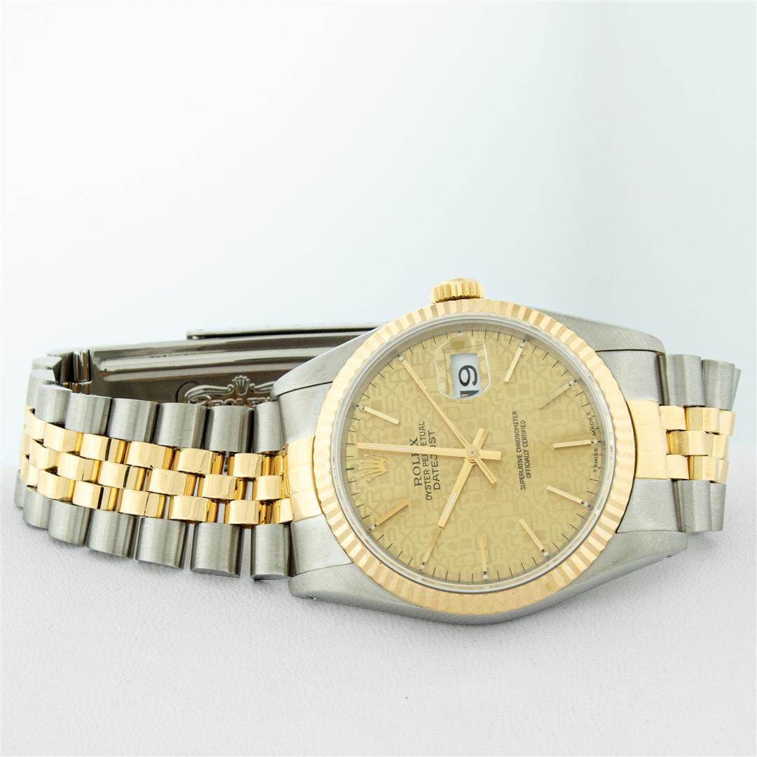 One Mens Rolex Two Tone 18K Yellow Gold And Stainless Steel Datejust Polished, Serviced & Electronically Tested, Yellow Gold & Stainless Steel Case: 36mm, 18K Yellow Gold Crown, Rolex Bezel: 18K Yellow Gold Fluted Bezel. Crystal: Sapphire With Magnified Date Window. Custom Hands: New Luminescent Hands. Rolex Movement: Automatic Winding Movement 3135. Rolex Dial: Champagne Jubilee Dial With Index Hour Markers and Track With Lumi Dots. Date Window: 3 O'Clock Position Date Display, Quickset, Model: Datejust. Condition: G-6 Extra Fine. Rolex Bracelet: Two Tone 18K Yellow Gold & Stainless Steel Jubilee Band. Bright Polish. 7.0 Inch Length, Adjustable. Standard Clasp, With Rolex Logo. This Watch Has Been Serviced Time Tested And Is In Excellent Condition It Is Free Of All Scratches And Dents.