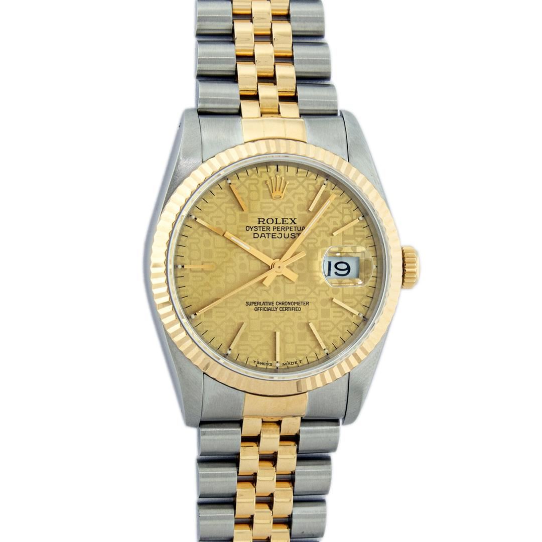 One Mens Rolex Two Tone 18K Yellow Gold And Stainless Steel Datejust Polished, Serviced & Electronically Tested, Yellow Gold & Stainless Steel Case: 36mm, 18K Yellow Gold Crown, Rolex Bezel: 18K Yellow Gold Fluted Bezel. Crystal: Sapphire With Magnified Date Window. Custom Hands: New Luminescent Hands. Rolex Movement: Automatic Winding Movement 3135. Rolex Dial: Champagne Jubilee Dial With Index Hour Markers and Track With Lumi Dots. Date Window: 3 O'Clock Position Date Display, Quickset, Model: Datejust. Condition: G-6 Extra Fine. Rolex Bracelet: Two Tone 18K Yellow Gold & Stainless Steel Jubilee Band. Bright Polish. 7.0 Inch Length, Adjustable. Standard Clasp, With Rolex Logo. This Watch Has Been Serviced Time Tested And Is In Excellent Condition It Is Free Of All Scratches And Dents.
