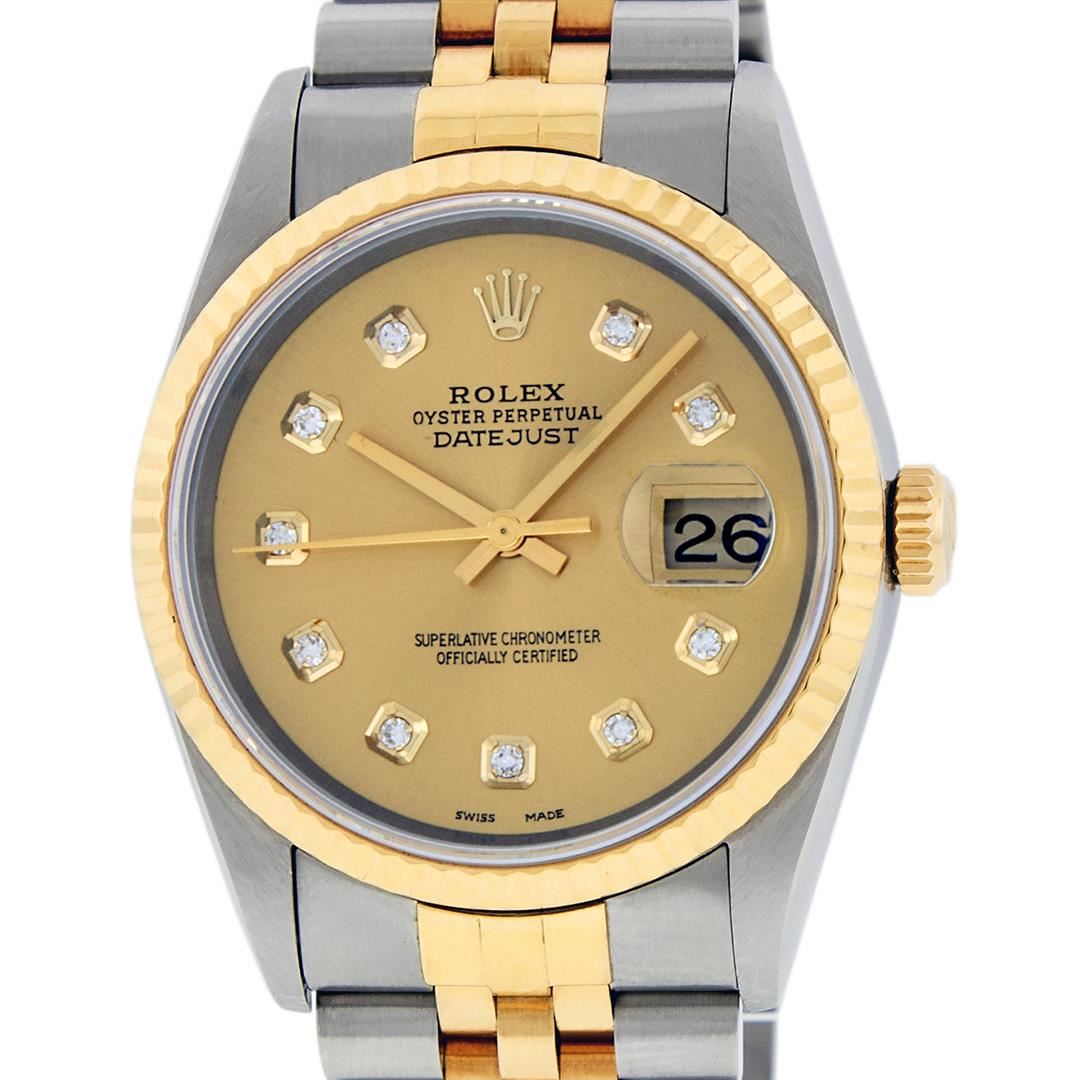 One Gents 18K Yellow Gold Two Tone Rolex Datejust Polished, Serviced & Electronically Tested Watch, 18K Yellow Gold & Stainless Steel Case Size:36mm. Bezel: 18K Yellow Gold Fluted Bezel. Custom Crystal: Synthetic Sapphire Cyclops Lens. Movement: Automatic Winding Movement Caliber 3135. Custom Dial: Champagne Diamond Dial, Diamond Count: 10 Diamonds In Dial, Color: G To H, Clarity: SI-VS, Date Window: 3 O'Clock Position Date Display, Quickset, Model: 16233 Condition: G-6 Extra Fine The Watch Is In Very Good Condition Free Of All Scratches And Dents. Bracelet:Two Tone 18K Yellow Gold & Stainless Steel Jubilee Band. Bright Polish. 7.0 Inch Length, Adjustable. Standard Clasp, With Rolex Logo.
