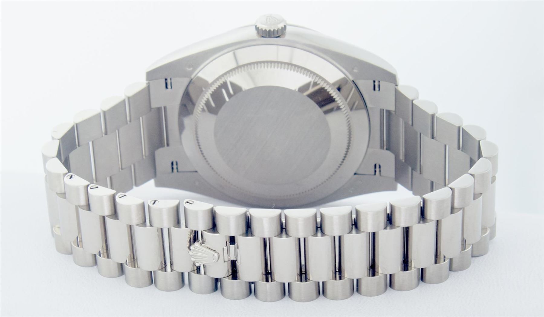 One Mens Quickset Rolex Day Date 18K White Gold President Polished, Serviced & Electronically Tested, Rolex 18K White Gold Case: 40mm, Rolex 18K White Gold Crown, Rolex Bezel: 18K White Gold Fluted Bezel. Crystal: Sapphire With Magnified Date Window. Hands: Solid Hands. Rolex Movement: Automatic Quickset Winding Movement Caliber 3255. Rolex Dial: Olive Green Roman Dial With Square Track. Date Window: 3 O'Clock Position, Day Display: 12 O'Clock Position, Double Quickset, Model: Day Date Quickset President. Condition: G-6 Extra Fine. Rolex Bracelet: 18K White Gold President Band With Hidden Clasp, Bright & Satin Polish. 7.5 Inch Length, Standard Hidden President Clasp, With Rolex Logo. This Pre Owned Watch Has Been Serviced Time Tested And Is In Excellent Condition It Is Free Of All Scratches And Dents. This Watch Comes With Box And Papers.