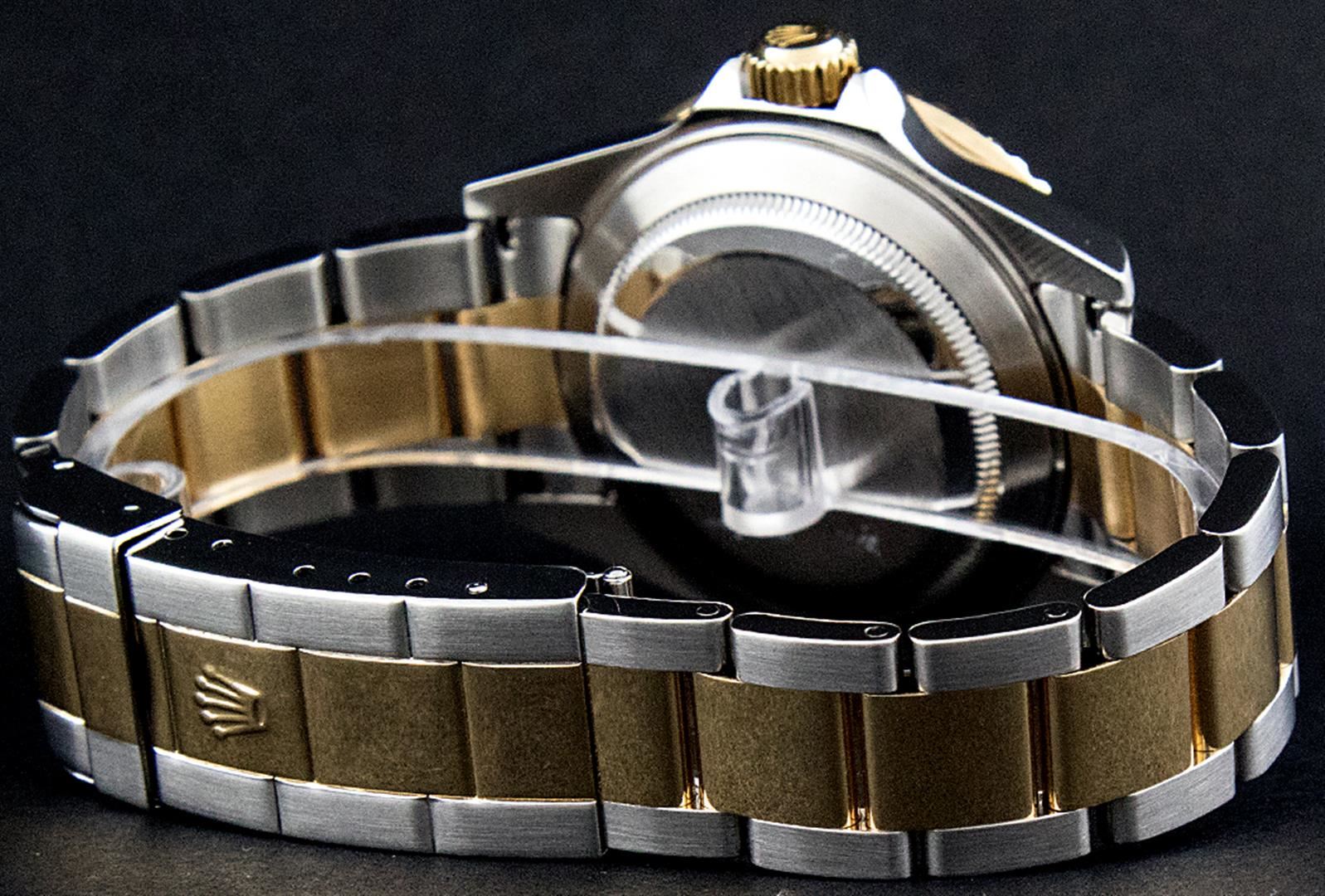 One Mens Pre Owned Rolex 18K Yellow Gold And Stainless Steel Two Tone Submariner With Date Polished, Serviced & Electronically Tested, Rolex Stainless Steel Case: 40mm, Rolex Yellow Gold Crown, Rolex Bezel: Yellow Gold Rotatable Bezel With Blue Insert. Crystal: Sapphire With Magnified Date Window Lens. Rolex Movement: Automatic Winding Movement Caliber 3135. Rolex Dial: Rolex Blue Submariner Dial with Luminous Index Hour Markers, Date Window: 3 O'Clock Position Date Display, Model: Submariner, Quickset, Condition: G-6 Extra Fine. Rolex Bracelet: Stainless Steel and Yellow Gold Oyster Band With Gold Through The Buckle. Bright Polish & Satin Finish. 7.0 Inch Length, Adjustable. Standard Yellow Gold Clasp, With Rolex Logo.