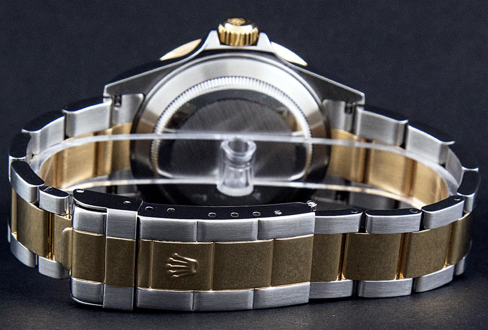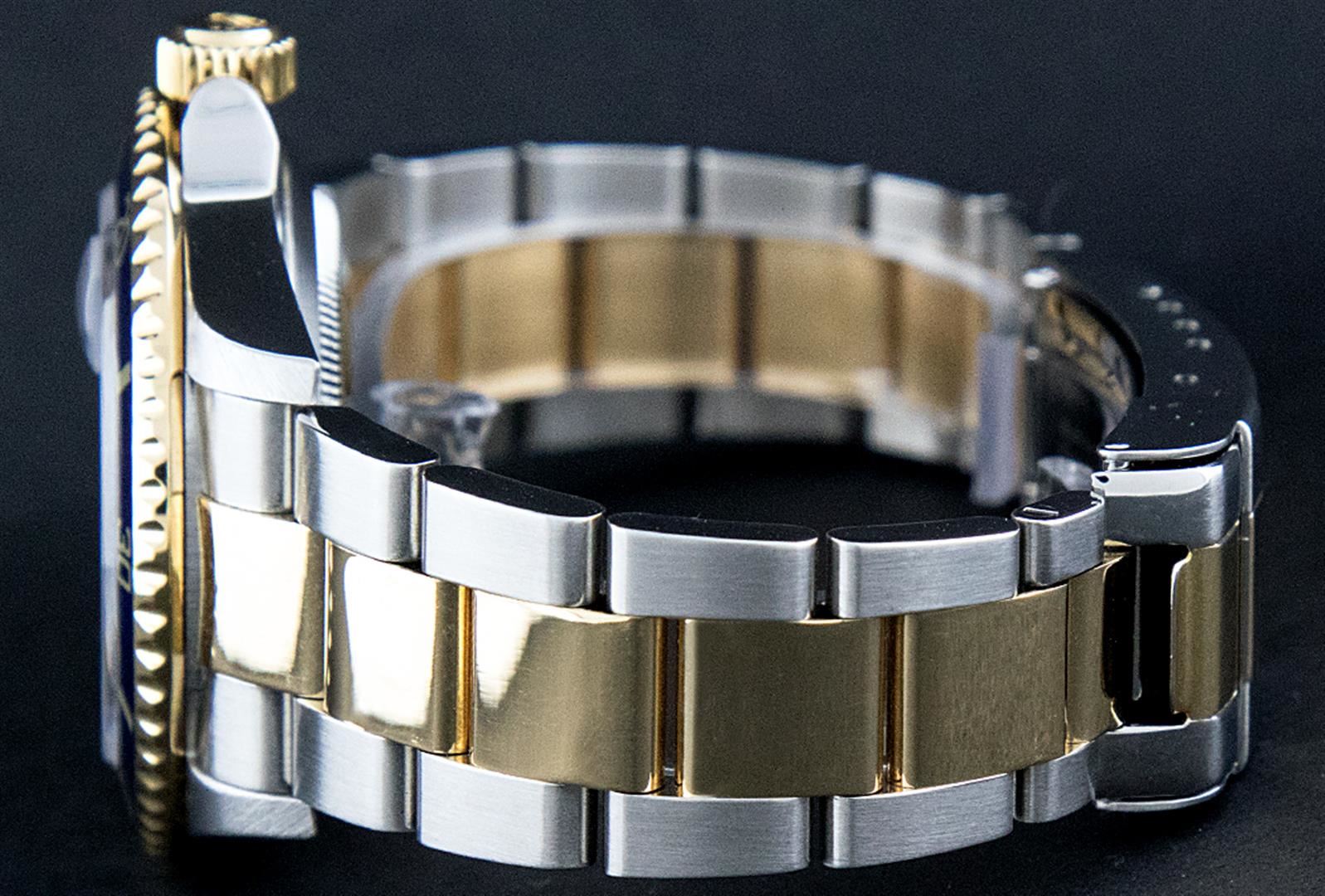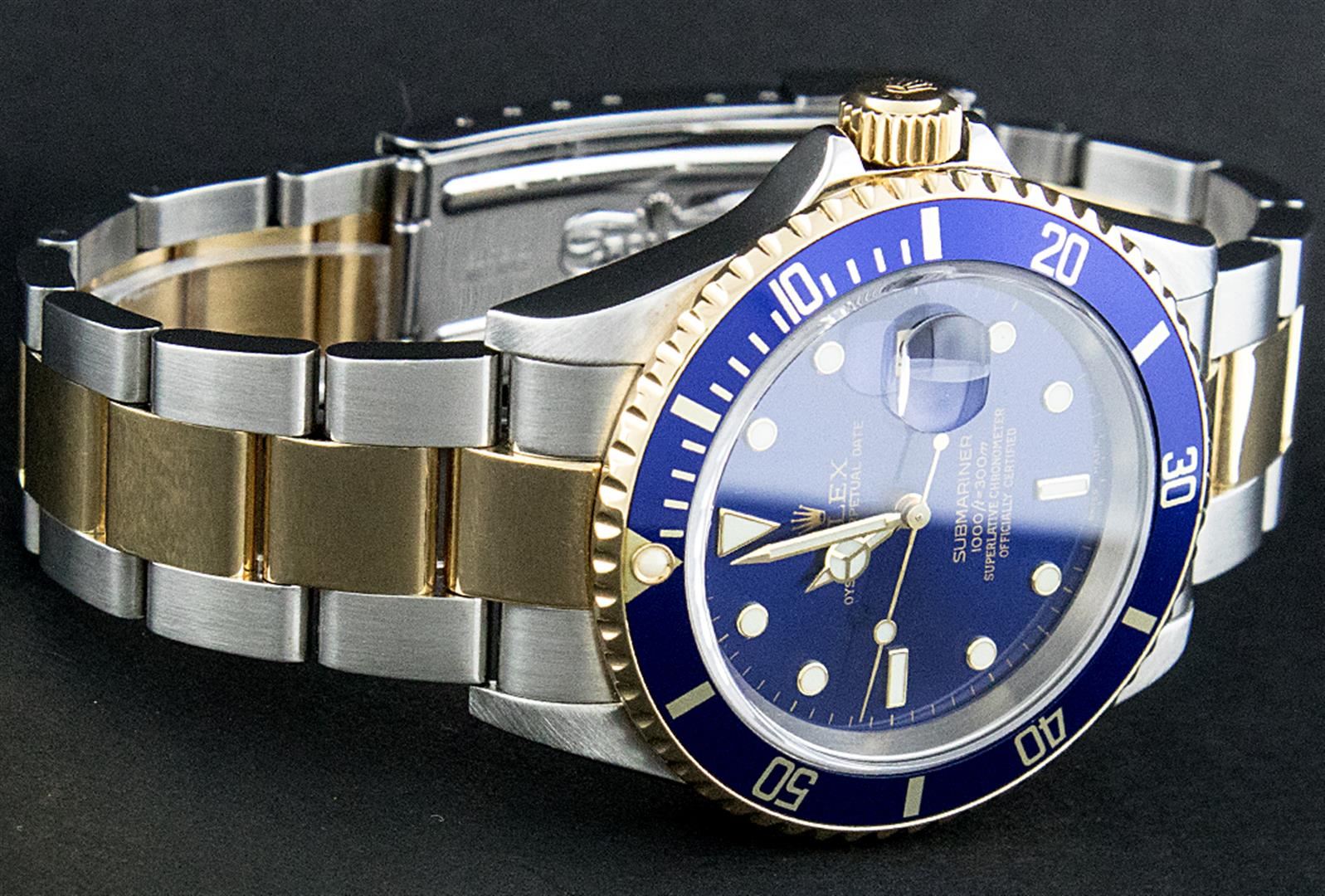 One Mens Pre Owned Rolex 18K Yellow Gold And Stainless Steel Two Tone Submariner With Date Polished, Serviced & Electronically Tested, Rolex Stainless Steel Case: 40mm, Rolex Yellow Gold Crown, Rolex Bezel: Yellow Gold Rotatable Bezel With Blue Insert. Crystal: Sapphire With Magnified Date Window Lens. Rolex Movement: Automatic Winding Movement Caliber 3135. Rolex Dial: Rolex Blue Submariner Dial with Luminous Index Hour Markers, Date Window: 3 O'Clock Position Date Display, Model: Submariner, Quickset, Condition: G-6 Extra Fine. Rolex Bracelet: Stainless Steel and Yellow Gold Oyster Band With Gold Through The Buckle. Bright Polish & Satin Finish. 7.0 Inch Length, Adjustable. Standard Yellow Gold Clasp, With Rolex Logo.