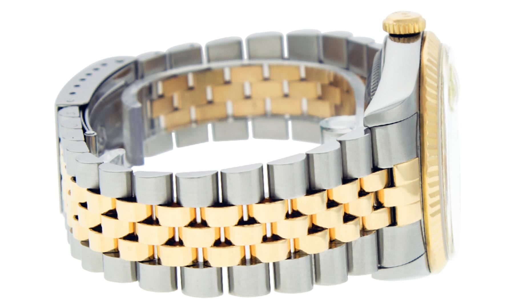 One Mens Rolex Two Tone 18K Yellow Gold And Stainless Steel Datejust Polished, Serviced & Electronically Tested, Yellow Gold & Stainless Steel Case: 36mm, 18K Yellow Gold Crown, Rolex Bezel: 18K Yellow Gold Fluted Bezel. Crystal: Sapphire With Magnified Date Window. Hands: Luminescent Hands. Rolex Movement: Automatic Winding Movement 3135. Rolex Dial: Champagne Dial With Index Hour Markers and Track With Lumi Dots. Date Window: 3 O'Clock Position Date Display, Quickset, Model: Datejust. Condition: G-6 Extra Fine. Rolex Bracelet: Two Tone 18K Yellow Gold & Stainless Steel Jubilee Band. Bright Polish. 7.0 Inch Length, Adjustable. Standard Clasp, With Rolex Logo. This Watch Has Been Serviced Time Tested And Is In Excellent Condition It Is Free Of All Scratches And Dents.