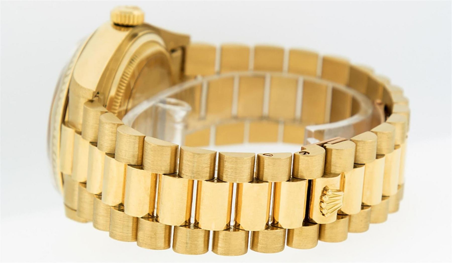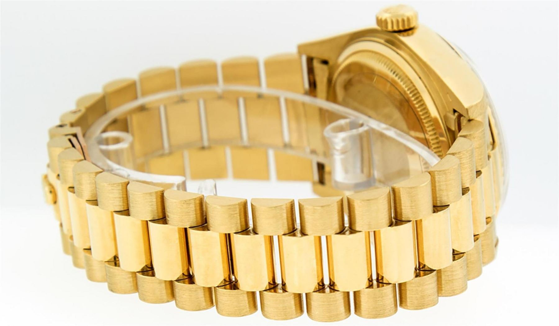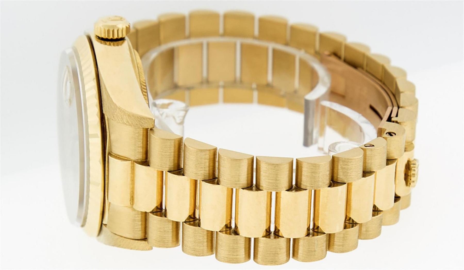 One Mens Pre Owned Quickset Rolex Day Date 18K Yellow Gold President Polished, Serviced & Electronically Tested, Rolex 18K Yellow Gold Case: 36mm, Rolex 18K Yellow Gold Crown, Rolex Bezel: 18K Yellow Gold Fluted Bezel. Custom Crystal: New Scratch Resistant Synthetic Sapphire Cyclops Lens. Custom Hands: New Luminescent Hands. Rolex Movement: Automatic Quickset Winding Movement Caliber 3055. Custom Dial: Refinished To Blue Vignette With Custom Added Genuine Single Cut Diamonds Track. Date Window: 3 O'Clock Position, Day Display: 12 O'Clock Position, Single Quickset, Model: Day Date President. Condition: G-6 Extra Fine. Bracelet: Rolex 18K Yellow Gold President Band With Hidden Clasp, Bright & Satin Polish. 6.75 Inch Length, Standard President Clasp, With Rolex Logo.