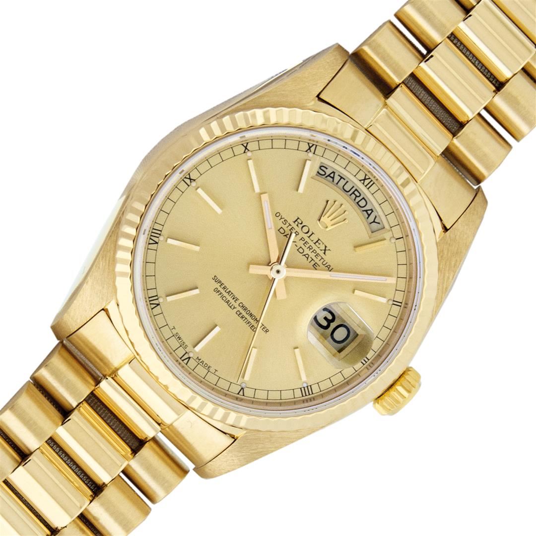 One Mens Quickset Pre Owned Rolex Day Date 18K Yellow Gold President Polished, Serviced & Electronically Tested, Rolex 18K Yellow Gold Case: 36mm, Rolex 18K Yellow Gold Crown, Rolex Bezel: 18K Yellow Gold Fluted Bezel. Crystal: Sapphire With Magnified Date Window. Rolex Movement: Automatic Quickset Winding Movement Caliber 3055. Rolex Dial: Champagne Index With Roman Track & Lumi Dots. Date Window: 3 O'Clock Position, Day Display: 12 O'Clock Position, Single Quickset, Model: Day Date President. Condition: G-6 Extra Fine. Rolex Bracelet: 18K Yellow Gold President Band With Hidden Clasp, Bright & Satin Polish. 7.0 Inch Length, Standard President Clasp, With Rolex Logo. This Watch Has Been Serviced And Polished It Is Free Of All Scratches And Dents. This Watch Comes With A Rolex Box.