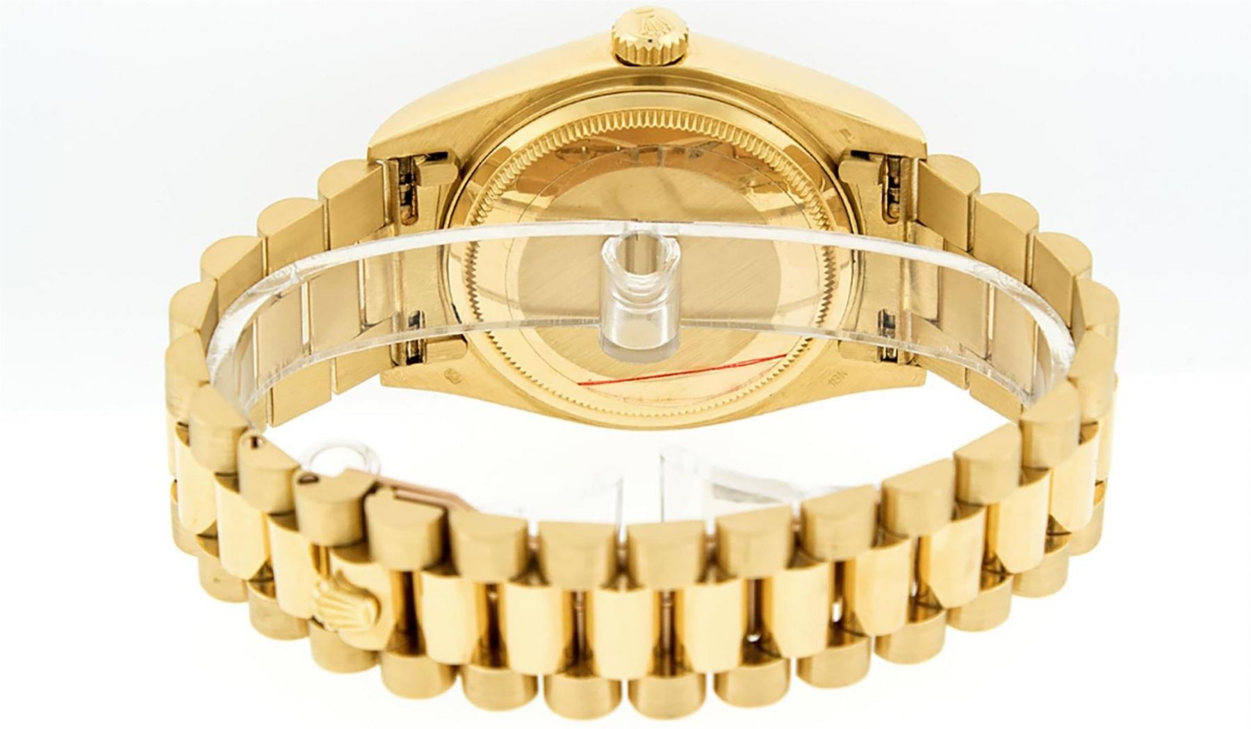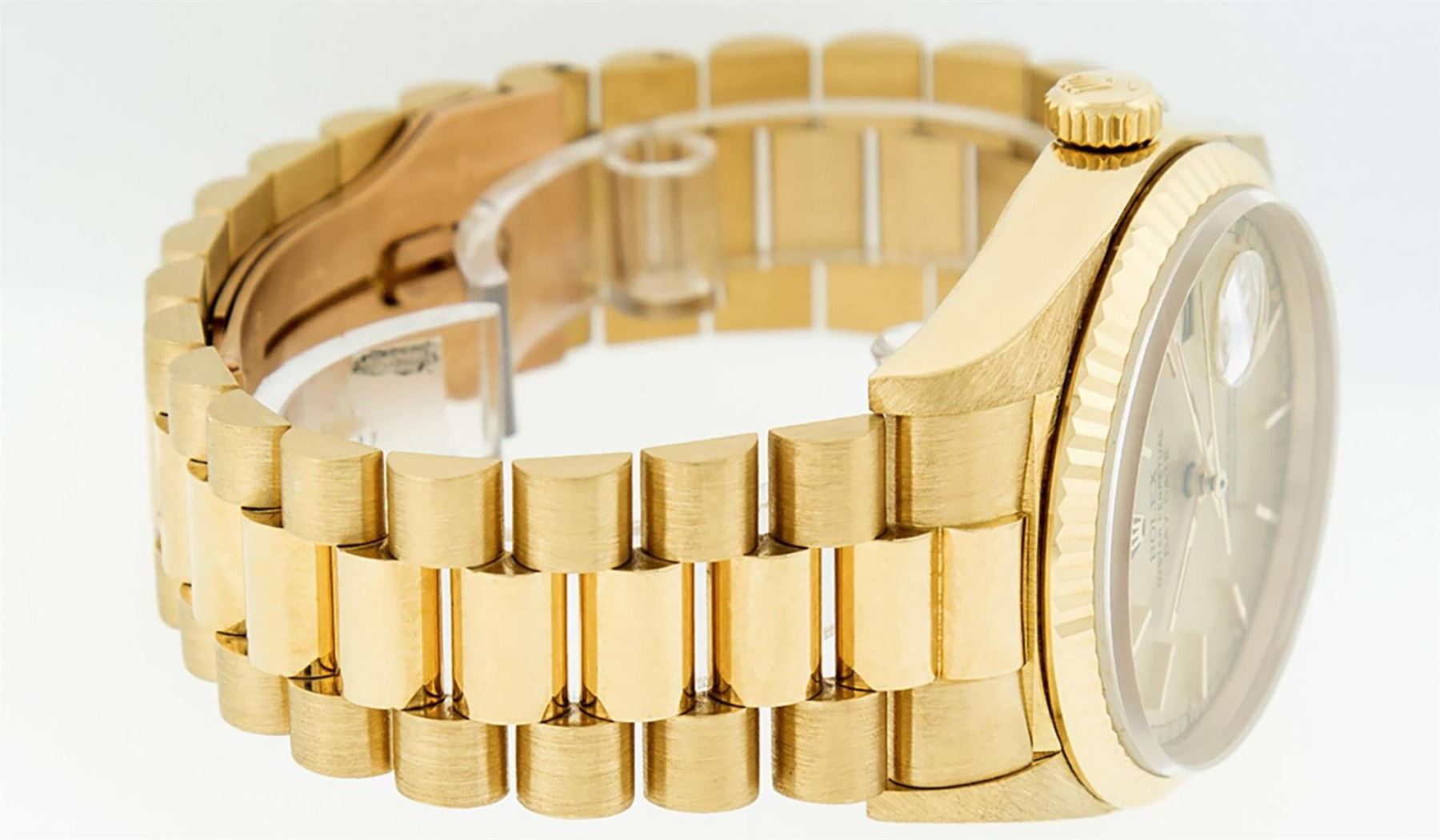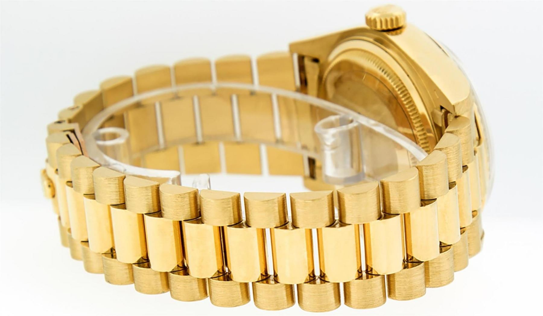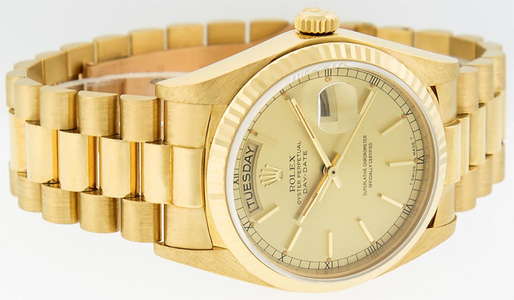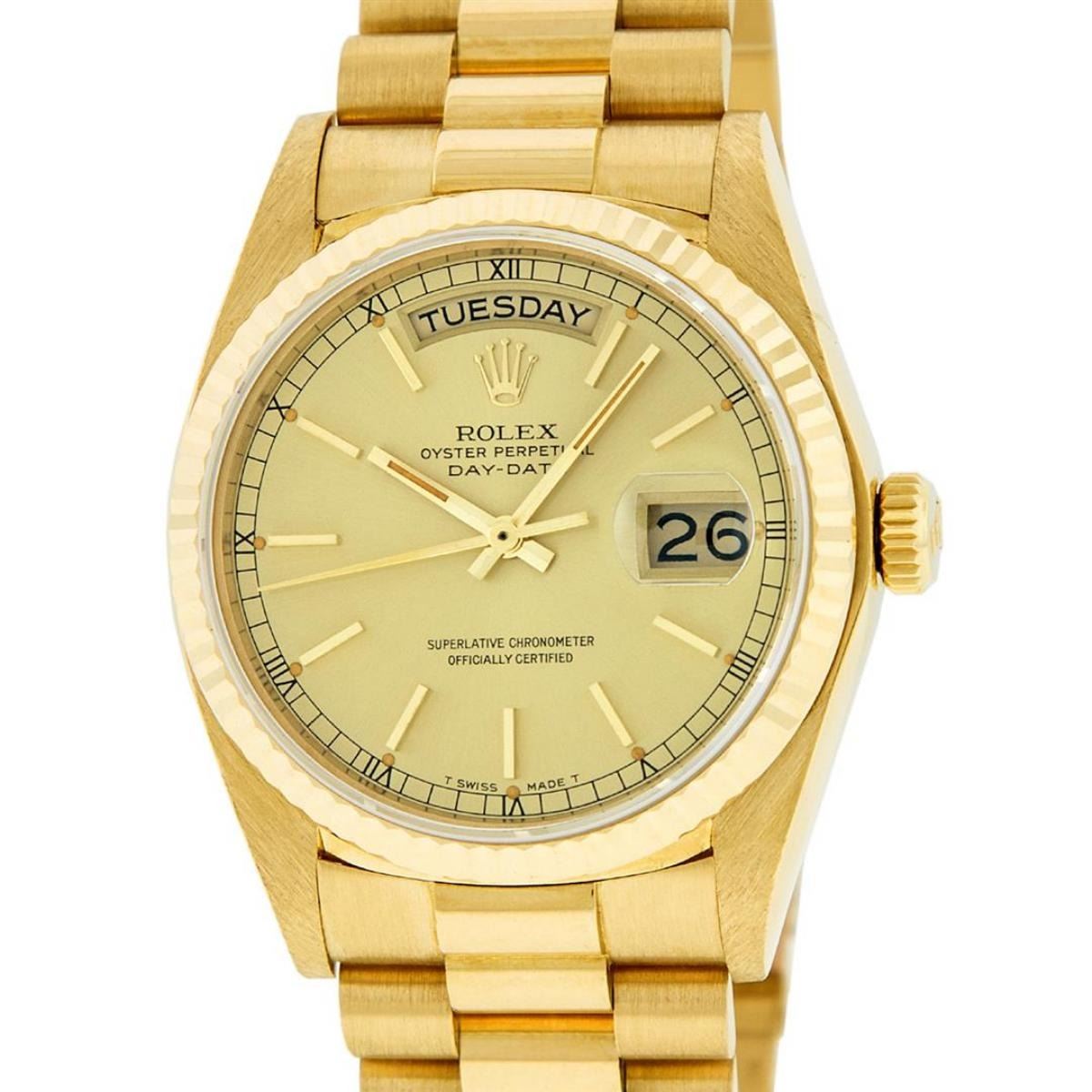 One Mens Quickset Rolex Day Date 18K Yellow Gold President Polished, Serviced & Electronically Tested, 18K Yellow Gold Case: 36mm, 18K Yellow Gold Crown, Bezel: 18K Yellow Gold Fluted Bezel. Custom Crystal: New Scratch Resistant Synthetic Sapphire Cyclops Lens. Movement: Automatic Quickset Winding Movement Caliber 3055. Dial: Champagne Index With Roman Track & Lumi Dots. Date Window: 3 O'Clock Position, Day Display: 12 O'Clock Position, Single Quickset, Model: Day Date President. Condition: G-6 Extra Fine. Bracelet: 18K Yellow Gold President Band With Hidden Clasp, Bright & Satin Polish. 7.0 Inch Length, Standard President Clasp, With Rolex Logo.