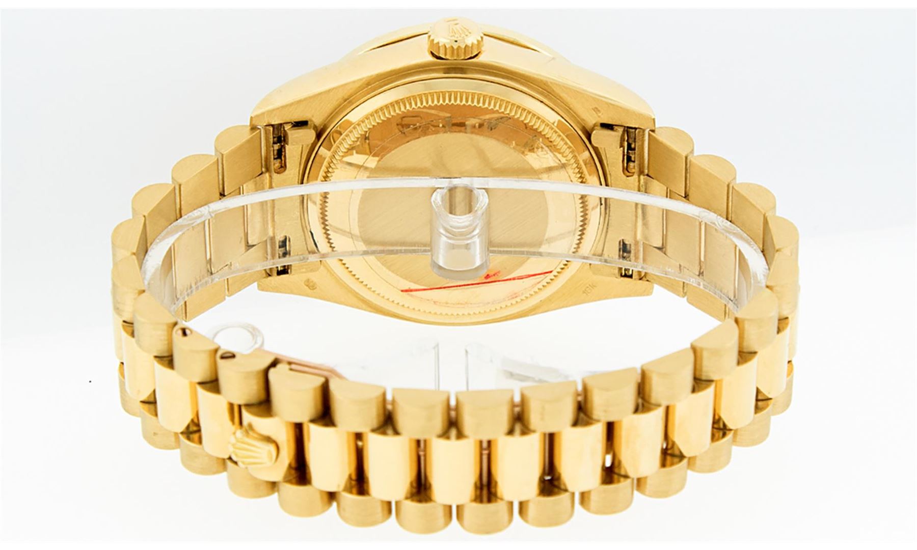 One Mens Pre Owned Rolex Day Date 18K Yellow Gold President Polished, Serviced & Electronically Tested, Rolex 18K Yellow Gold Case: 36mm, Rolex 18K Yellow Gold Crown, Custom Bezel: New 18K Yellow Gold Channel Set With Custom Added Genuine Rubies and Diamonds, Diamond + Stone Count: 52 Diamonds + 4 Rubies On Bezel. Total Weight 1.30 Carat, Clarity: SI-VS, Color: G to H. Custom Crystal: New Scratch Resistant Synthetic Sapphire Cyclops Lens. Custom Hands: New Luminescent Hands. Rolex Movement: Automatic Winding Movement Caliber 3055. Rolex Dial: Champagne Index With Roman Track & Lumi Dots. Date Window: 3 O'Clock Position Date Display, Day Window: 12 O'Clock Position Date Display. Quickset, Model: Day Date President. Condition: G-6 Extra Fine The Watch Is In Very Good Condition Free Of All Scratches And Dents. Rolex Bracelet: 18K Yellow Gold President Band. Bright Polish. 7.0 Inch Length, Standard Hidden President Clasp President Band, With Rolex Logo.