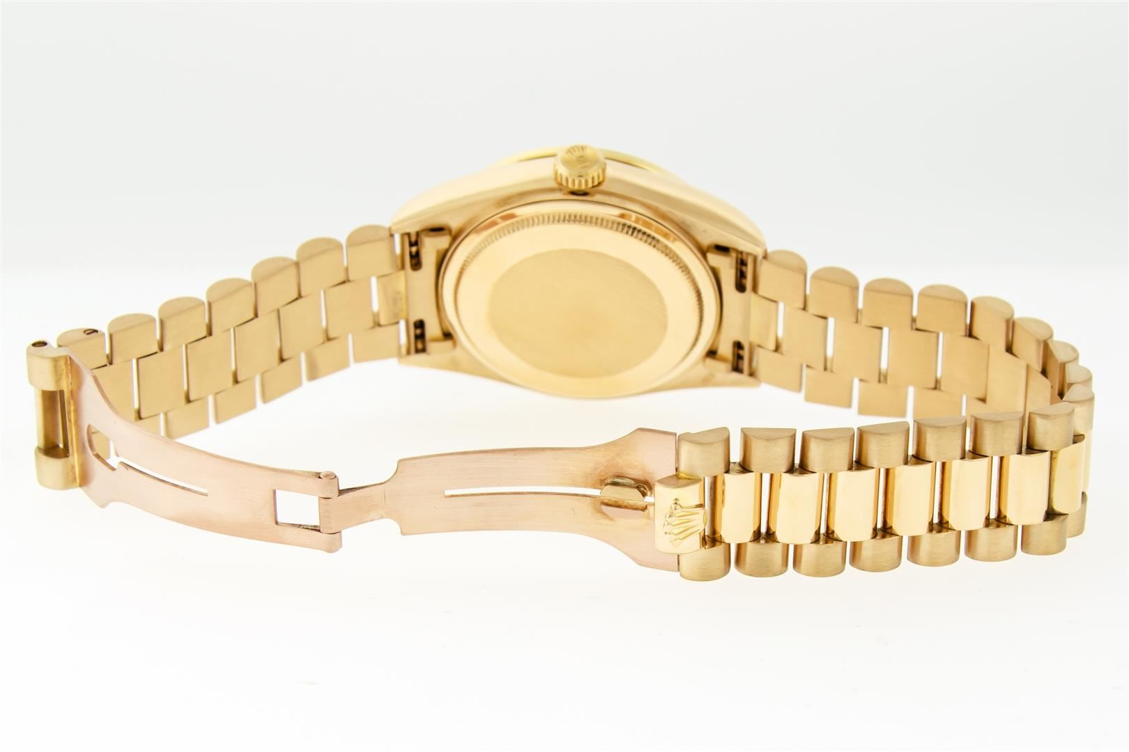 One Mens Pre Owned Rolex Day Date 18K Yellow Gold President Polished, Serviced & Electronically Tested, Rolex 18K Yellow Gold Case: 36mm, Rolex 18K Yellow Gold Crown, Custom Bezel: New 18K Yellow Gold Beadset Diamond Bezel, Diamond Count 44 Diamonds On Bezel. Total Weight 1.0 Carat, Clarity: SI-VS, Color: G to H. Custom Crystal: New Sapphire With Magnified Date Window. Custom Hands: New Luminescent Hands. Rolex Movement: Automatic Winding Movement Caliber 3055. Rolex Dial: Factory Champagne Diamond Dial, Diamond Count: 8 Diamonds + 2 Baguettes, Clarity: VS. Date Window: 3 O'Clock Position Date Display, Day Window: 12 O'Clock Position Date Display. Quickset, Model: Day Date President. Condition: G-6 Extra Fine. Rolex Bracelet: New 18K Yellow Gold President Band. Bright Polish. 7.0 Inch Length, Standard Hidden President Clasp President Band, With Rolex Logo. This Watch Has Been Serviced And Polished It Is Free Of All Scratches And Dents.