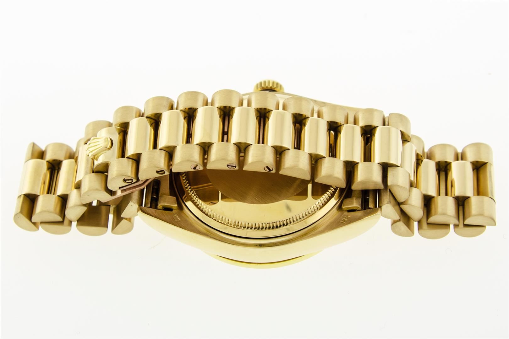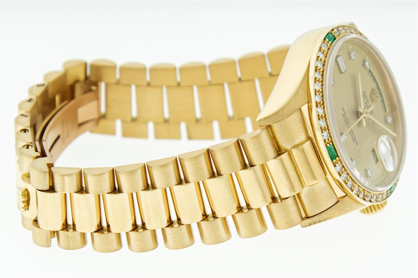 One Mens Pre Owned Rolex Day Date 18K Yellow Gold President Polished, Serviced & Electronically Tested, Rolex 18K Yellow Gold Case: 36mm, Rolex 18K Yellow Gold Crown, Custom Bezel: Custom Bezel: New 18K Yellow Gold Diamond Bezel, Diamond Count 36 Diamonds + 4 Emeralds On Bezel, Clarity: SI-VS, Color: G to H.. Custom Crystal: New Sapphire With Magnified Date Window. Custom Hands: New Luminescent Hands. Rolex Movement: Automatic Winding Movement Caliber 3055. Rolex Dial: Factory Champagne Diamond Dial, Diamond Count: 8 Diamonds + 2 Baguettes, Clarity: VS. Date Window: 3 O'Clock Position Date Display, Day Window: 12 O'Clock Position Date Display. Quickset, Model: Day Date President. Condition: G-6 Extra Fine. Rolex Bracelet: New 18K Yellow Gold President Band. Bright Polish. 7.0 Inch Length, Standard Hidden President Clasp President Band, With Rolex Logo. This Watch Has Been Serviced And Polished It Is Free Of All Scratches And Dents.