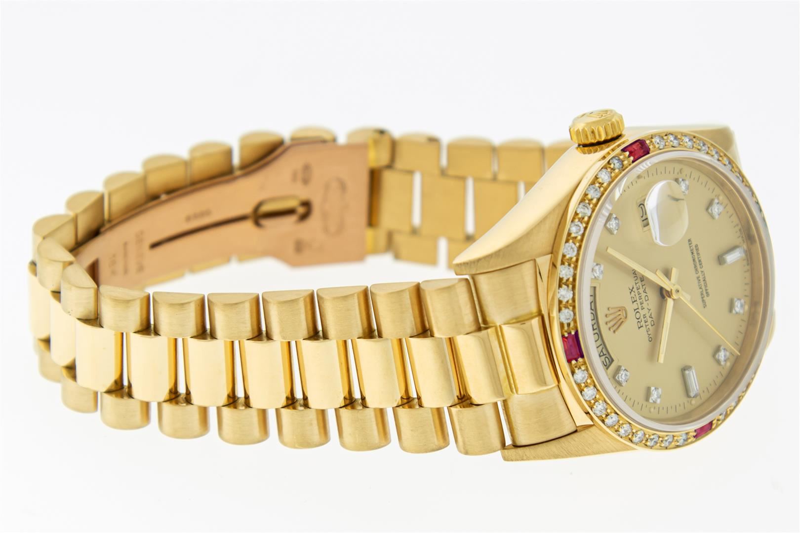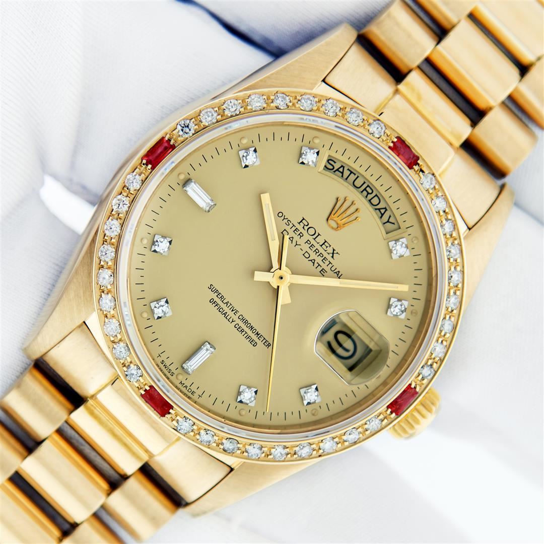 One Mens Pre Owned Rolex Day Date 18K Yellow Gold President Polished, Serviced & Electronically Tested, Rolex 18K Yellow Gold Case: 36mm, Rolex 18K Yellow Gold Crown, Custom Bezel: New 18K Yellow Gold Diamond Bezel + Rubies, Diamond Count 36 Diamonds + 4 Ruby On Bezel, Clarity: SI-VS, Color: G to H. Custom Crystal: New Sapphire With Magnified Date Window. Custom Hands: New Luminescent Hands. Rolex Movement: Automatic Winding Movement Caliber 3055. Rolex Dial: Factory Champagne Diamond Dial, Diamond Count: 8 Diamonds + 2 Baguettes, Clarity: VS. Date Window: 3 O'Clock Position Date Display, Day Window: 12 O'Clock Position Date Display. Quickset, Model: Day Date President. Condition: G-6 Extra Fine. Rolex Bracelet: New 18K Yellow Gold President Band. Bright Polish. 7.0 Inch Length, Standard Hidden President Clasp President Band, With Rolex Logo. This Watch Has Been Serviced And Polished It Is Free Of All Scratches And Dents.