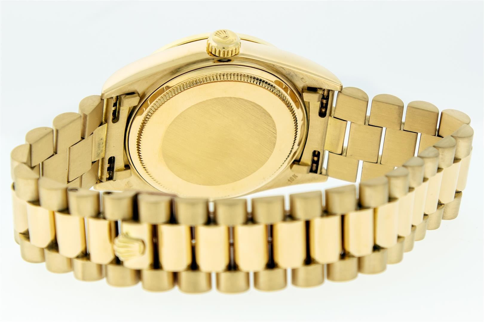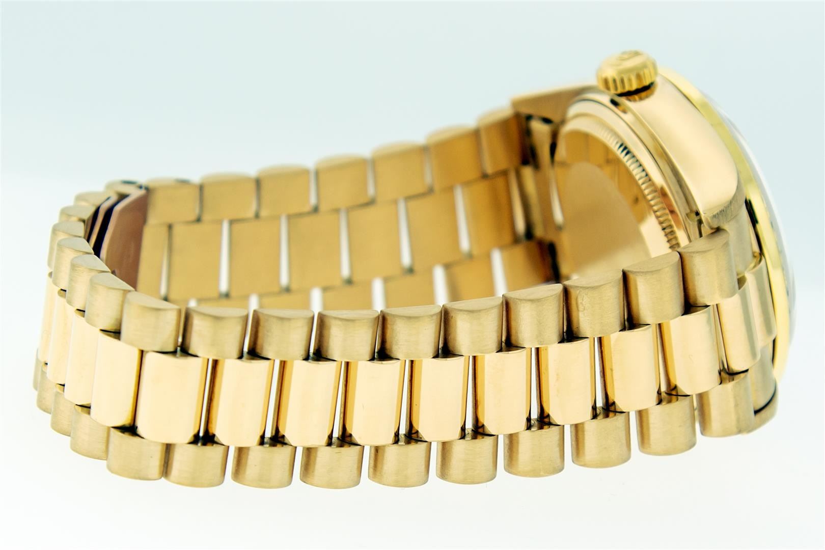 One Mens Pre Owned Rolex Day Date 18K Yellow Gold President Polished, Serviced & Electronically Tested, Rolex 18K Yellow Gold Case: 36mm, Rolex 18K Yellow Gold Crown, Custom Bezel: New 18K Yellow Gold Diamond Bezel + Rubies, Diamond Count 36 Diamonds + 4 Ruby On Bezel, Clarity: SI-VS, Color: G to H. Custom Crystal: New Sapphire With Magnified Date Window. Custom Hands: New Luminescent Hands. Rolex Movement: Automatic Winding Movement Caliber 3055. Rolex Dial: Factory Champagne Diamond Dial, Diamond Count: 8 Diamonds + 2 Baguettes, Clarity: VS. Date Window: 3 O'Clock Position Date Display, Day Window: 12 O'Clock Position Date Display. Quickset, Model: Day Date President. Condition: G-6 Extra Fine. Rolex Bracelet: New 18K Yellow Gold President Band. Bright Polish. 7.0 Inch Length, Standard Hidden President Clasp President Band, With Rolex Logo. This Watch Has Been Serviced And Polished It Is Free Of All Scratches And Dents.