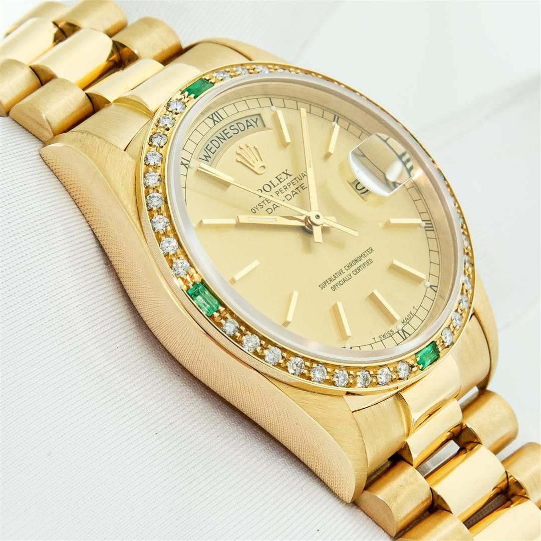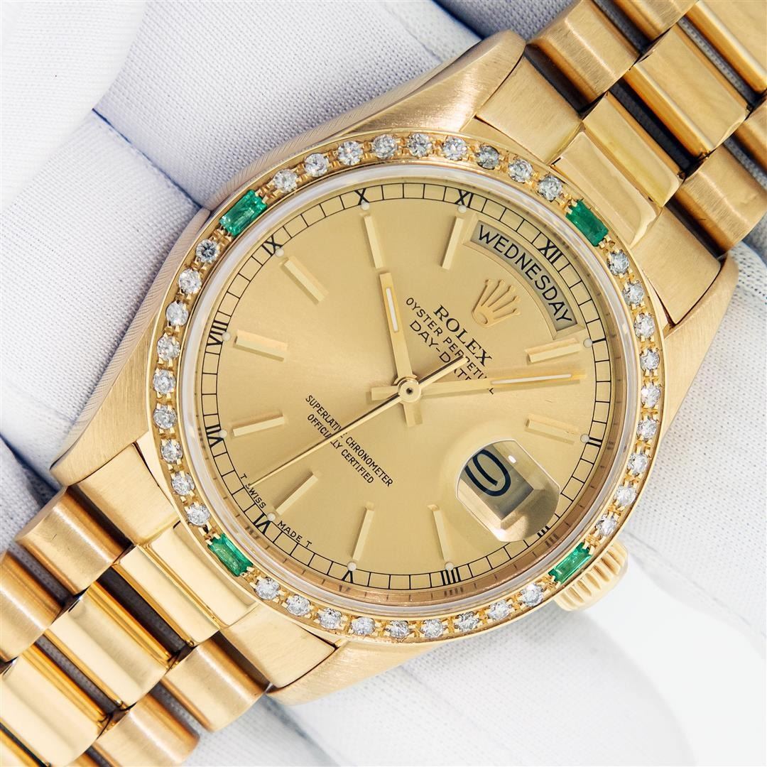 One Mens Pre Owned Quickset Rolex Day Date 18K Yellow Gold President Polished, Serviced & Electronically Tested, Rolex 18K Yellow Gold Case: 36mm, Rolex 18K Yellow Gold Crown, Custom Bezel: New 18K Yellow Gold Beadset Diamond & Emerald Bezel, Diamond Count: 36 Diamonds + 4 Emeralds On Bezel. Custom Crystal: New Sapphire With Magnified Date Window. Rolex Movement: Automatic Quickset Winding Movement Caliber 3055. Rolex Dial: Champagne Index With Roman Track & Lumi Dots. Custom Hands: New Hands. Date Window: 3 O'Clock Position, Day Display: 12 O'Clock Position, Single Quickset, Model: Day Date President. Condition: G-6 Extra Fine. Rolex Bracelet: 18K Yellow Gold President Band With Hidden Clasp, Bright & Satin Polish. 7.0 Inch Length, Standard President Clasp, With Rolex Logo. This Watch Has Been Serviced And Polished It Is Free Of All Scratches And Dents.