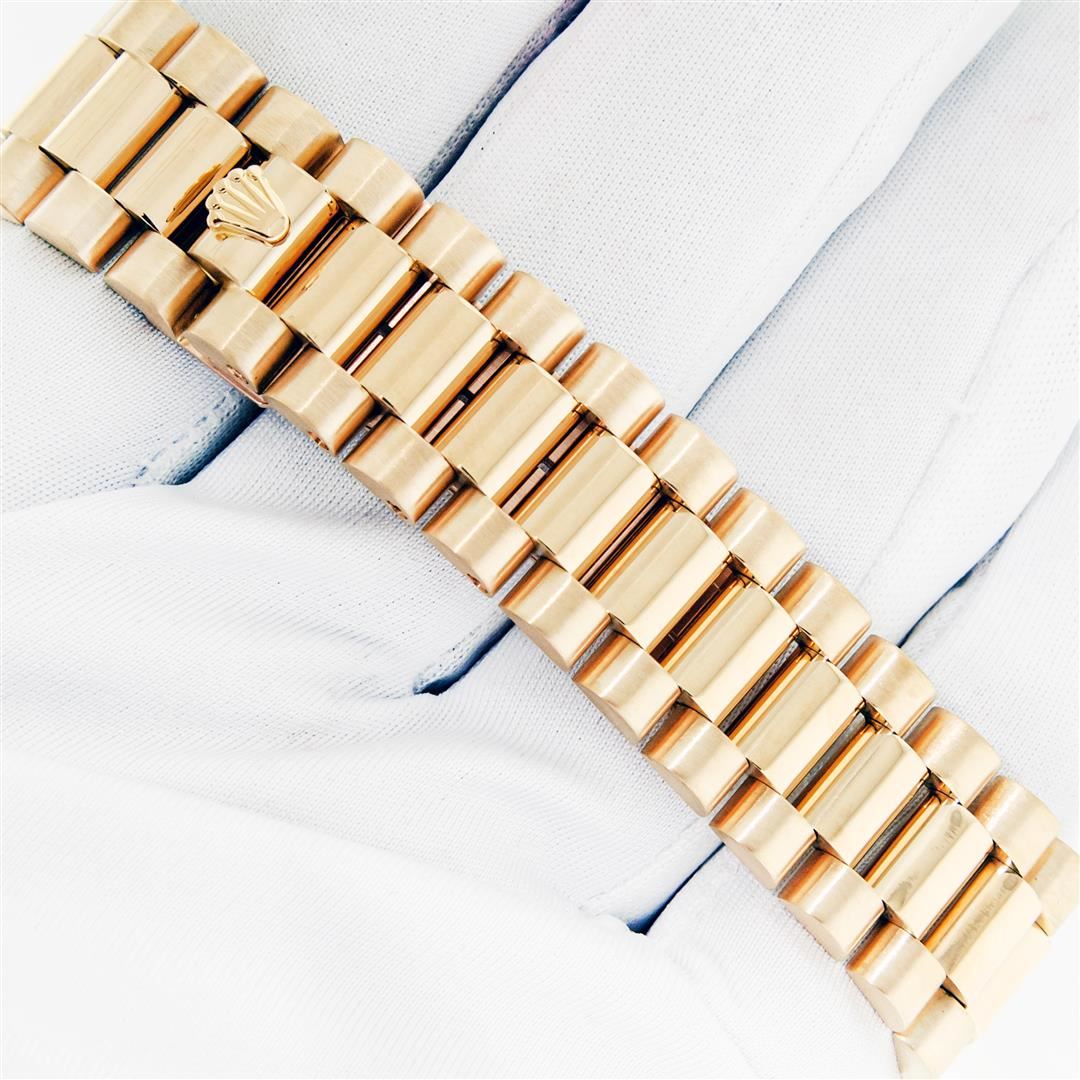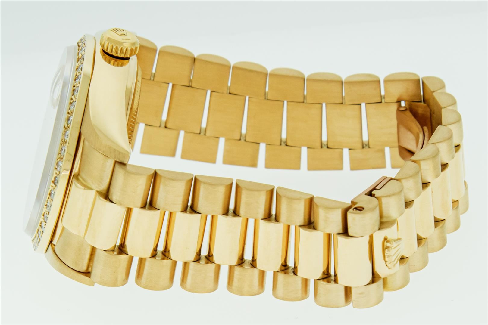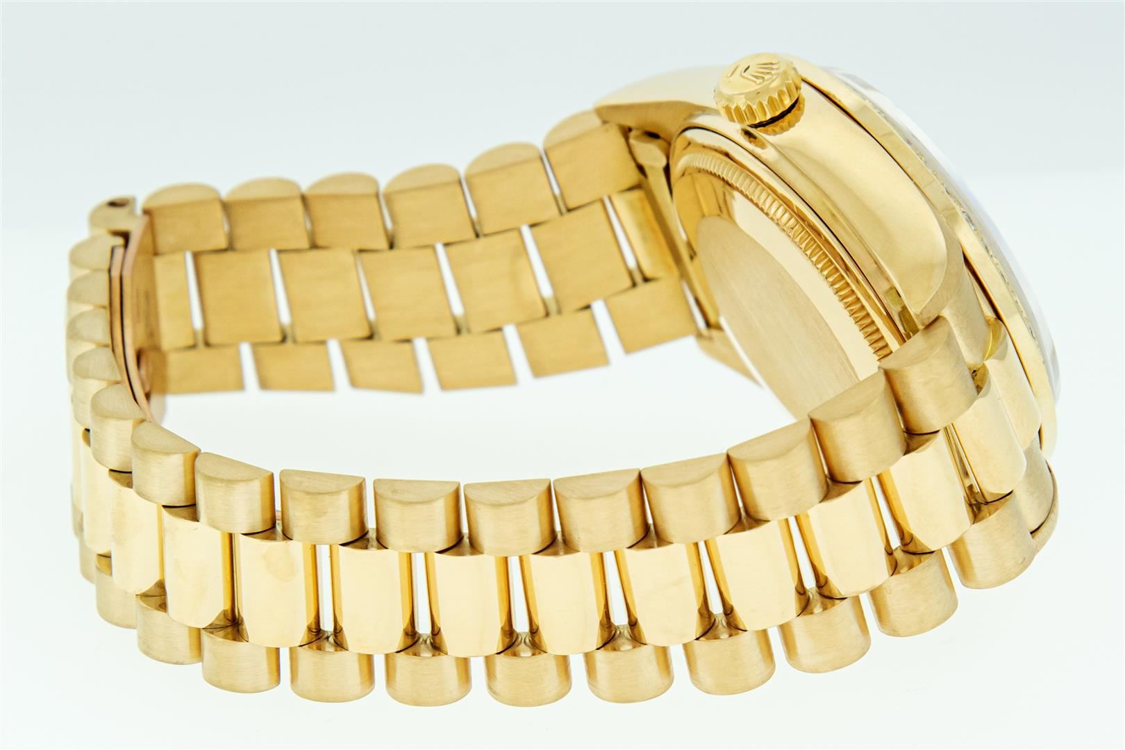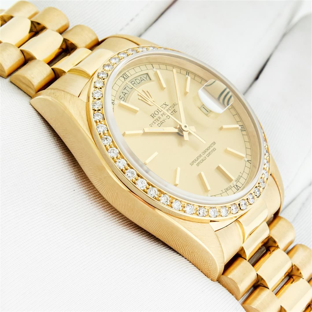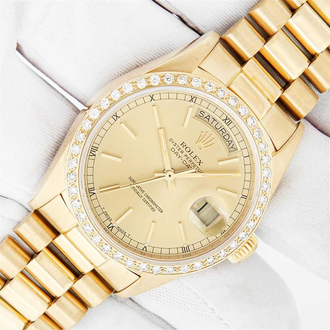 One Mens Pre Owned Quickset Rolex Day Date 18K Yellow Gold President Polished, Serviced & Electronically Tested, Rolex 18K Yellow Gold Case: 36mm, Rolex 18K Yellow Gold Crown, Custom Bezel: New 18K Yellow Gold Beadset Diamond Bezel, Diamond Count: 44 Diamonds On Bezel. Custom Crystal: New Sapphire With Magnified Date Window. Rolex Movement: Automatic Quickset Winding Movement Caliber 3055. Rolex Dial: Champagne Index With Roman Track & Lumi Dots. Custom Hands: New Hands. Date Window: 3 O'Clock Position, Day Display: 12 O'Clock Position, Single Quickset, Model: Day Date President. Condition: G-6 Extra Fine. Rolex Bracelet: 18K Yellow Gold President Band With Hidden Clasp, Bright & Satin Polish. 7.0 Inch Length, Standard President Clasp, With Rolex Logo. This Watch Has Been Serviced And Polished It Is Free Of All Scratches And Dents.