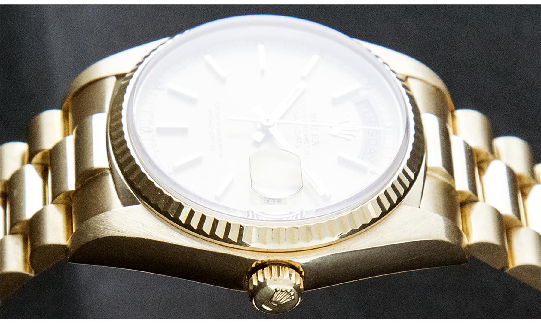 One Mens Double Quickset Rolex Day Date 18K Yellow Gold President Polished, Serviced & Electronically Tested, Rolex 18K Yellow Gold Case: 36mm, Rolex 18K Yellow Gold Crown, Rolex Bezel: 18K Yellow Gold Fluted Bezel. Crystal: Sapphire With Magnified Date Window. Hands: Luminescent Hands. Rolex Movement: Automatic Quickset Winding Movement Caliber 3155. Rolex Dial: Champagne Index With Roman Track & Lumi Dots. Date Window: 3 O'Clock Position, Day Display: 12 O'Clock Position, Double Quickset, Model: Day Date Double Quickset President. Condition: G-6 Extra Fine. Rolex Bracelet: 18K Yellow Gold President Band With Hidden Clasp, Bright & Satin Polish. 7.0 Inch Length, Hidden President Clasp, With Rolex Logo. This Pre Owned Watch Has Been Serviced Time Tested And Is In Excellent Condition It Is Free Of All Scratches And Dents.