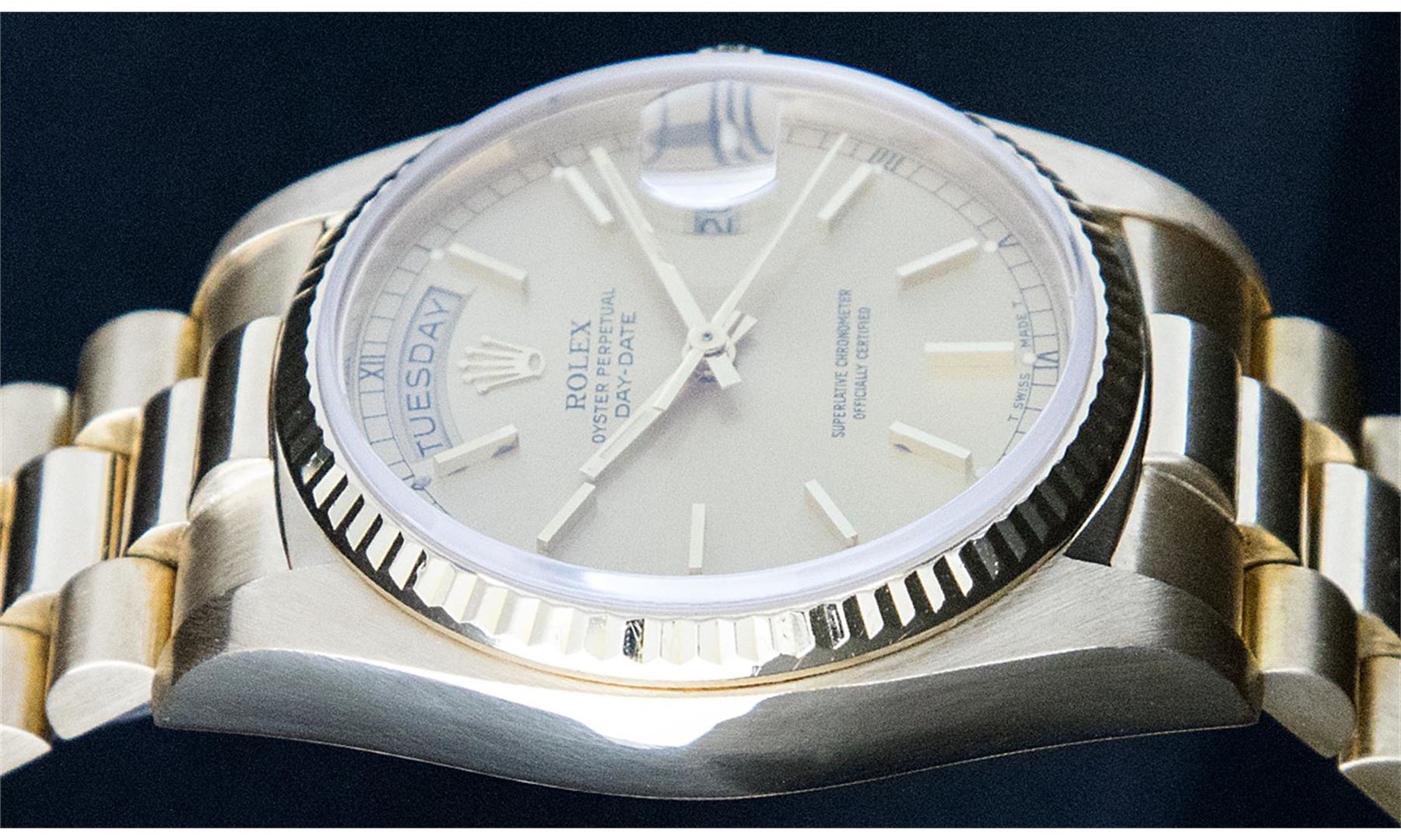 One Mens Double Quickset Rolex Day Date 18K Yellow Gold President Polished, Serviced & Electronically Tested, Rolex 18K Yellow Gold Case: 36mm, Rolex 18K Yellow Gold Crown, Rolex Bezel: 18K Yellow Gold Fluted Bezel. Crystal: Sapphire With Magnified Date Window. Hands: Luminescent Hands. Rolex Movement: Automatic Quickset Winding Movement Caliber 3155. Rolex Dial: Champagne Index With Roman Track & Lumi Dots. Date Window: 3 O'Clock Position, Day Display: 12 O'Clock Position, Double Quickset, Model: Day Date Double Quickset President. Condition: G-6 Extra Fine. Rolex Bracelet: 18K Yellow Gold President Band With Hidden Clasp, Bright & Satin Polish. 7.0 Inch Length, Hidden President Clasp, With Rolex Logo. This Pre Owned Watch Has Been Serviced Time Tested And Is In Excellent Condition It Is Free Of All Scratches And Dents.