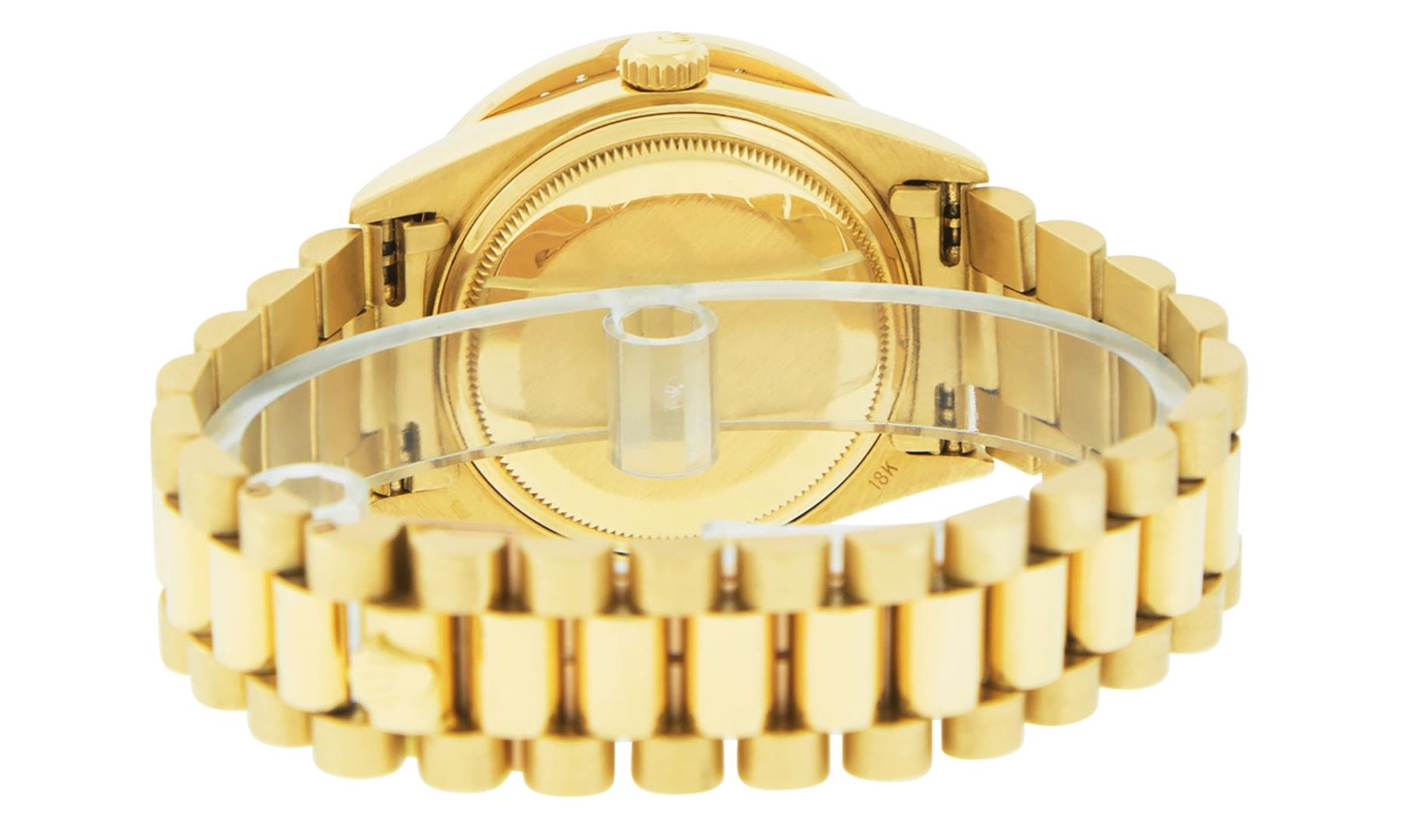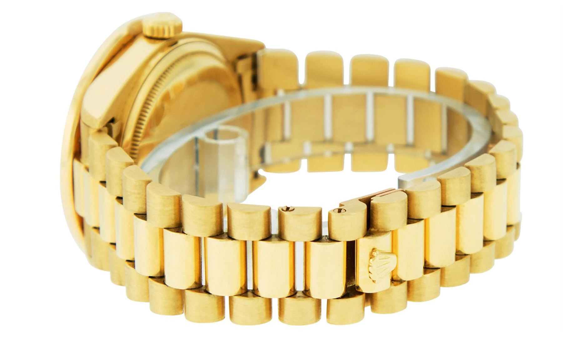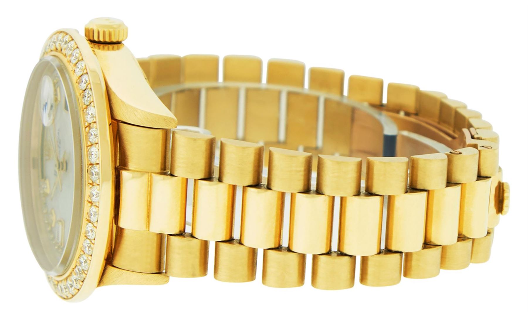 One Mens Pre Owned Rolex Day Date 18K Yellow Gold Presidential Polished, Serviced & Electronically Tested, 18K Yellow Gold Case: 36mm, 18K Yellow Gold Crown, Custom Bezel: New 18K Yellow Gold 2.5ctw Beadset Diamond Bezel, Diamond Count: 42 Diamonds On Bezel. Total Diamond Weight 2.5 Carat. Custom Crystal: New Sapphire With Magnified Date Window. Custom Hands: New Luminescent Hands. Rolex Movement: Automatic Winding Movement Caliber 3055. Custom Dial: Mother Of Pearl String Diamond Dial, Diamond Count: 49 Diamonds + 2 Baguettes. Date Window: 3 O'Clock Position Date Display, Day Window: 12 O'Clock Position Date Display. Quickset, Model: Day Date President. Condition: G-6 Extra Fine The Watch Is In Very Good Condition Free Of All Scratches And Dents. Rolex Bracelet: 18K Yellow Gold President Band. Bright Polish. 7.0 Inch Length, Standard Hidden President Clasp President Band, With Rolex Logo.