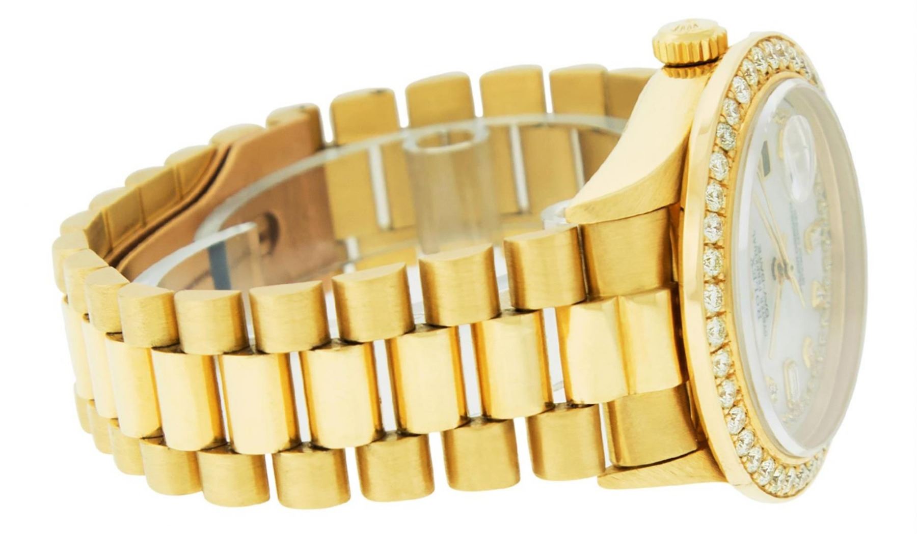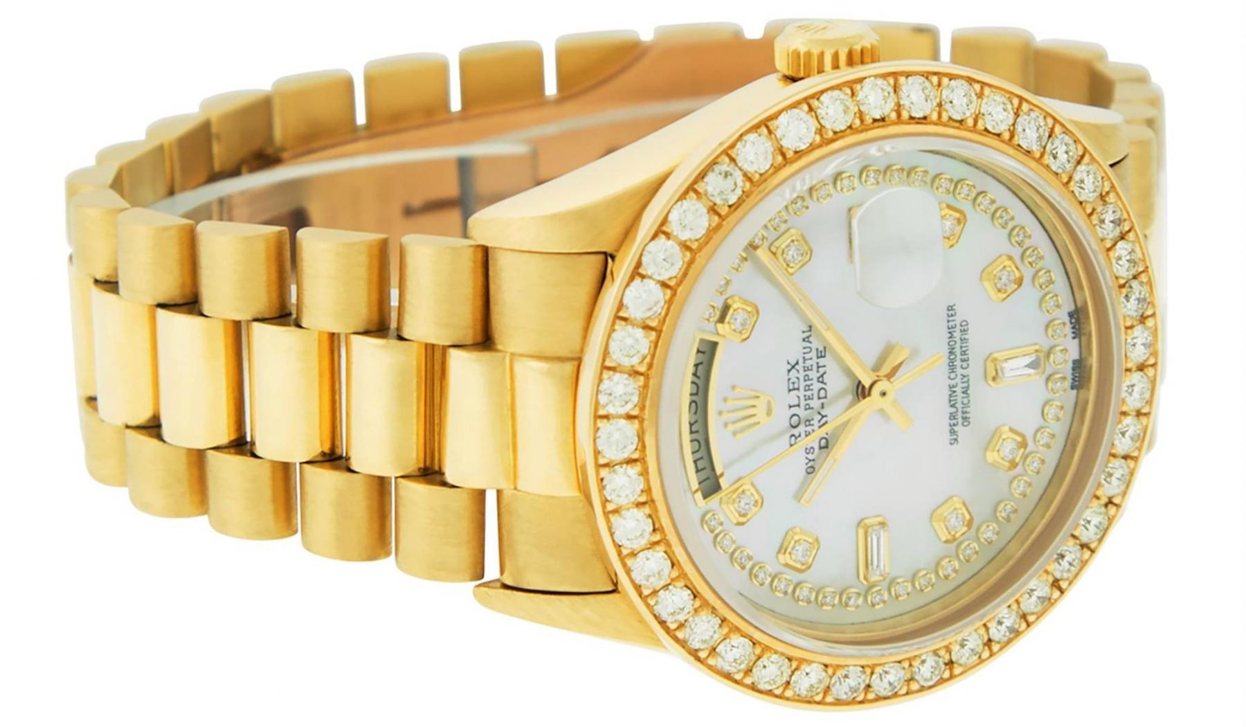 One Mens Rolex Day Date 18K Yellow Gold Presidential Polished, Serviced & Electronically Tested, 18K Yellow Gold Case: 36mm, 18K Yellow Gold Crown, Custom Bezel: 18K Yellow Gold 2.5ctw Beadset Diamond Bezel, Diamond Count: 42 Diamonds On Bezel. Total Diamond Weight 2.5 Carat, Clarity: SI-VS, Color: G to H. Custom Crystal: New Scratch Resistant Synthetic Sapphire Cyclops Lens. Custom Hands: New Luminescent Hands. Movement: Automatic Winding Movement Caliber 3055. Custom Dial: Refinished Mother Of Pearl String Diamond Dial, Diamond Count: 49 Diamonds + 2 Baguettes, Color: G to H, Clarity: SI-VS. Date Window: 3 O'Clock Position Date Display, Day Window: 12 O'Clock Position Date Display. Quickset, Model: Day Date President. Condition: G-6 Extra Fine The Watch Is In Very Good Condition Free Of All Scratches And Dents. Bracelet: 18K Yellow Gold President Band. Bright Polish. 7.0 Inch Length, Standard Hidden President Clasp President Band, With Rolex Logo. This Watch Comes With A Rolex Box & Appraisal.