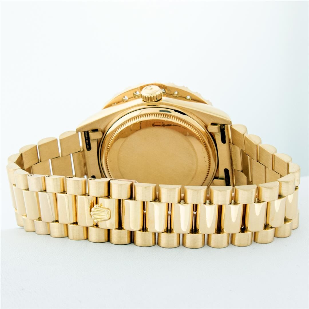 One Mens Pre Owned Rolex Day Date 18K Yellow Gold President Polished, Serviced & Electronically Tested, 18K Yellow Gold Case: 36mm, 18K Yellow Gold Crown, Custom Bezel: New 18K Yellow Gold Bead-set Diamond Bezel, Diamond Count: 48 Diamonds On Bezel. Total Weight 4.25 Carat. Custom Crystal: New Sapphire With Magnified Date Window. Custom Hands: New Luminescent Hands. Rolex Movement: Automatic Winding Movement. Custom Dial: Mother Of Pearl With Custom Added Diamond Hour Markers, Diamond Count: 10 Diamonds On Dial. Date Window: 3 O'Clock Position Date Display, Day Window: 12 O'Clock Position Date Display. Quickset, Model: Day Date President. Condition: G-6 Extra Fine The Watch Is In Very Good Condition Free Of All Scratches And Dents. Rolex Bracelet: 18K Yellow Gold President. Bright Polish. 7.0 Inch Length, Standard Hidden President Clasp President Band, With Rolex Logo.