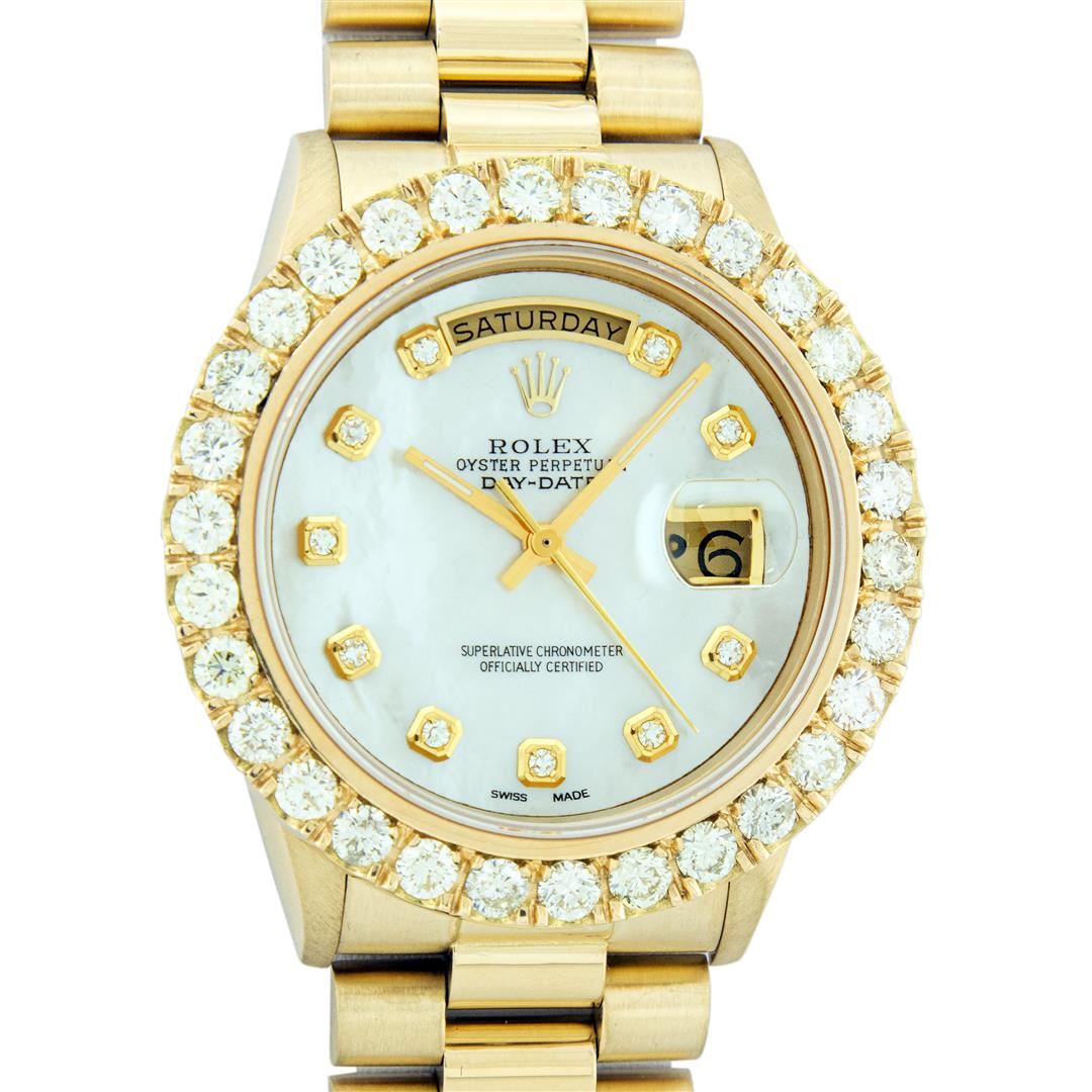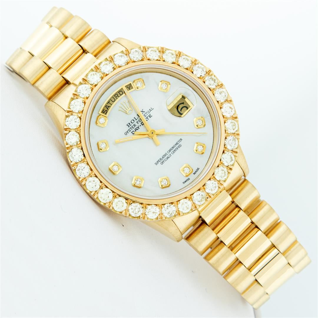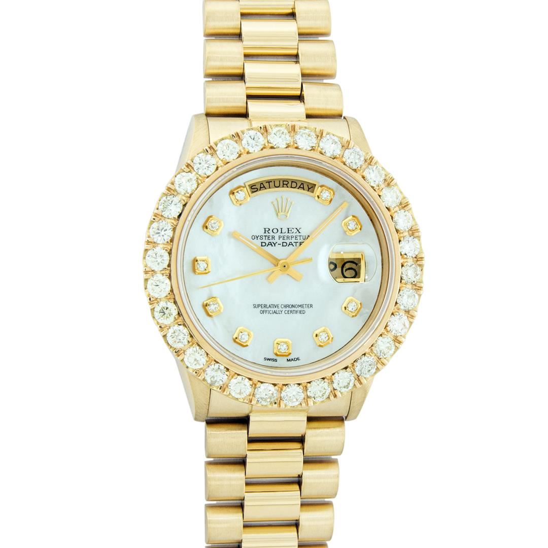 One Mens Pre Owned Rolex Day Date 18K Yellow Gold President Polished, Serviced & Electronically Tested, 18K Yellow Gold Case: 36mm, 18K Yellow Gold Crown, Custom Bezel: New 18K Yellow Gold Bead-set Diamond Bezel, Diamond Count: 48 Diamonds On Bezel. Total Weight 4.25 Carat. Custom Crystal: New Sapphire With Magnified Date Window. Custom Hands: New Luminescent Hands. Rolex Movement: Automatic Winding Movement. Custom Dial: Mother Of Pearl With Custom Added Diamond Hour Markers, Diamond Count: 10 Diamonds On Dial. Date Window: 3 O'Clock Position Date Display, Day Window: 12 O'Clock Position Date Display. Quickset, Model: Day Date President. Condition: G-6 Extra Fine The Watch Is In Very Good Condition Free Of All Scratches And Dents. Rolex Bracelet: 18K Yellow Gold President. Bright Polish. 7.0 Inch Length, Standard Hidden President Clasp President Band, With Rolex Logo.