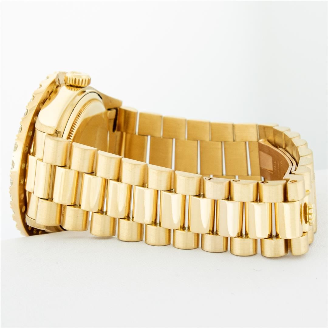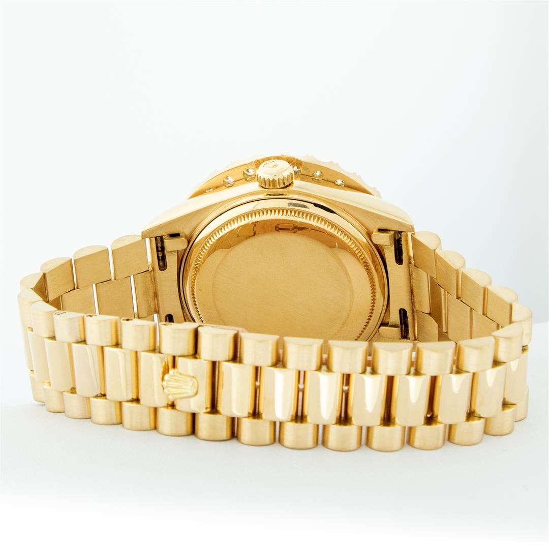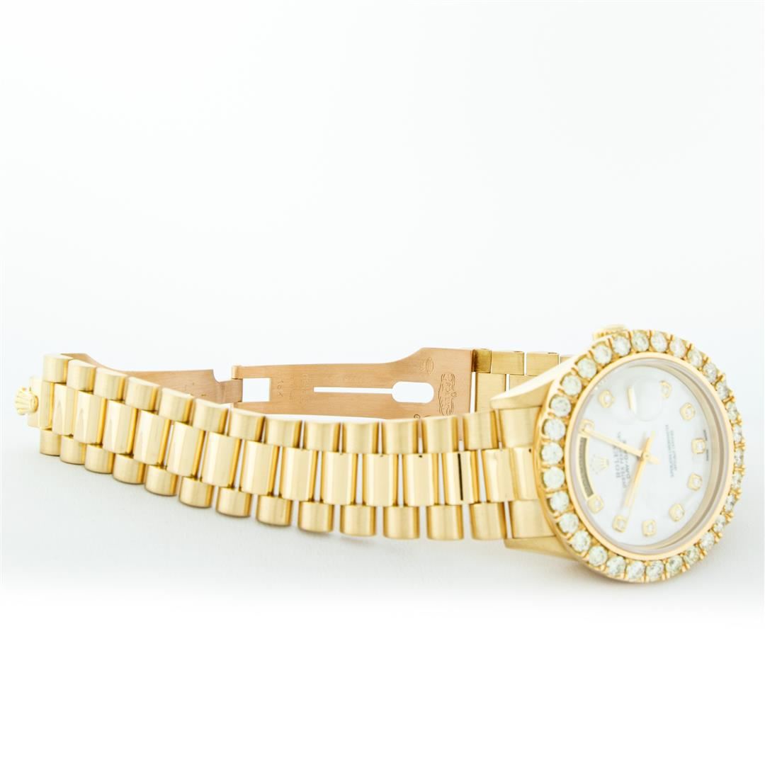 One Mens Pre Owned Rolex Day Date 18K Yellow Gold President Polished, Serviced & Electronically Tested, 18K Yellow Gold Case: 36mm, 18K Yellow Gold Crown, Custom Bezel: New 18K Yellow Gold Bead-set Diamond Bezel, Diamond Count: 48 Diamonds On Bezel. Total Weight 4.25 Carat. Custom Crystal: New Sapphire With Magnified Date Window. Custom Hands: New Luminescent Hands. Rolex Movement: Automatic Winding Movement. Custom Dial: Mother Of Pearl With Custom Added Diamond Hour Markers, Diamond Count: 10 Diamonds On Dial. Date Window: 3 O'Clock Position Date Display, Day Window: 12 O'Clock Position Date Display. Quickset, Model: Day Date President. Condition: G-6 Extra Fine The Watch Is In Very Good Condition Free Of All Scratches And Dents. Rolex Bracelet: 18K Yellow Gold President. Bright Polish. 7.0 Inch Length, Standard Hidden President Clasp President Band, With Rolex Logo.