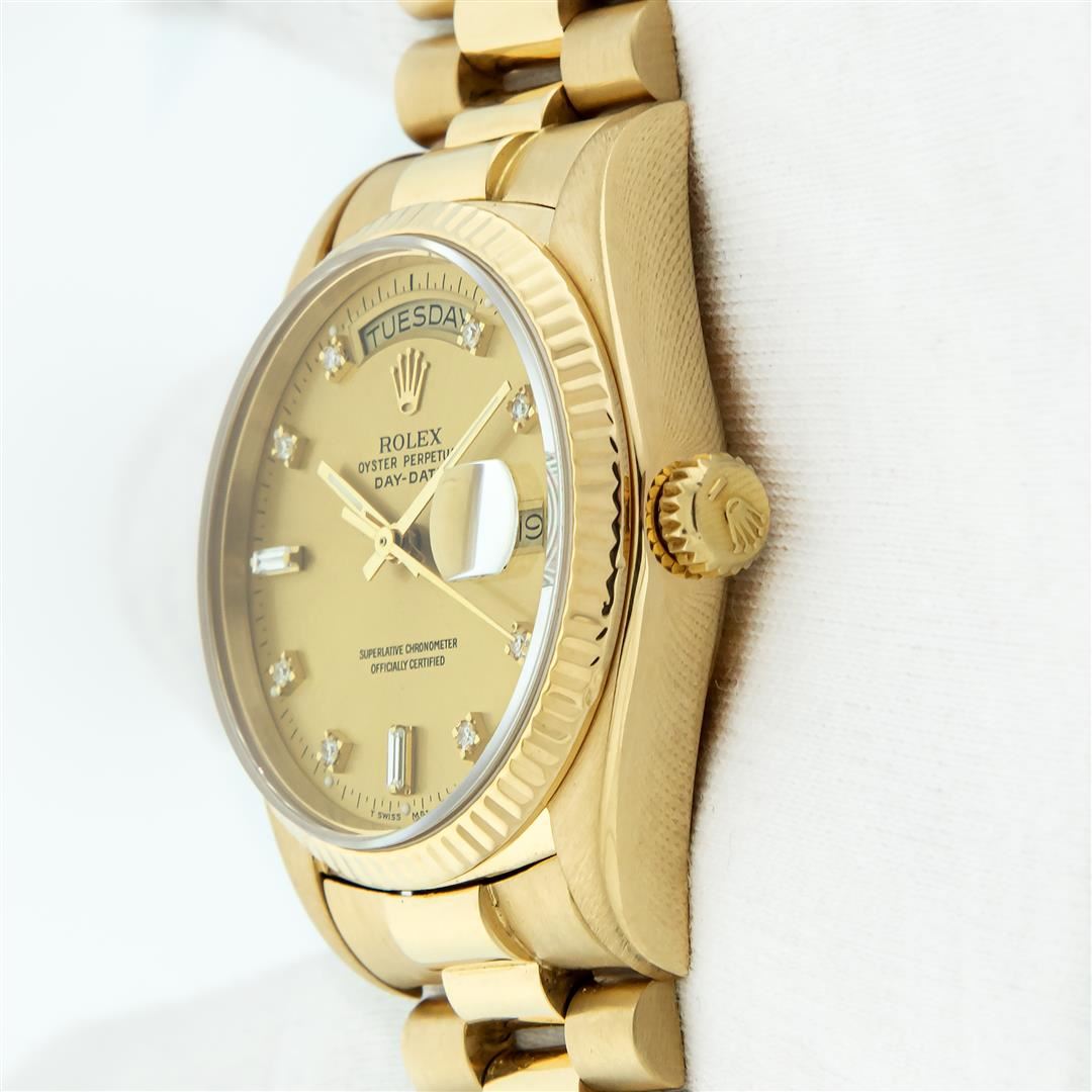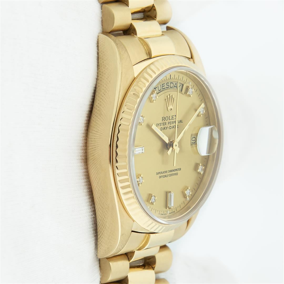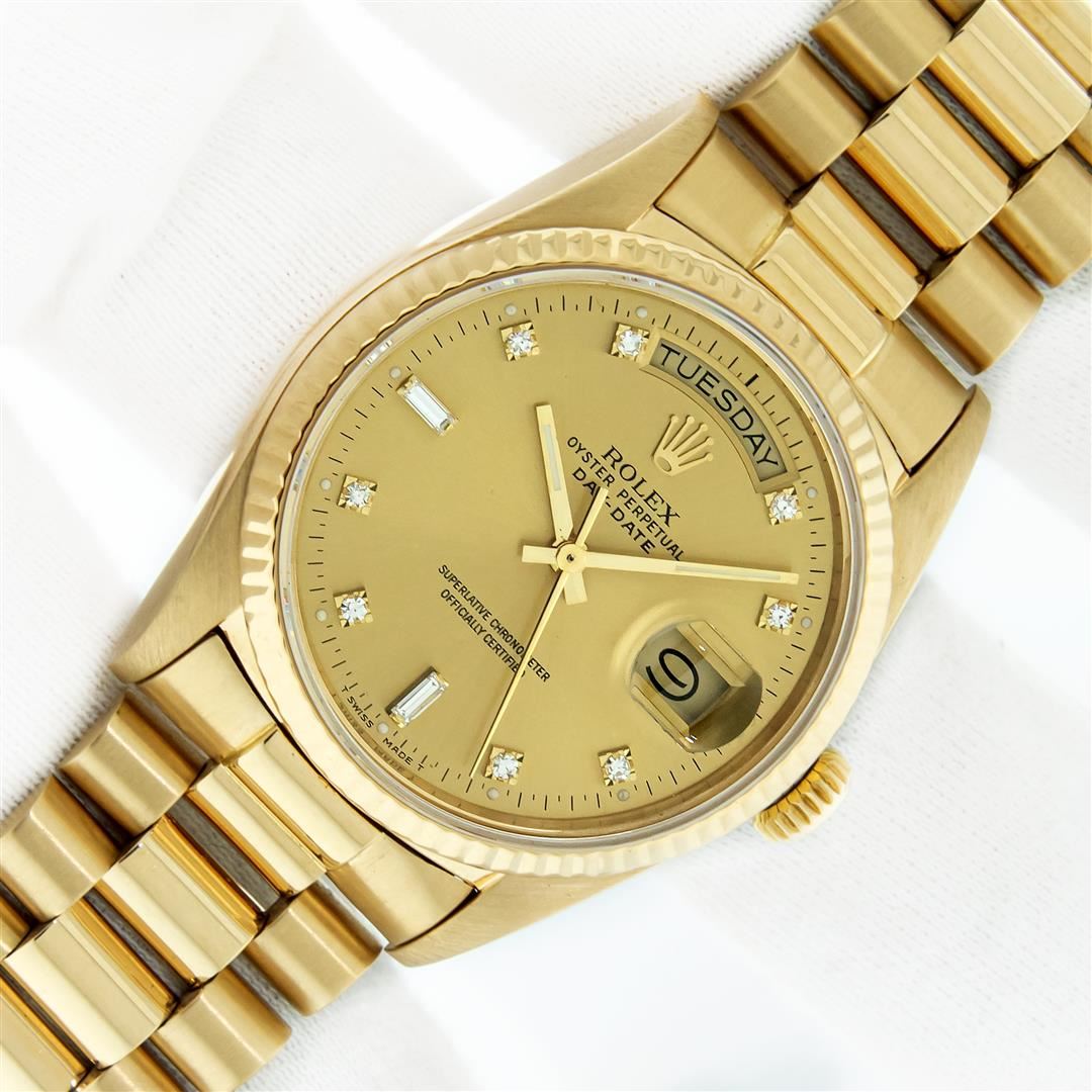 One Mens Pre Owned Quickset Rolex Day Date 18K Yellow Gold President Polished, Serviced & Electronically Tested, Rolex 18K Yellow Gold Case: 36mm, Rolex 18K Yellow Gold Crown, Rolex Bezel: 18K Yellow Gold Fluted Bezel. Rolex Crystal: Sapphire With Cyclops Lens. Rolex Movement: Automatic Quickset Winding Movement Caliber 3055. Rolex Dial: Factory Champagne Diamond Dial, Stone Count: 8 Diamonds + 2 Baguette Diamonds, Clarity: VS. Date Window: 3 O'Clock Position, Day Display: 12 O'Clock Position, Single Quickset, Model: Day Date President. Condition: G-6 Extra Fine. Rolex Bracelet: 18K Yellow Gold President Band With Hidden Clasp, Bright & Satin Polish. 7.0 Inch Length, Standard President Clasp, With Rolex Logo. This Watch Comes With A Rolex Box.