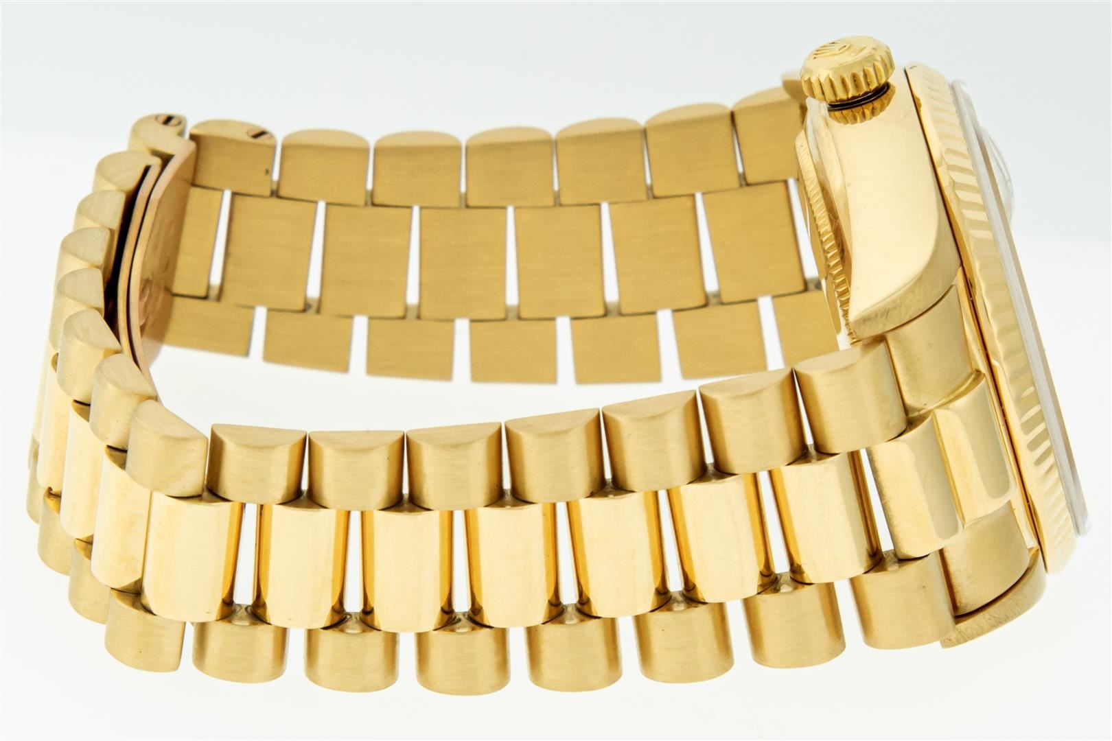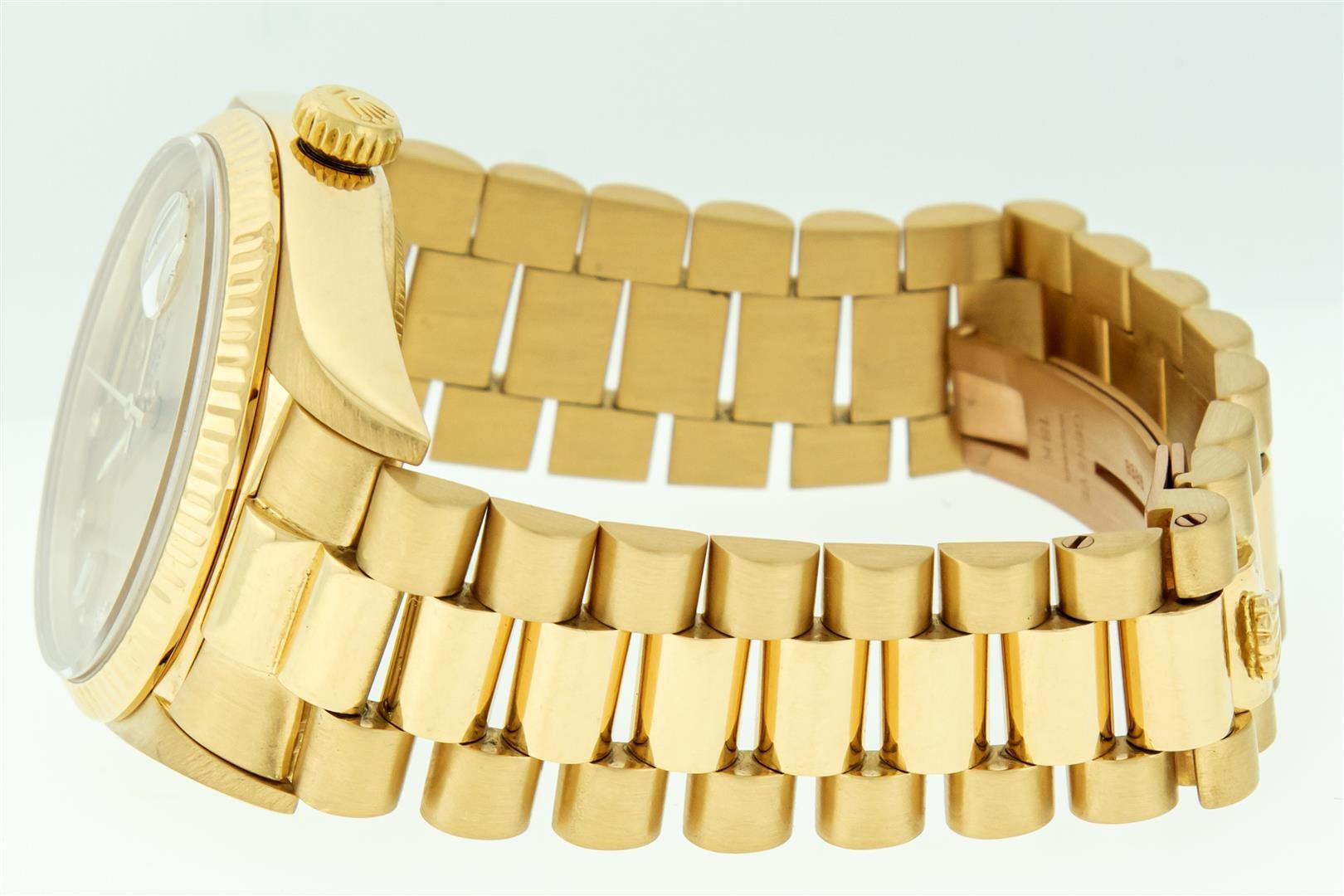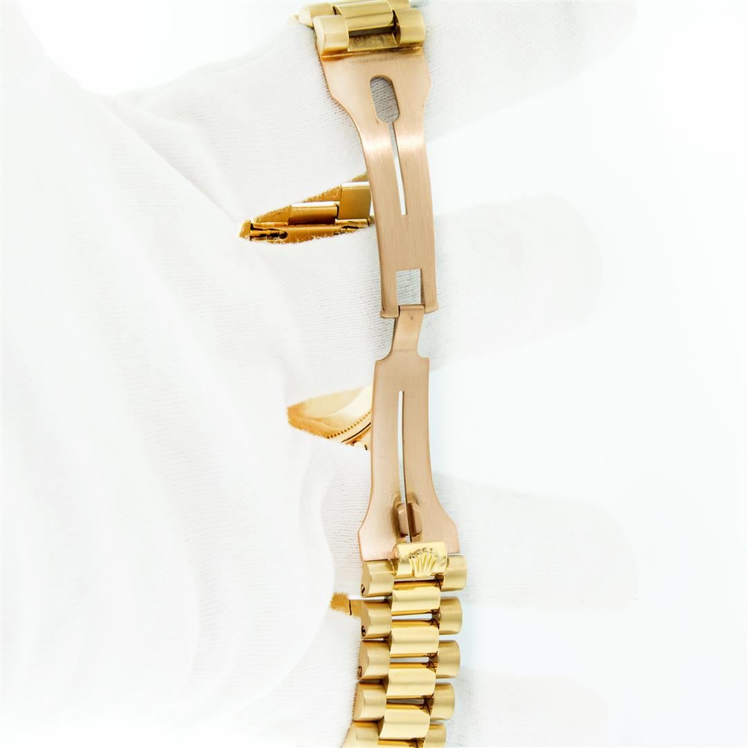 One Mens Pre Owned Quickset Rolex Day Date 18K Yellow Gold President Polished, Serviced & Electronically Tested, Rolex 18K Yellow Gold Case: 36mm, Rolex 18K Yellow Gold Crown, Rolex Bezel: 18K Yellow Gold Fluted Bezel. Rolex Crystal: Sapphire With Cyclops Lens. Rolex Movement: Automatic Quickset Winding Movement Caliber 3055. Rolex Dial: Factory Champagne Diamond Dial, Stone Count: 8 Diamonds + 2 Baguette Diamonds, Clarity: VS. Date Window: 3 O'Clock Position, Day Display: 12 O'Clock Position, Single Quickset, Model: Day Date President. Condition: G-6 Extra Fine. Rolex Bracelet: 18K Yellow Gold President Band With Hidden Clasp, Bright & Satin Polish. 7.0 Inch Length, Standard President Clasp, With Rolex Logo. This Watch Comes With A Rolex Box.