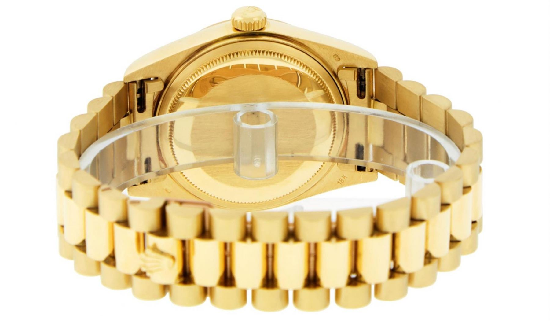 One Mens Quickset Rolex Day Date 18K Yellow Gold Presidential Polished, Serviced & Electronically Tested, 18K Yellow Gold Case: 36mm, 18K Yellow Gold Crown, Bezel: 18K Yellow Gold Fluted Bezel. Custom Crystal: New Scratch Resistant Synthetic Sapphire Cyclops Lens. Custom Hands: New Luminescent Hands. Movement: Automatic Quickset Winding Movement Caliber 3055. Custom Dial: Refinished Silver Single Cut Diamond Dial, Diamond Count: 10 Diamonds On Dial, Color: G To H, Clarity: SI-VS. Date Window: 3 O'Clock Position, Day Display: 12 O'Clock Position, Single Quickset, Model: Day Date President. Condition: G-6 Extra Fine. Bracelet: 18K Yellow Gold President Band With Hidden Clasp, Bright & Satin Polish. 7.0 Inch Length, Standard President Clasp, With Rolex Logo. This Watch Comes With A Rolex Box.