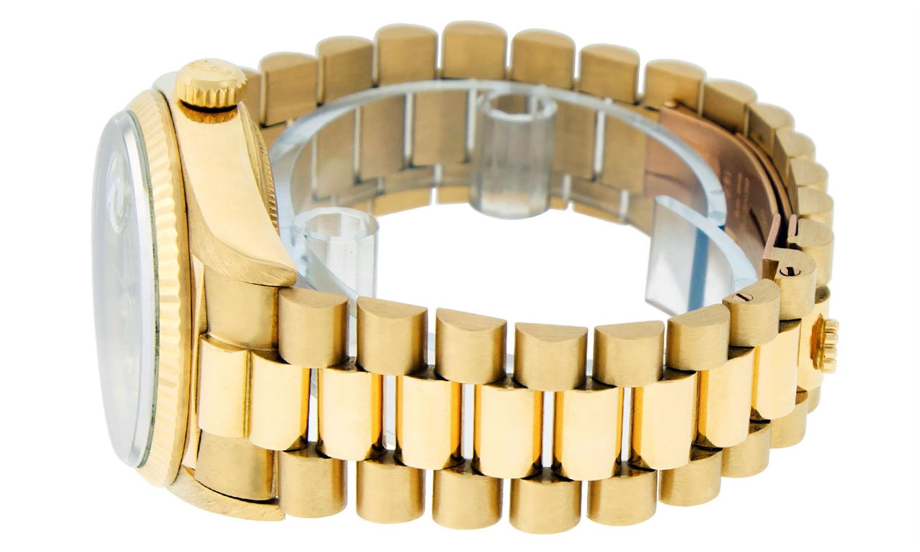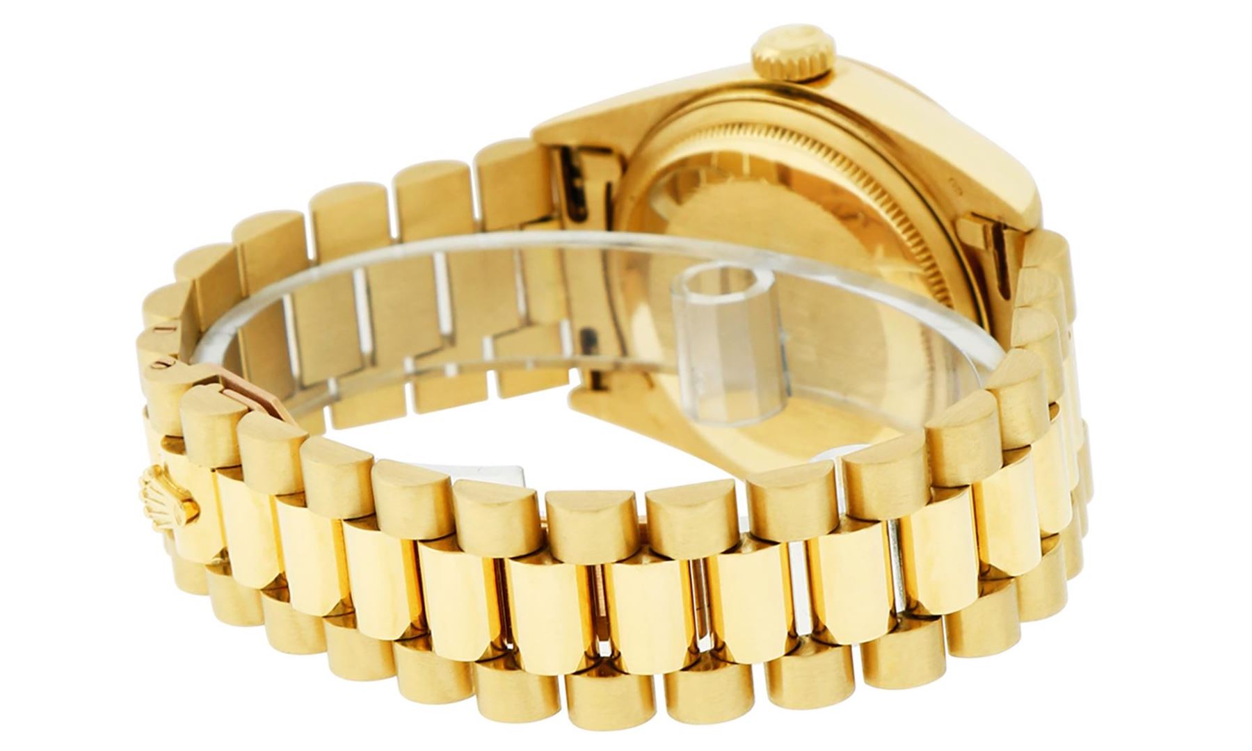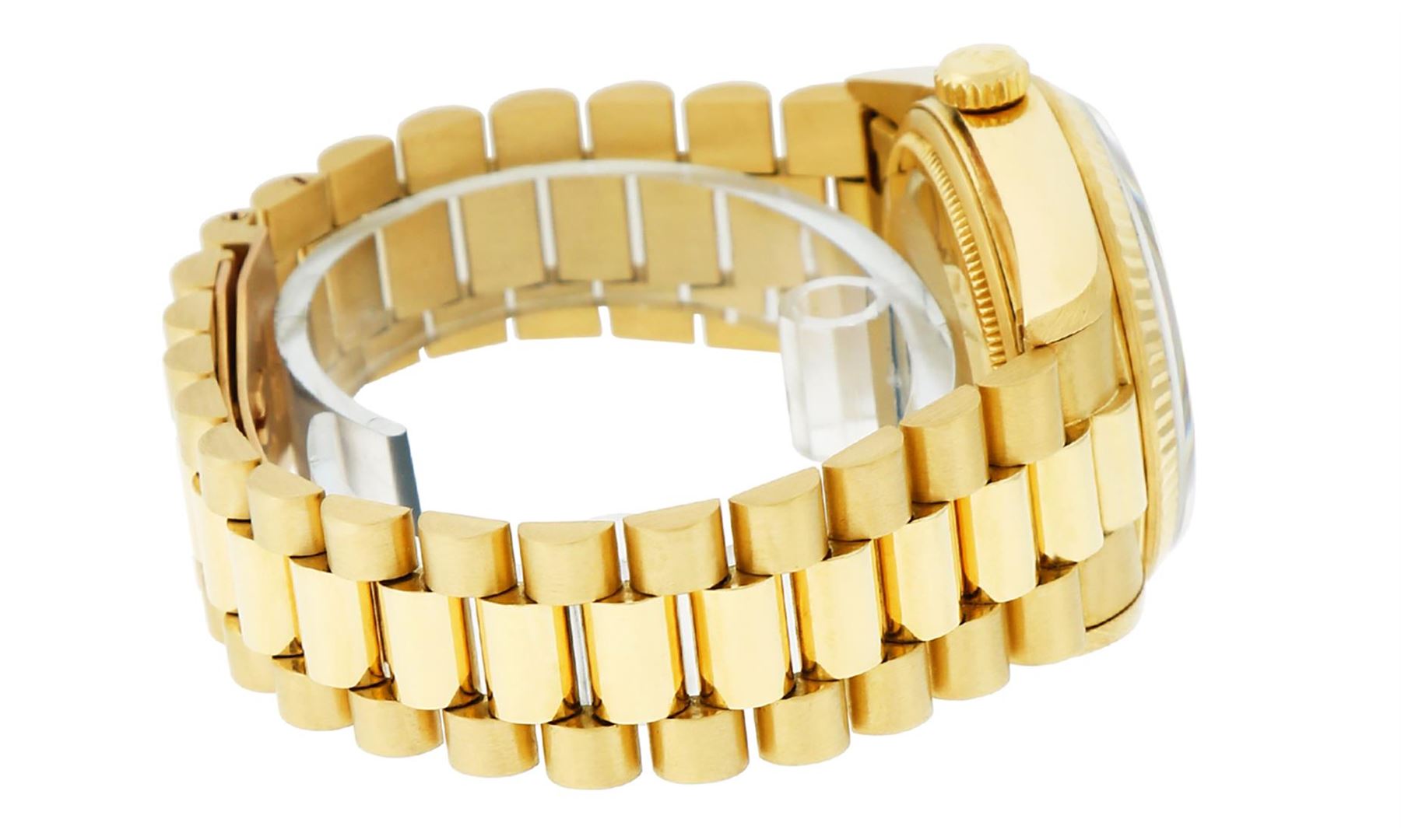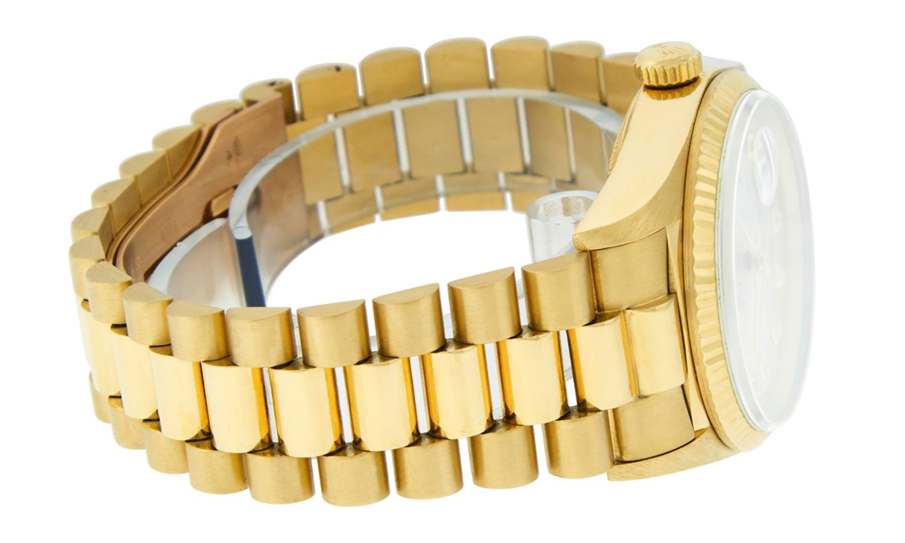 One Mens Pre Owned Quickset Rolex Day Date 18K Yellow Gold Presidential Polished, Serviced & Electronically Tested, Rolex 18K Yellow Gold Case: 36mm, Rolex 18K Yellow Gold Crown, Rolex Bezel: 18K Yellow Gold Fluted Bezel. Custom Crystal: New Scratch Resistant Synthetic Sapphire Cyclops Lens. Custom Hands: New Luminescent Hands. Rolex Movement: Automatic Quickset Winding Movement Caliber 3055. Custom Dial: Refinished To Silver With Custom Added Genuine Single Cut Diamonds, Diamond Count: 10 Diamonds On Dial, Color: G To H, Clarity: SI-VS. Date Window: 3 O'Clock Position, Day Display: 12 O'Clock Position, Single Quickset, Model: Day Date President. Condition: G-6 Extra Fine. Rolex Bracelet: 18K Yellow Gold President Band With Hidden Clasp, Bright & Satin Polish. 7.0 Inch Length, Standard President Clasp, With Rolex Logo.