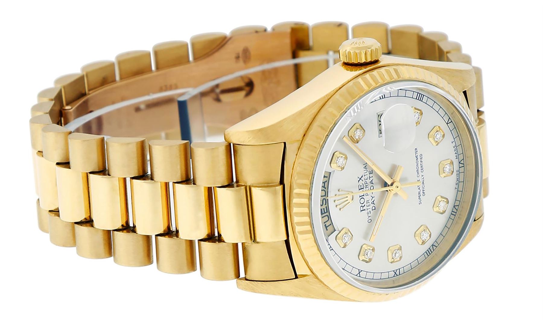 One Mens Pre Owned Quickset Rolex Day Date 18K Yellow Gold Presidential Polished, Serviced & Electronically Tested, Rolex 18K Yellow Gold Case: 36mm, Rolex 18K Yellow Gold Crown, Rolex Bezel: 18K Yellow Gold Fluted Bezel. Custom Crystal: New Scratch Resistant Synthetic Sapphire Cyclops Lens. Custom Hands: New Luminescent Hands. Rolex Movement: Automatic Quickset Winding Movement Caliber 3055. Custom Dial: Refinished To Silver With Custom Added Genuine Single Cut Diamonds, Diamond Count: 10 Diamonds On Dial, Color: G To H, Clarity: SI-VS. Date Window: 3 O'Clock Position, Day Display: 12 O'Clock Position, Single Quickset, Model: Day Date President. Condition: G-6 Extra Fine. Rolex Bracelet: 18K Yellow Gold President Band With Hidden Clasp, Bright & Satin Polish. 7.0 Inch Length, Standard President Clasp, With Rolex Logo.