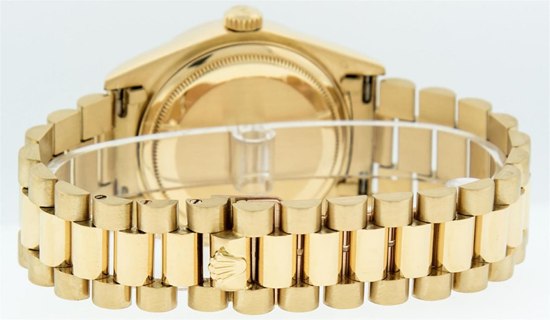 One Mens Quickset Rolex Day Date 18K Yellow Gold President Polished, Serviced & Electronically Tested, 18K Yellow Gold Case: 36mm, 18K Yellow Gold Crown, Bezel: 18K Yellow Gold Fluted Bezel. Custom Crystal: New Scratch Resistant Synthetic Sapphire Cyclops Lens. Custom Hands: New Luminescent Hands. This Watch Has Been Serviced Time Tested And Is In Excellent Condition It Is Free Of All Scratches And Dents. Movement: Automatic Quickset Winding Movement Caliber 3055. Custom Dial: Silver Index With Roman Track & Lumi Dots. Date Window: 3 O'Clock Position, Day Display: 12 O'Clock Position, Single Quickset, Model: Day Date President. Condition: G-6 Extra Fine. Bracelet: 18K Yellow Gold President Band With Hidden Clasp, Bright & Satin Polish. 7.0 Inch Length, Standard President Clasp, With Rolex Logo. This Watch Comes With A Rolex Box.