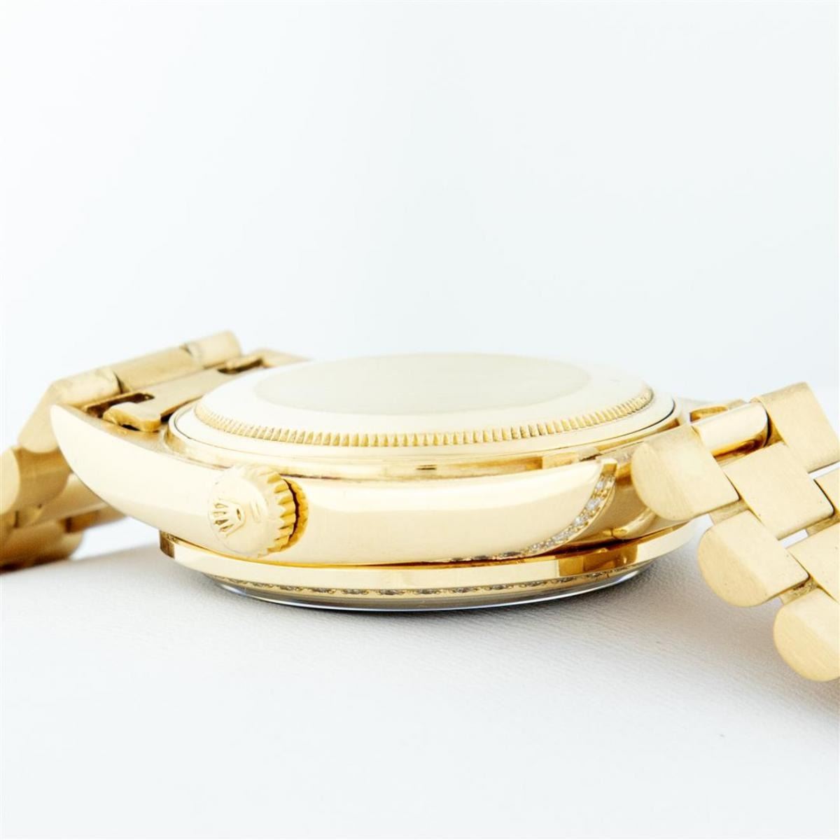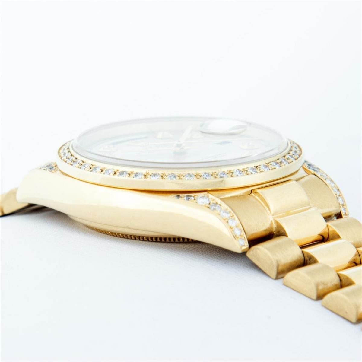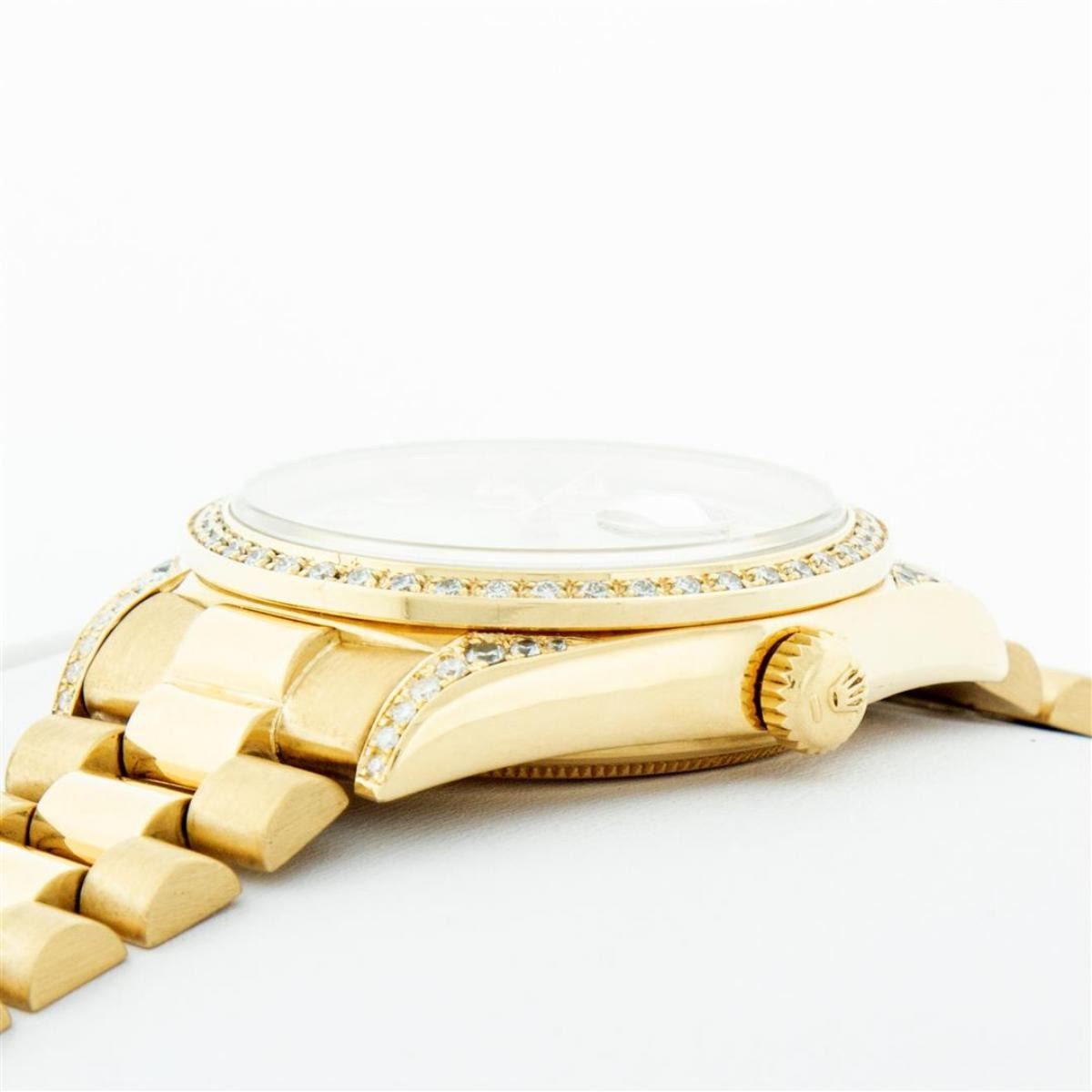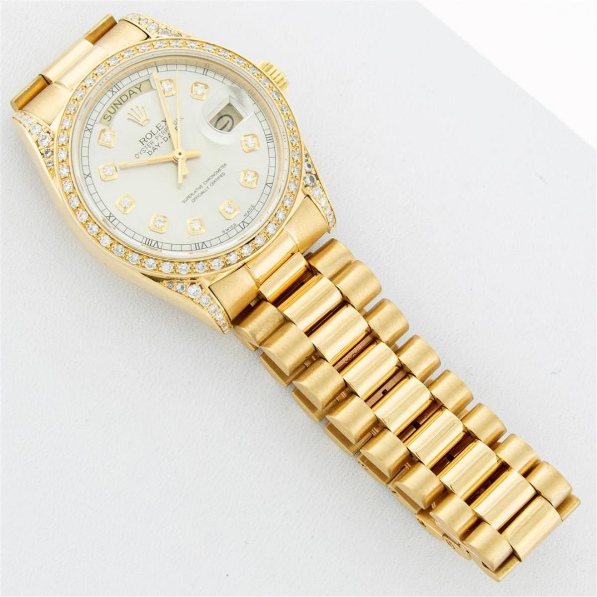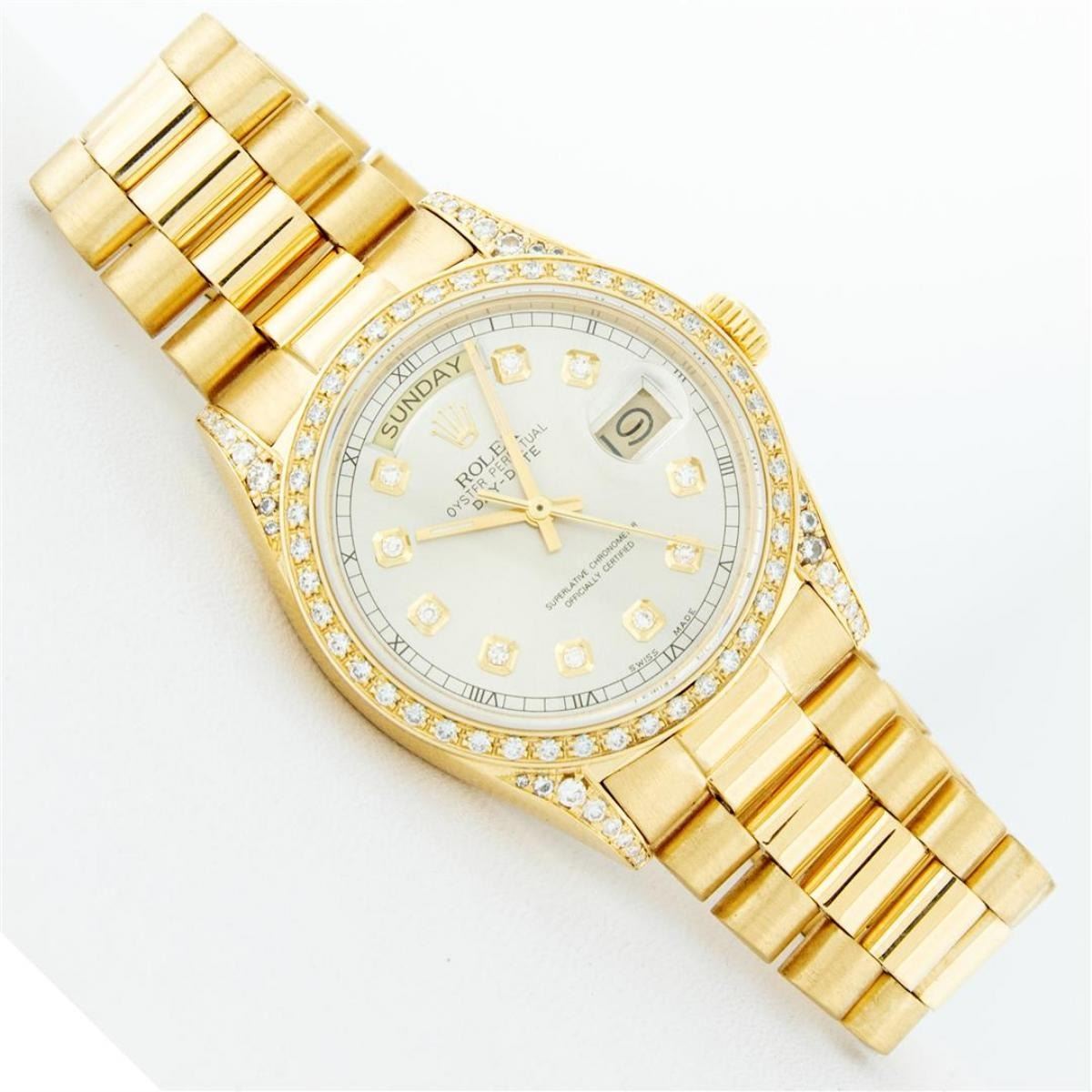 One Mens Rolex Day Date 18K Yellow Gold President Polished, Serviced & Electronically Tested, 18K Yellow Gold Case: 36mm, Custom Diamond Lugs: 28 Diamonds On Lugs, Color: G to H, Clarity: SI-VS. 18K Yellow Gold Crown, Custom Bezel: 18K Yellow Gold Beadset Diamond Bezel, Diamond Count: 44 Diamonds On Bezel. Total Weight 1.00 Carat, Clarity: SI-VS, Color: G to H. Custom Crystal: New Synthetic Sapphire Cyclops Lens. Custom Hands: New Luminescent Hands. Movement: Automatic Winding Movement Caliber 3055. Custom Dial: Refinished Single Silver Diamond Dial With Roman Track, Diamond Count: 10 Diamonds On Dial, Color: G to H, Clarity: SI-VS. Date Window: 3 O'Clock Position Date Display, Day Window: 12 O'Clock Position Date Display. Quickset, Model: Day Date President. Condition: G-6 Extra Fine The Watch Is In Very Good Condition Free Of All Scratches And Dents. Bracelet: 18K Yellow Gold President Band. Bright Polish. 7.0 Inch Length, Standard Hidden President Clasp President Band, With Rolex Logo. This Watch Comes With A Rolex Box.