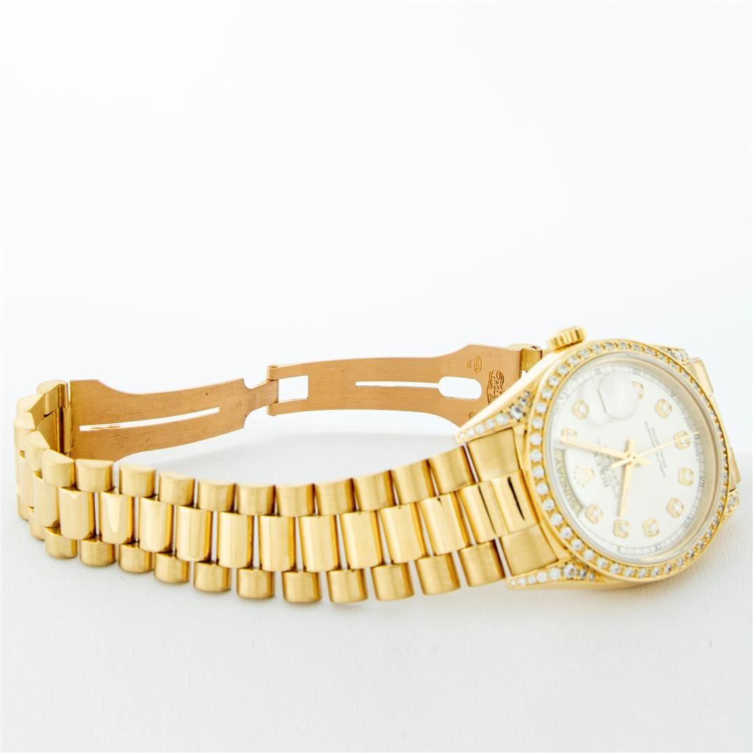 One Mens Pre Owned Rolex Day Date 18K Yellow Gold President Polished, Serviced & Electronically Tested, 18K Yellow Gold Case: 36mm, Custom Diamond Lugs: 28 Diamonds On Lugs. 18K Yellow Gold Crown, Custom Bezel: New 18K Yellow Gold Beadset Diamond Bezel, Diamond Count: 44 Diamonds On Bezel. Custom Crystal: New Sapphire With Date Window. Custom Hands: New Luminescent Hands. Rolex Movement: Automatic Winding Movement Caliber 3055. Custom Dial: Refinished To Single Silver With Custom Added Diamonds, Diamond Count: 10 Diamonds On Dial. Date Window: 3 O'Clock Position Date Display, Day Window: 12 O'Clock Position Date Display. Quickset, Model: Day Date President. Condition: G-6 Extra Fine The Watch Is In Very Good Condition Free Of All Scratches And Dents. Rolex Bracelet: 18K Yellow Gold President Band. Bright Polish. 7.0 Inch Length, Standard Hidden President Clasp President Band, With Rolex Logo.