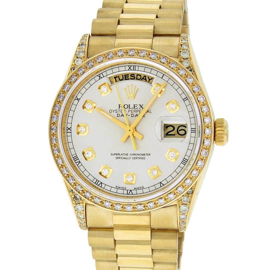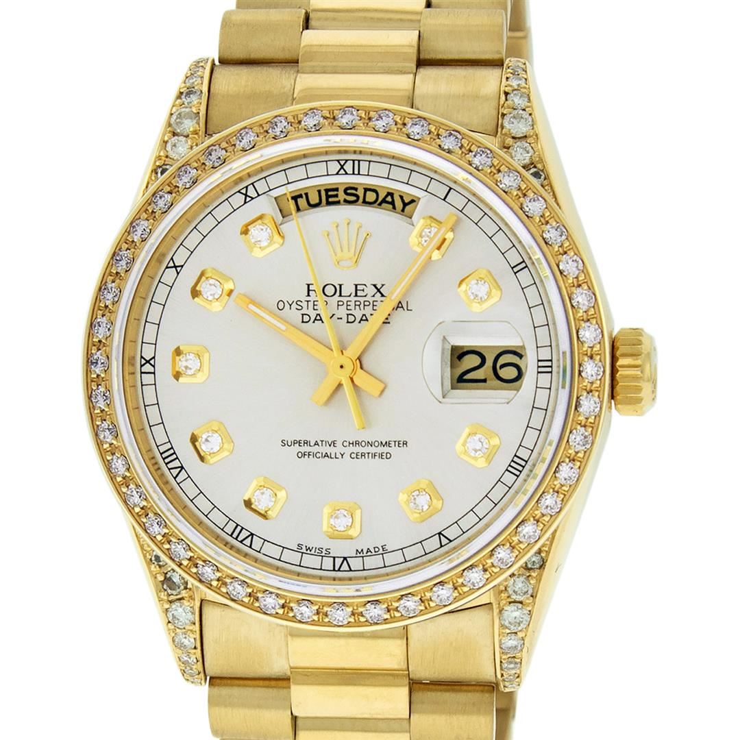One Mens Pre Owned Rolex Day Date 18K Yellow Gold President Polished, Serviced & Electronically Tested, 18K Yellow Gold Case: 36mm, Custom Diamond Lugs: 28 Diamonds On Lugs. 18K Yellow Gold Crown, Custom Bezel: New 18K Yellow Gold Beadset Diamond Bezel, Diamond Count: 44 Diamonds On Bezel. Custom Crystal: New Sapphire With Date Window. Custom Hands: New Luminescent Hands. Rolex Movement: Automatic Winding Movement Caliber 3055. Custom Dial: Refinished To Single Silver With Custom Added Diamonds, Diamond Count: 10 Diamonds On Dial. Date Window: 3 O'Clock Position Date Display, Day Window: 12 O'Clock Position Date Display. Quickset, Model: Day Date President. Condition: G-6 Extra Fine The Watch Is In Very Good Condition Free Of All Scratches And Dents. Rolex Bracelet: 18K Yellow Gold President Band. Bright Polish. 7.0 Inch Length, Standard Hidden President Clasp President Band, With Rolex Logo.