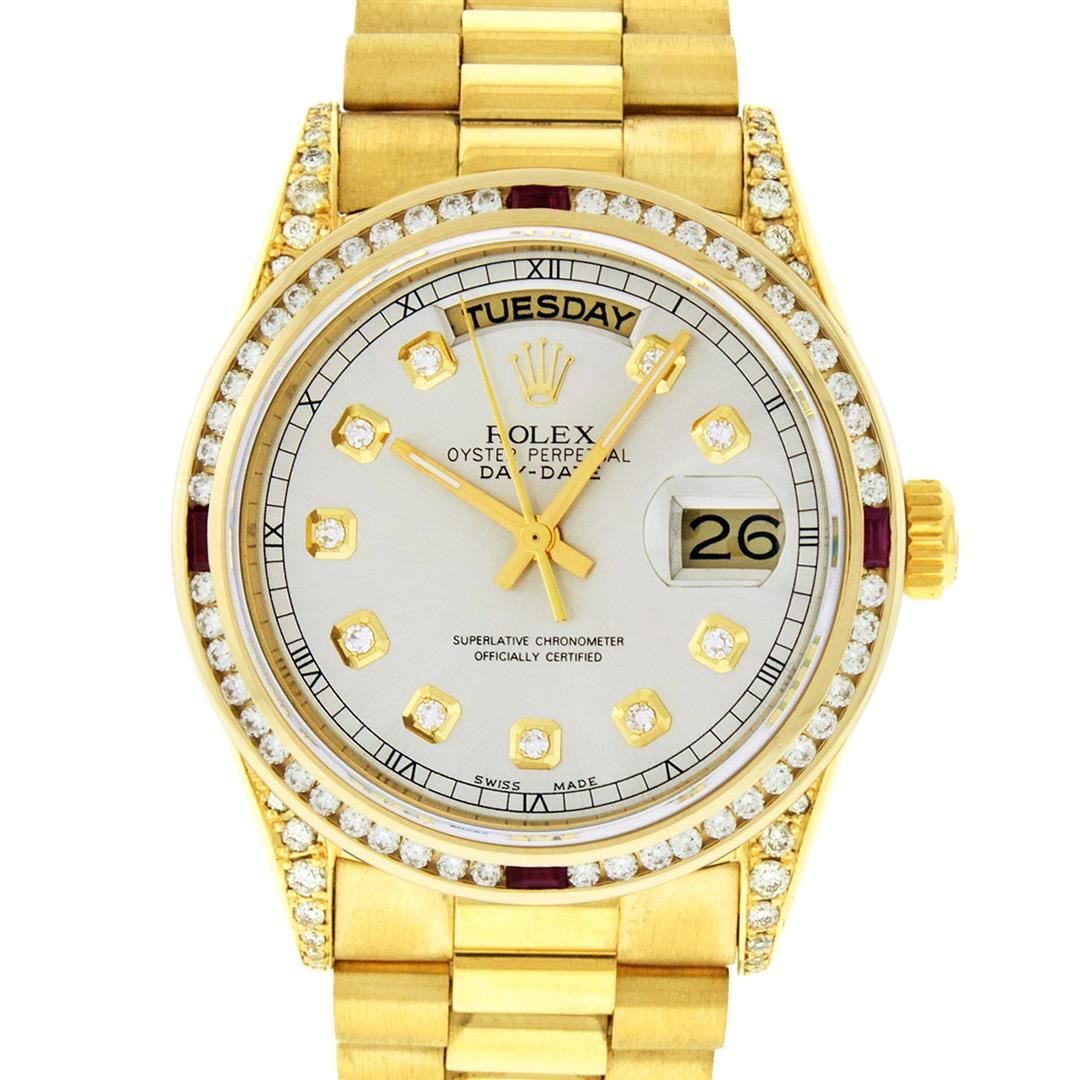 One Mens Pre Owned Rolex Day Date 18K Yellow Gold President Polished, Serviced & Electronically Tested, 18K Yellow Gold Case: 36mm, Custom Diamond Lugs: 28 Diamonds On Lugs. 18K Yellow Gold Crown, Custom Bezel: New 18K Yellow Gold Channel-set Diamond & Ruby Bezel, Diamond Count: 52 Diamonds + 4 Rubies On Bezel. Custom Crystal: New Sapphire With Magnified Date Window. Rolex Movement: Automatic Winding Movement. Custom Dial: Refinished To Silver With Custom Added Diamonds, Diamond Count: 10 Diamonds On Dial. Date Window: 3 O'Clock Position Date Display, Day Window: 12 O'Clock Position Date Display. Quickset, Model: Day Date President. Condition: G-6 Extra Fine The Watch Is In Very Good Condition Free Of All Scratches And Dents. Rolex Bracelet: 18K Yellow Gold President Band. Bright Polish. 7.0 Inch Length, Standard Hidden President Clasp President Band, With Rolex Logo.