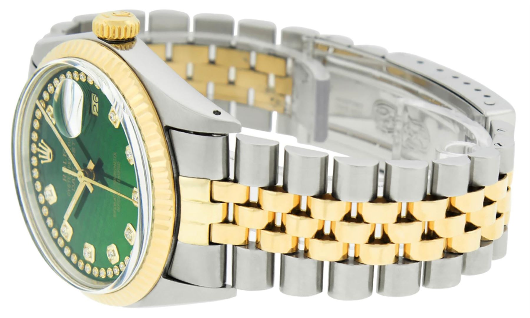 One Mens 14K Yellow Gold Two Tone Rolex Datejust Polished, Serviced & Electronically Tested, 14K Yellow Gold & Stainless Steel Case: 36mm, 14K Yellow Gold Crown, Bezel: 14K Yellow Gold Fluted Bezel. Custom Crystal: New Acrylic Cyclops Lens. Custom Hands: New Luminecent Hands. Movement: Automatic Winding Movement Caliber 3035. Custom Dial: Green String Dial Set With Diamond Hour Markers, Diamond Count: 58 Diamonds in Dial, G To H In Color, SI-VS Clarity. Date Window: 3 O'Clock Position Date Display, Quickset, Model: 16013 Datejust, Condition: G-6 Extra Fine. Bracelet: Two Tone 14K Yellow Gold & Stainless Steel Jubilee Band. Bright Polish. 7.0 Inch Length, Adjustable. Standard Clasp, With Rolex Logo. This Watch Has Been Serviced And Polished It Is Free Of All Scratches And Dents.