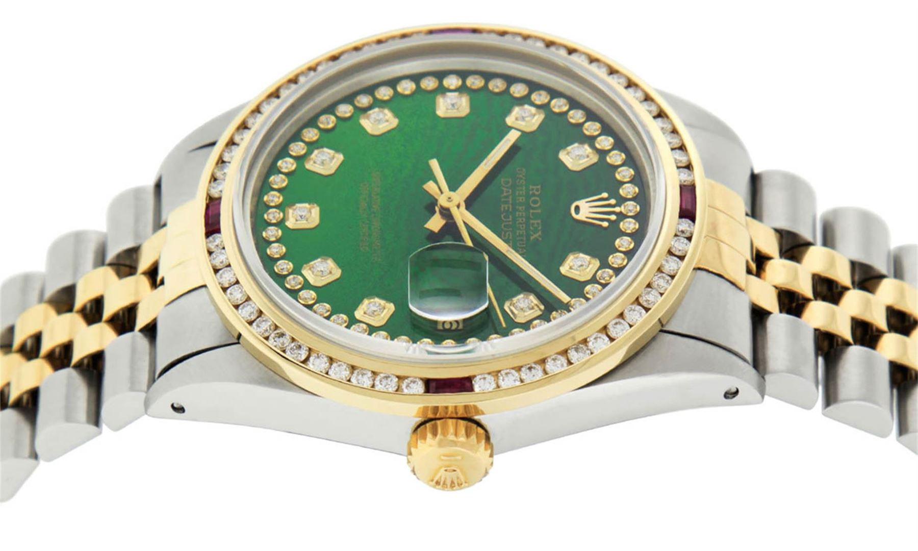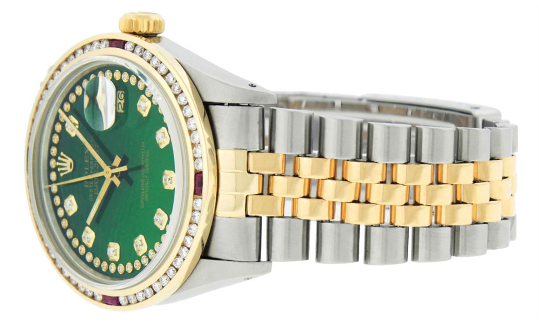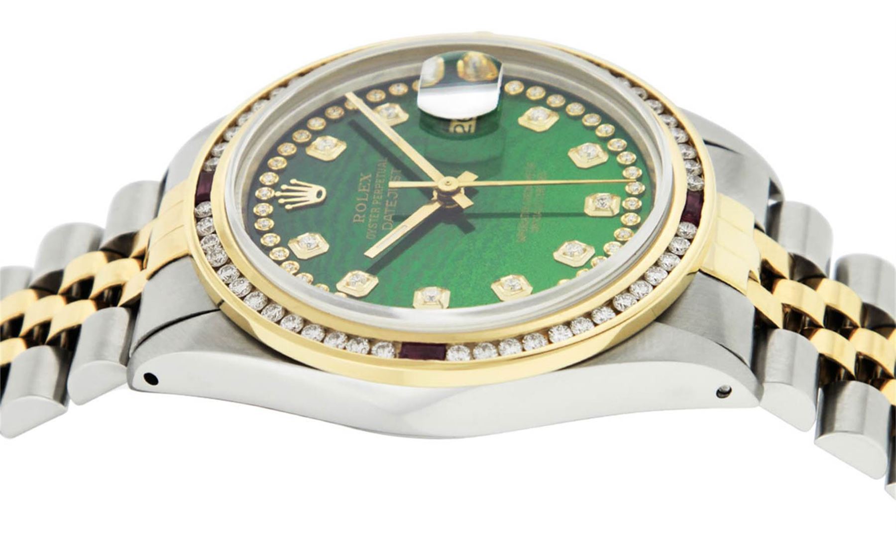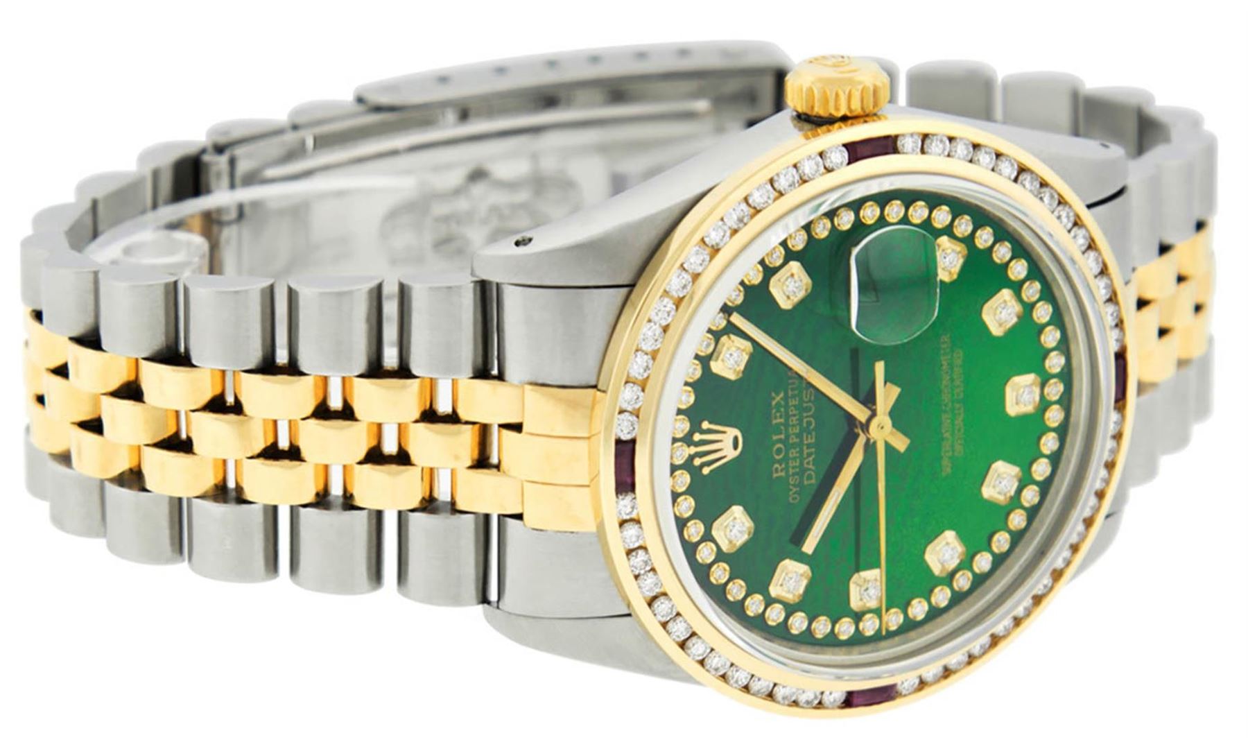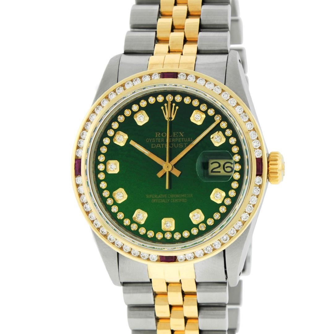 One Mens 14K Yellow Gold Two Tone Rolex Datejust Polished, Serviced & Electronically Tested, 14K Yellow Gold & Stainless Steel Case: 36mm, 14K Yellow Gold Crown, Custom Bezel: 18K Yellow Gold Ruby Channel Set Diamond Bezel, Diamond Count: 52 Diamonds + 4 Rubies, Total Weight 1.30 Carat, Clarity: SI-VS, Color: G to H. Custom Crystal: New Synthetic Sapphire Cyclops Lens. Custom Hands: New Luminecent Hands. Movement: Automatic Winding Movement Caliber 3035. Custom Dial: Green String Diamond Dial, Diamond Count: 58 Diamonds in Dial. Date Window: 3 O'Clock Position Date Display, Quickset, Model: 16013 Datejust. Condition: G-6 Extra Fine. Bracelet:Two Tone 14K Yellow Gold & Stainless Steel Jubilee. Bright Polish. 7.0 Inch Length, Adjustable. Standard Clasp, With Rolex Logo. This Watch Has Been Serviced Time Tested And Is In Excellent Condition It Is Free Of All Scratches And Dents.