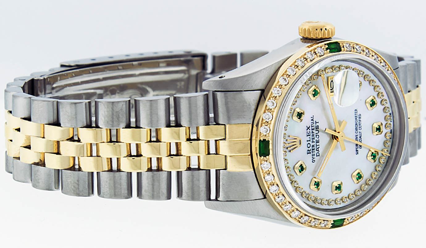 One Mens 14K Yellow Gold Two Tone Rolex Datejust Polished, Serviced & Electronically Tested, 14K Yellow Gold & Stainless Steel Case: 36mm, 14K Yellow Gold Crown, Custom Bezel: 18K Yellow Gold Synthetic Emerald Beadset Diamond Bezel, Diamond Count: 36 Diamonds + 4 Synthetic Emeralds, Total Weight 1.0 Carat, Clarity: SI-VS, Color: G to H. Custom Crystal: New Synthetic Sapphire Cyclops Lens. Custom Hands: New Luminecent Hands. Movement: Automatic Winding Movement Caliber 3035. Custom Dial: Mother Of Pearl String Diamond Dial, Diamond Count: 48 Diamonds + 10 Emeralds, Color: G to H, Clairty: SI-VS Date Window: 3 O'Clock Position Date Display, Quickset, Model: 16013 Condition: G-6 Extra Fine. Bracelet: Two Tone 14K Yellow Gold & Stainless Steel Jubilee. Bright Polish. 7.0 Inch Length, Adjustable. Standard Clasp, With Rolex Logo. This Watch Has Been Serviced Time Tested And Is In Excellent Condition It Is Free Of All Scratches And Dents.