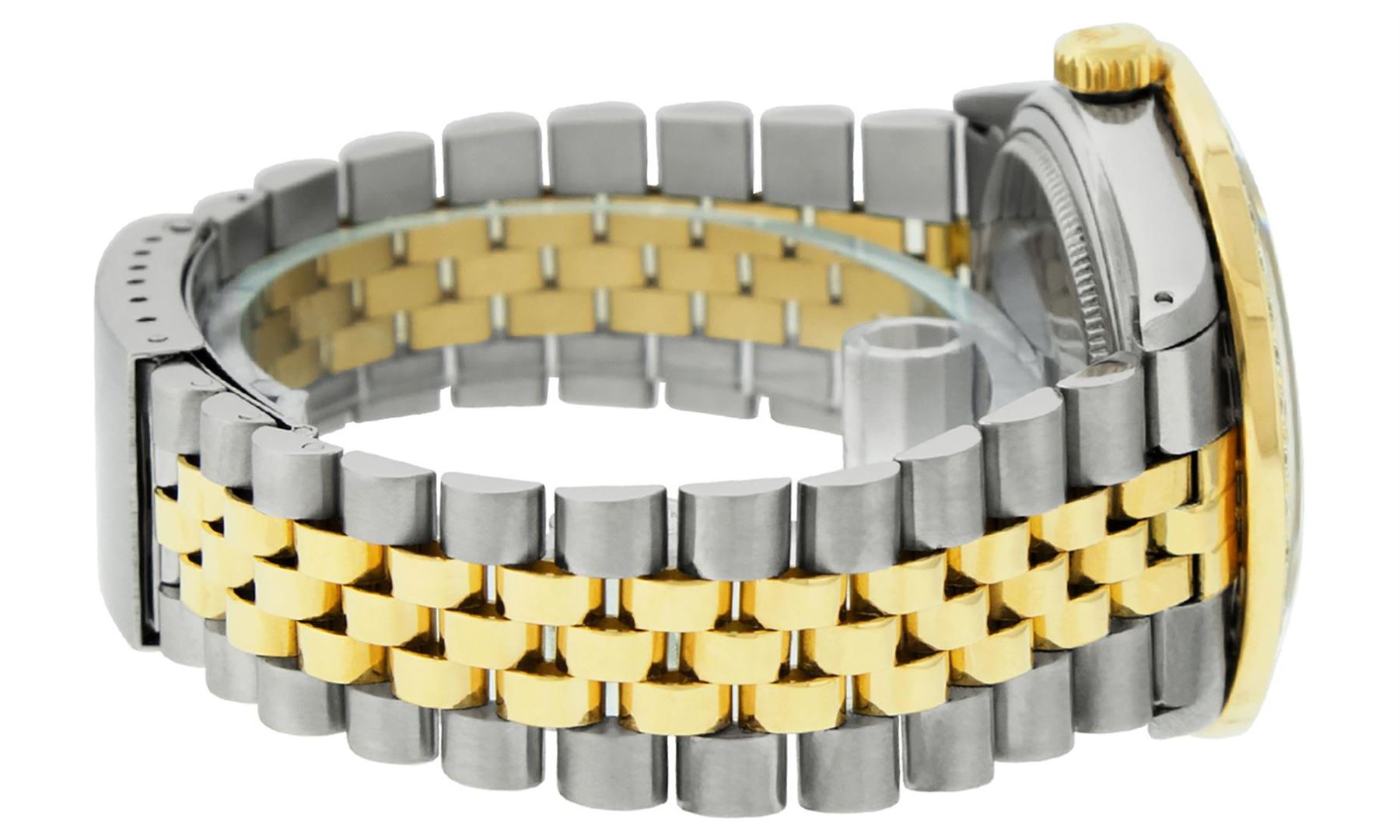 One Mens Pre Owned Yellow Gold Two Tone Rolex Datejust Polished Bright with Satin Finish, Serviced & Electronically Tested, Rolex Yellow Gold And Stainless Steel Case: 36mm, Rolex Yellow Gold Crown, Custom Bezel: New 18K Yellow Gold Bead set Diamond Bezel, Diamond Count: 40 Diamonds On Bezel, Total Weight 1.9 Carat, Clarity: SI-VS, Color: G to H. Custom Crystal: New Sapphire With Date Window. Custom Hands: New Luminescent Hands. Rolex Movement: Automatic Winding Movement. Custom Dial: Refinished To Black With Custom Added Diamonds, Diamond Count: 10 Diamonds On Dial, Dial Color: G To H In Color, Clarity: VS2-SI1. Date Window: 3 O'clock Position Date Display, Quickset, Model: Datejust. Condition: G-6 Extra Fine. Rolex Bracelet: Yellow Gold And Stainless Steel Jubilee Band. Bright Polish & Satin Finish. 7.0 Inch Length, Adjustable. Standard Clasp, With Rolex Logo. This Watch Has Been Serviced and Polished And It Is Free Of All Dents And Scratches And Has Been Time Tested.