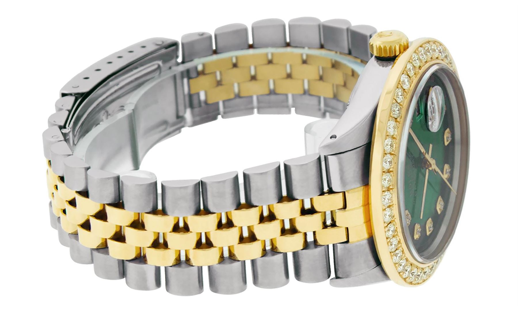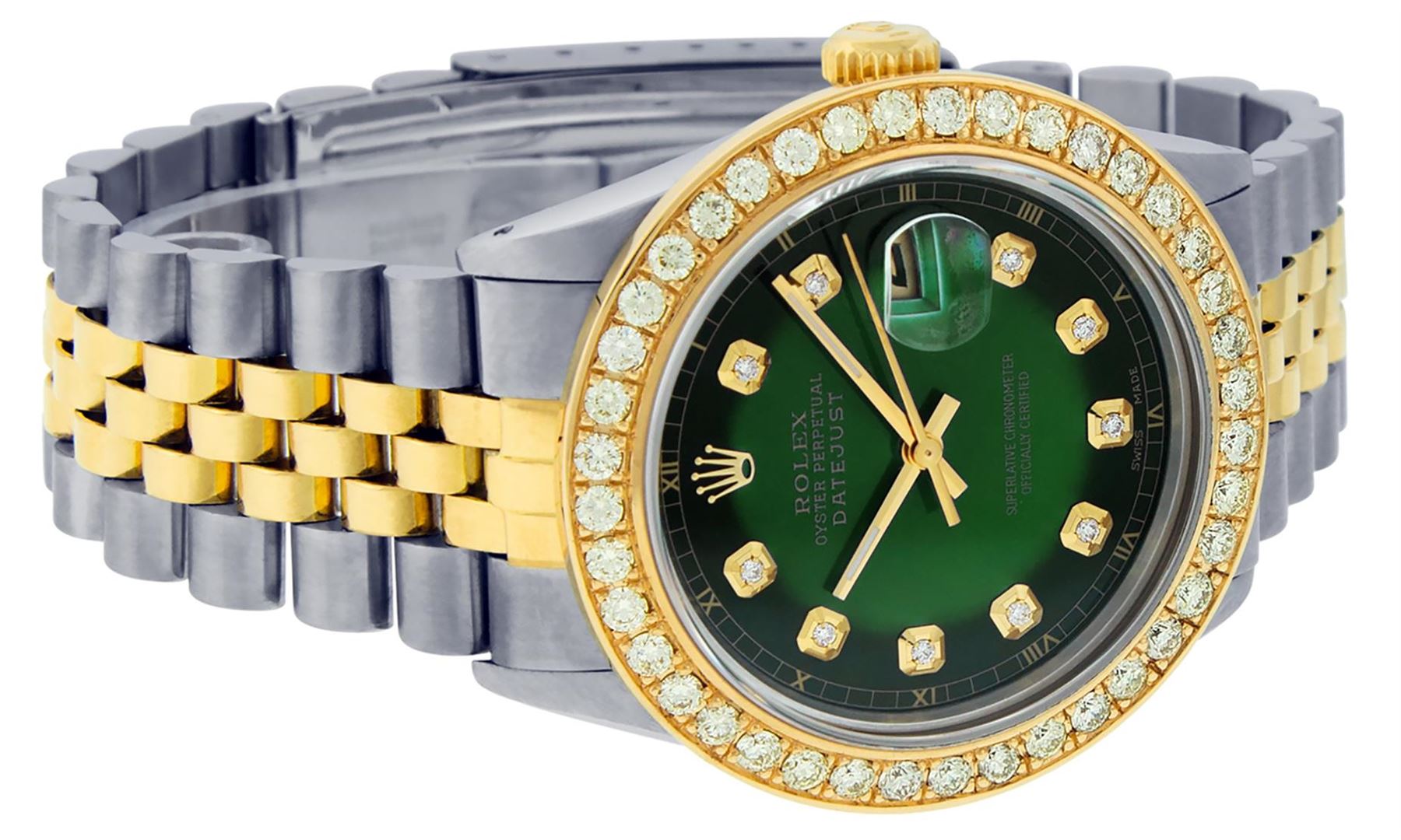 One Mens Pre Owned Yellow Gold Two Tone Rolex Polished Bright with Satin Finish, Serviced & Electronically Tested, Yellow Gold And Stainless Steel Case: 36mm, Yellow Gold Crown, Custom Bezel: New 18K Yellow Gold Bead set Diamond Bezel, Diamond Count: 40 D