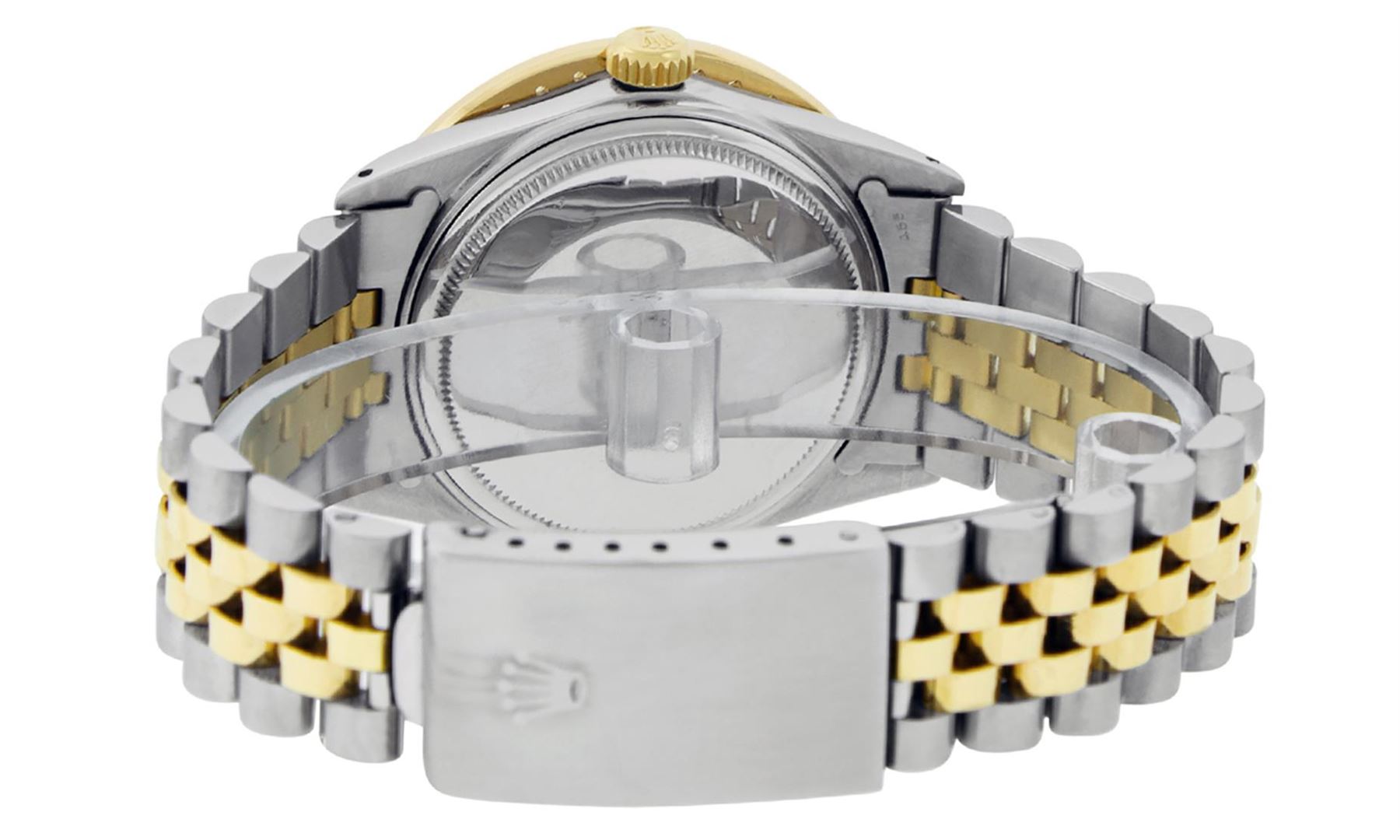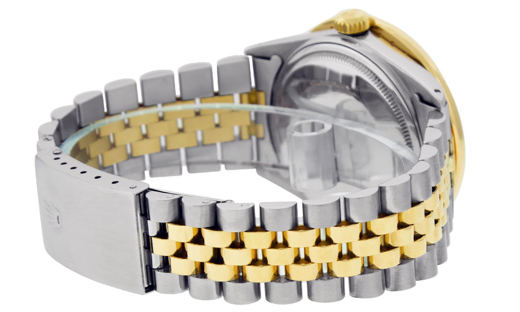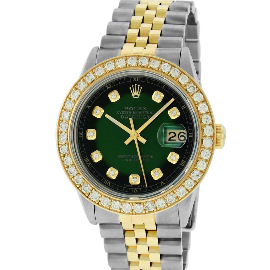 One Mens Pre Owned Yellow Gold Two Tone Rolex Polished Bright with Satin Finish, Serviced & Electronically Tested, Yellow Gold And Stainless Steel Case: 36mm, Yellow Gold Crown, Custom Bezel: New 18K Yellow Gold Bead set Diamond Bezel, Diamond Count: 40 D