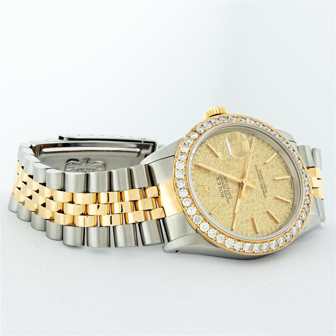 One Mens Pre Owned Yellow Gold Two Tone Rolex Datejust Polished, Serviced & Electronically Tested, Rolex Yellow Gold & Stainless Steel Case: 36mm,Rolex Yellow Gold Crown, Custom Bezel: New 18K Yellow Gold Beadset Diamond Bezel, Diamond Count: 40 Diamonds On Bezel, Total Bezel Weight 2.5 Carat, Clarity: SI-VS, Color: G to H. Custom Crystal: New Scratch Resistant Synthetic Sapphire Cyclops Lens. Custom Hands: New Luminescent Hands. Rolex Movement: Automatic Winding Movement. Rolex Dial: Champagne Jubilee Dial With Index Hour Markers and Small Track With Lumi Dots. Date Window: 3 O'Clock Position Date Display, Quickset, Model: Datejust. Condition: G-6 Extra Fine. Rolex Bracelet: Two Tone Yellow Gold & Stainless Steel Jubilee Band. Bright Polish. 7.0 Inch Length, Adjustable. Standard Clasp, With Rolex Logo. This Watch Has Been Serviced Time Tested And Is In Excellent Condition It Is Free Of All Scratches And Dents.