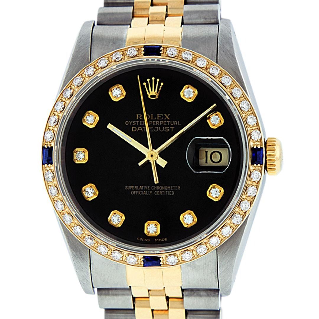 One Mens Pre Owned Yellow Gold Two Tone Rolex Datejust Polished, Serviced & Electronically Tested, Rolex Yellow Gold & Stainless Steel Case: 36mm, Rolex Yellow Gold Crown, Custom Bezel: New 18K Yellow Gold Bead set + Sapphire Diamond Bezel, Stone Count: 3