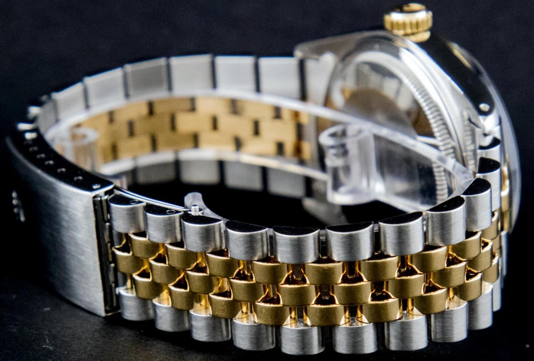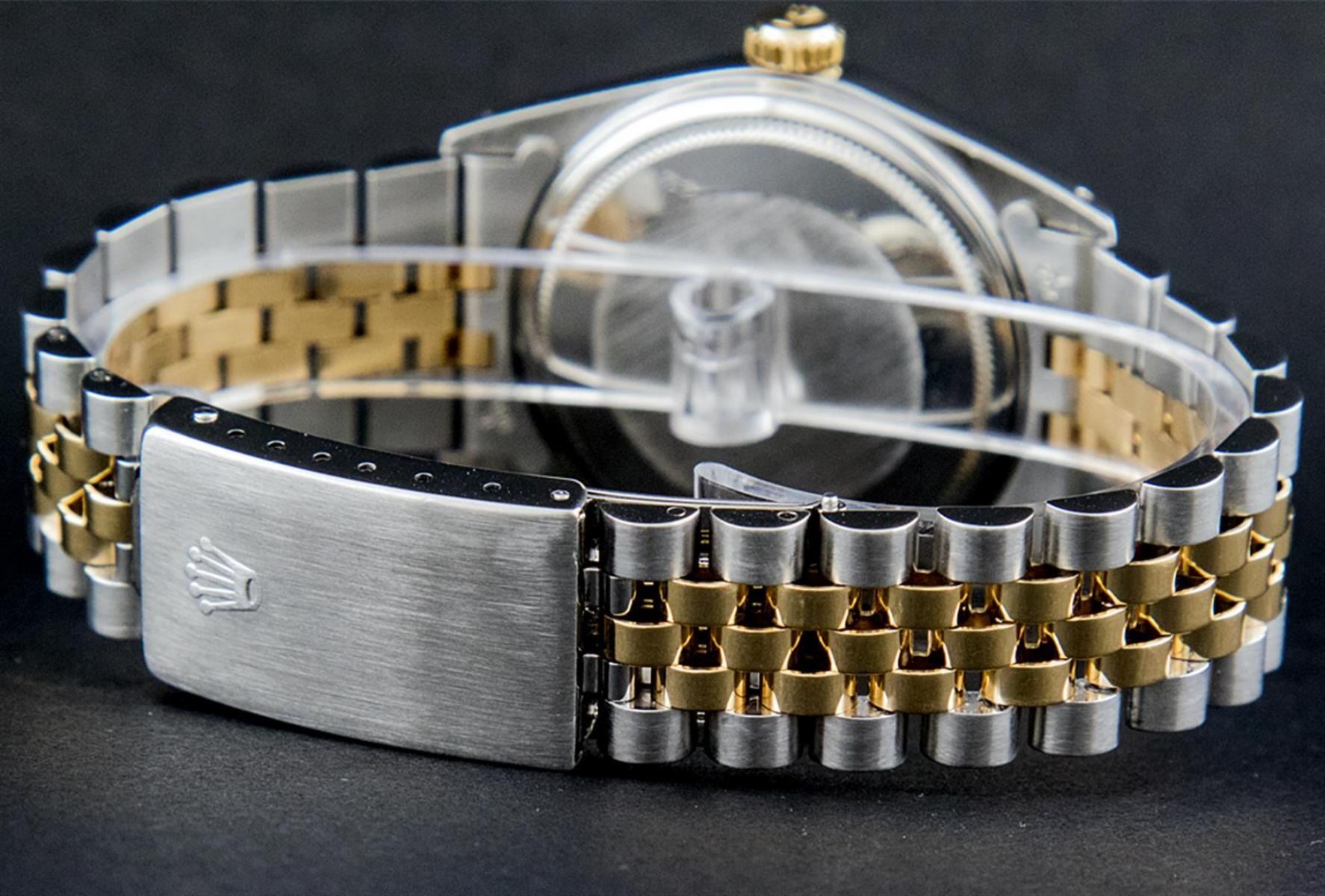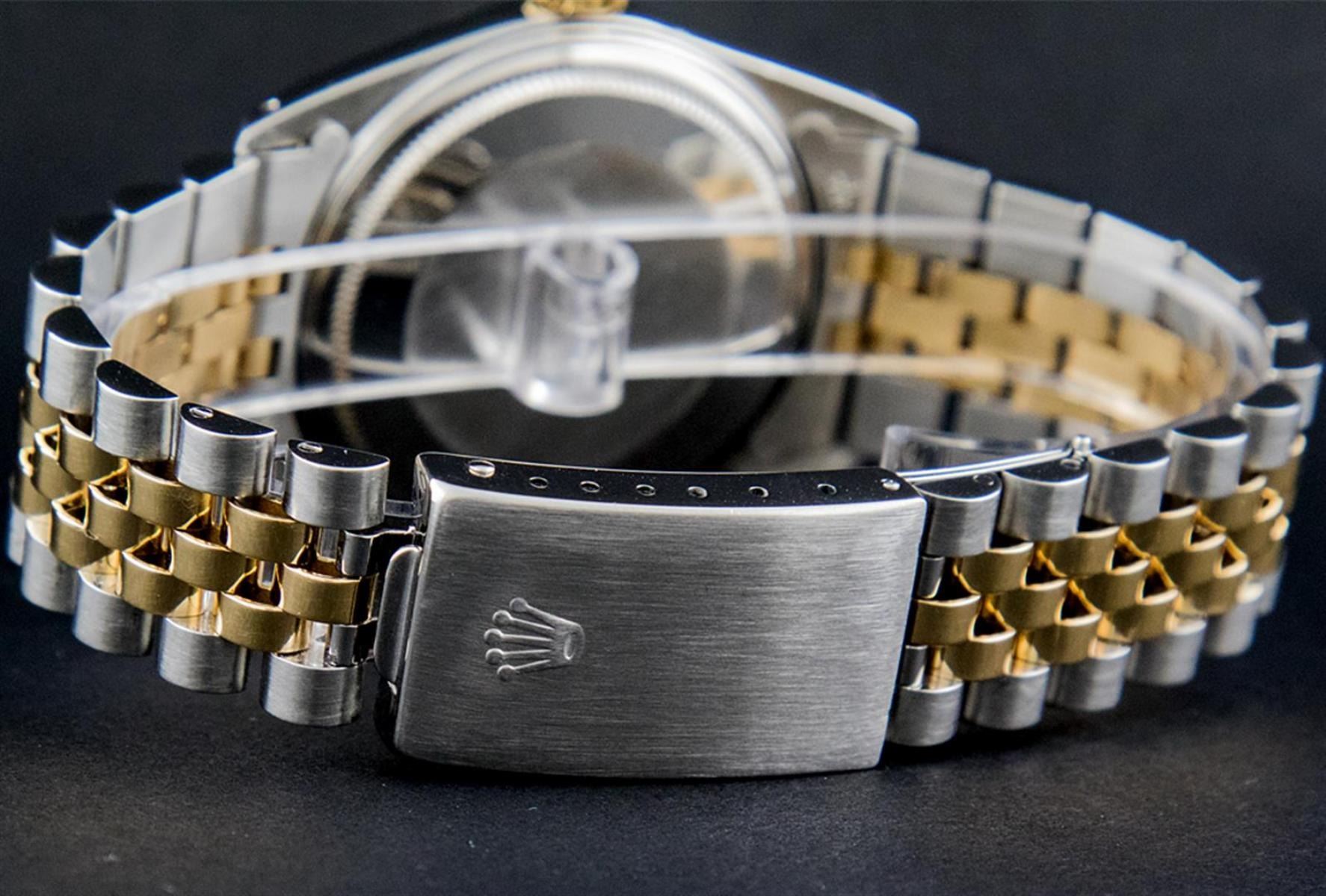 One Mens Yellow Gold Two Tone Rolex Datejust Polished, Serviced & Electronically Tested, Yellow Gold & Stainless Steel Case: 36mm, Yellow Gold Crown, Bezel: Yellow Gold Fluted Bezel. Custom Crystal: New Acrylic Cyclops Lens. Custom Hands: New Luminecent Hands. Movement: Automatic Winding Movement. Custom Dial: Black Diamond Dial, Diamond Count: 10 Diamonds In Dial, Color: G to H, Clarity: SI-VS. Date Window: 3 O'Clock Position Date Display, Quickset, Model: Condition: G-6 Extra Fine. Bracelet: Two Tone Yellow Gold & Stainless Steel Jubilee. Bright Polish. 7.0 Inch Length, Adjustable. Standard Clasp, With Rolex Logo. This Watch Has Been Serviced Time Tested And Is In Excellent Condition It Is Free Of All Scratches And Dents.
